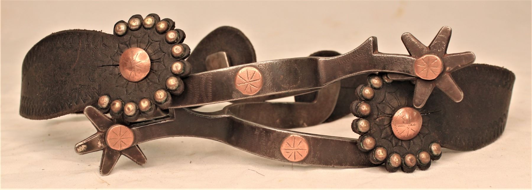 Intriguing single mounted #62-1 spurs with copper mountings and attractive straps.