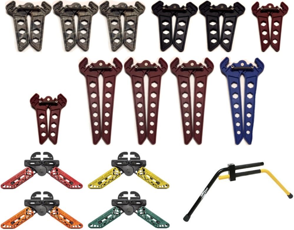 16 x Bow Stands, 11 x OMP, 3-Parallel AP, 2-Single Black, 1-Parallel Red, 1-Mathews Red, 3-Red, 1-Long Blue, 4 x Pine Ridge, 1-Red, 1-Orange, 1-Yellow, 1-Forest Green, 1 x Gas Pro Black/Yellow