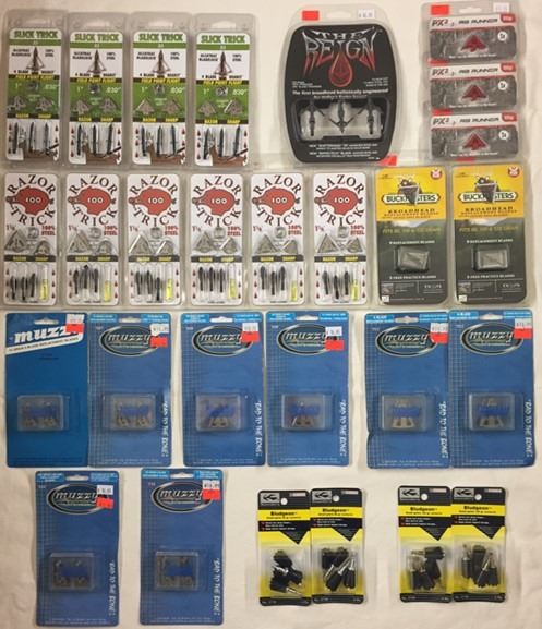 24 x Broadheads/Blades & 4 Bludgeons, 4-Slick Trick 85 Gr, 6-Razor Tricks 100 gr, 1-Reign 100 Gr, 13 x Replacement Blade, 3-PX2 Repl, 2-Buckmaster, 8 x Muzzy, 2-307, 2-309, 1-MX4-3, 2-312, 1-320, 1-MX3-3, 1-330, 4 x Bludgeons, 2-4 Pack 125 Gr, 2-4 Pack 85 Gr