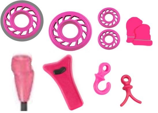 9 x Dampeners, 8 x Mathews, 1-2 pk Rubber Pink/Grey Lite, 1-2 pk 3/8" Harmonic Pink, 2-5 pk Mini Harmonic Pink, 1-2 pk String Suppressor Pink, 1-String Stop Pink, 1-String Stop (round) Pink, 1-4 pk Monkey Tails Pink, 1 x 4 pk Pine Ridges Wishbone Pink