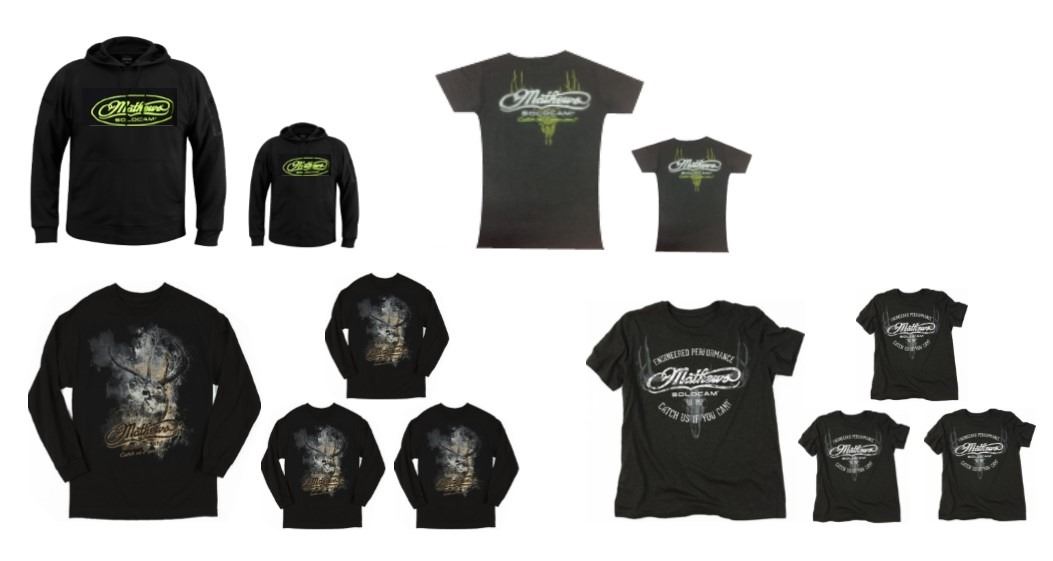 12 x Mathews Clothing, 2 x Hoodie Green Logo, 1-XL, 1-L, 10 x Shirts, 2-Charcoal Neon Green XL, 2-Elusive L, 2-Elusive XL, 2-Outfitter M, 2-Outfitter L