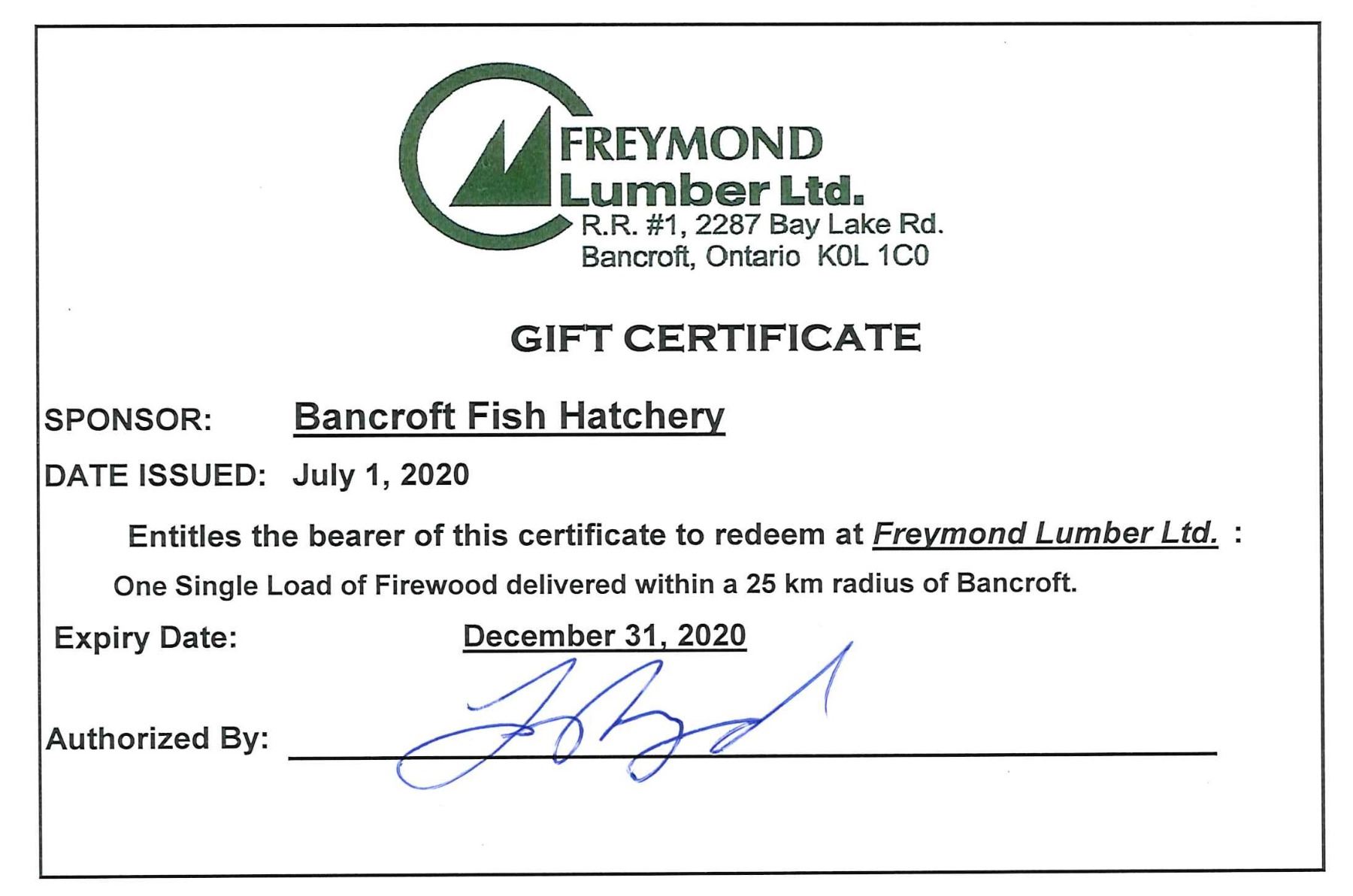LOAD OF FIREWOOD LOGS. THIS IS ONE SINGLE LOAD OF FIREWOOD THAT CAN BE DELIVERED WITHIN A 25KM RADIUS OF BANCROFT ONTARIO. THE EXPIRY DATE FOR THIS CERTIFICATE IS DEC 31, 2020. THIS LOAD OF LOGS HAS BEEN GENEROUSLY DONATED BY FREYMOND LUMBER OF BANCROFT ONTARIO.