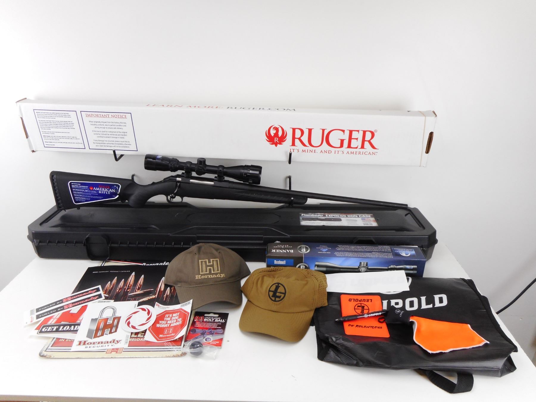 RAFFLE, TICKETS ARE $ 25.00 EACH, ONLY 100 TICKETS WILL BE SOLD. DON'T BID MORE THEN $ 25.00. INSTEAD PLEASE BID ON THE NEXT AVAILABLE LOT. THANK YOU FOR YOUR PARTICIPATION. PLEASE NOTE WHEN WE SELL THE TICKET TO YOU ON ICOLLECTOR, IT WILL SAY "YOU WON" THIS IS THEIR TERMINOLOGY. THIS MEANS THAT YOU "WON" THE TICKET, NOT THE FIREARM. ALL OF THE "WINNING TICKETS" ARE ENTERED INTO A DRAW FOR THE PRIZE. THE DRAW WILL TAKE PLACE ON SUNDAY JULY 19TH. THE WINNER WILL BE ANNOUNCED IN THE EMAIL THAT WE SEND WITH YOUR INVOICE. THIS ITEM IS A NEW IN THE BOX, RUGER, AMERICAN, 308 WIN CALIBER RIFLE COMES WITH A FLAMBEAU PLASTIC CASE . A BUSHNELL BANNER 3-9 X 40MM SCOPE. TWO CAPS, ONE IS A HORNADY, ON IS A LEUPOLD, ASSORTED STICKERS AND DECALS AS WELL AS A METAL HORNADY WALL HANGING. THE RIFLE, BAG, CAPS, AND DECALS BEEN GENEROUSLY DONATED BY SWITZER'S AUCTION. THE SCOPE HAS BEEN GENEROUSLY DONATED BY CHESHER'S OUTDOOR STORE OF BANCROFT ONTARIO. THE CASE HAS BEEN GENEROUSLY DONATED BY PAUL SWITZER.