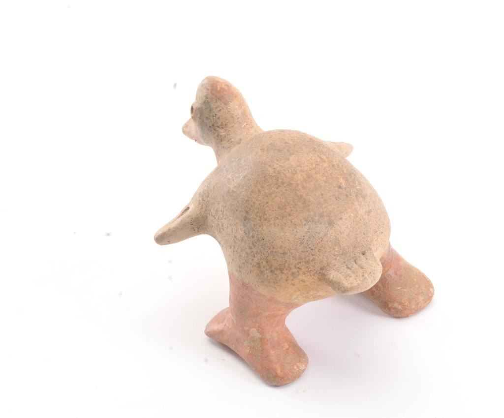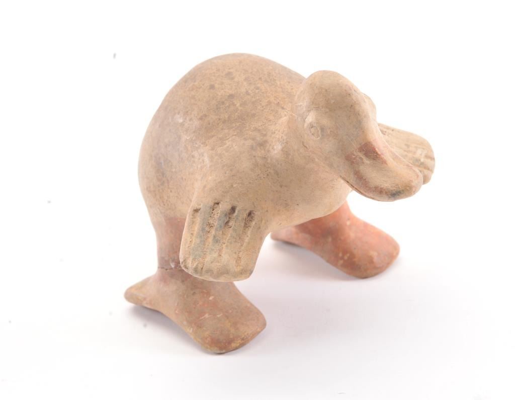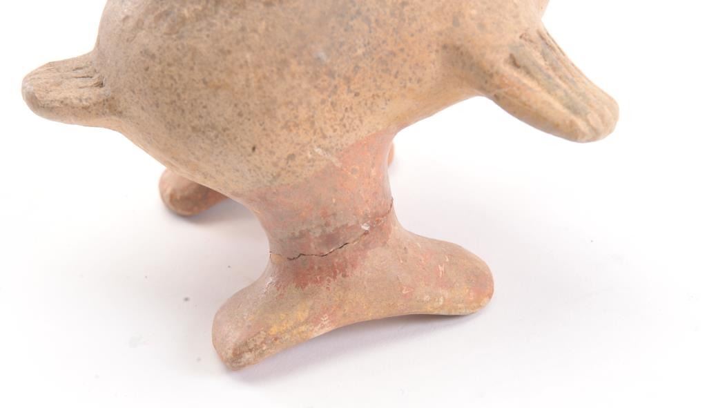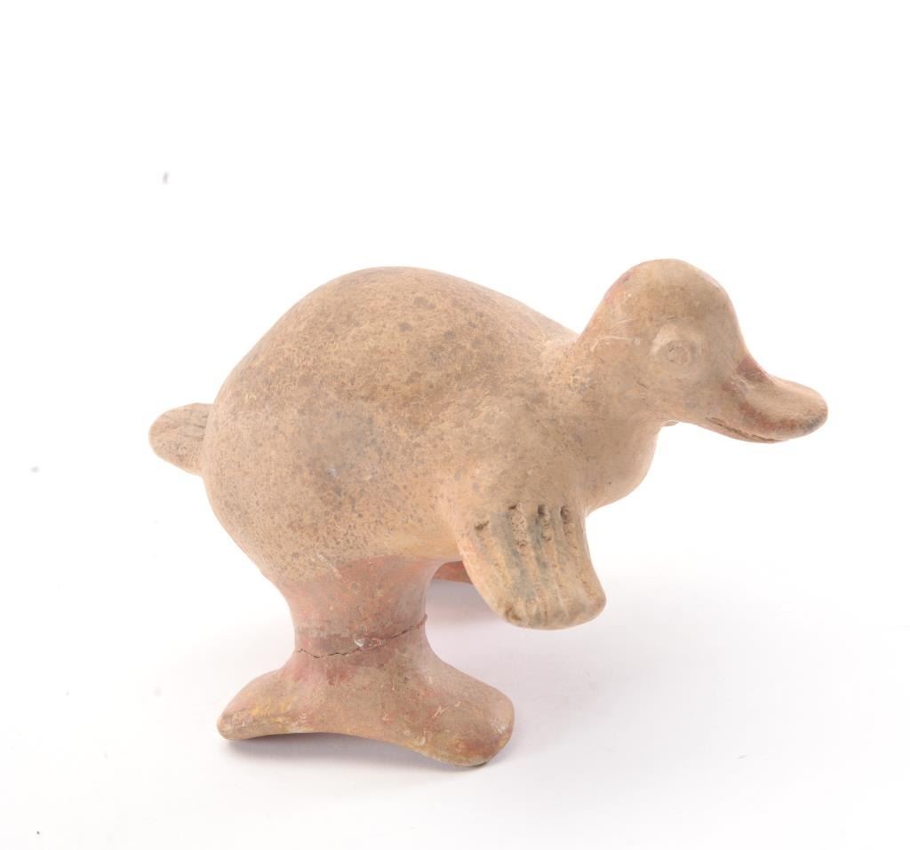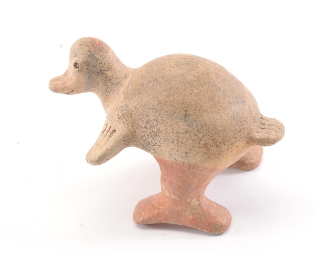 A genuine and rare Pre-Columbian Colima figure of a duck. More than 1000 years old. Beautifully modeled with some original red glaze. Measures 7 1/2" long and 5" high. The condition is fine with one repair to theright foot. A rare piece. Est.: $400-$600