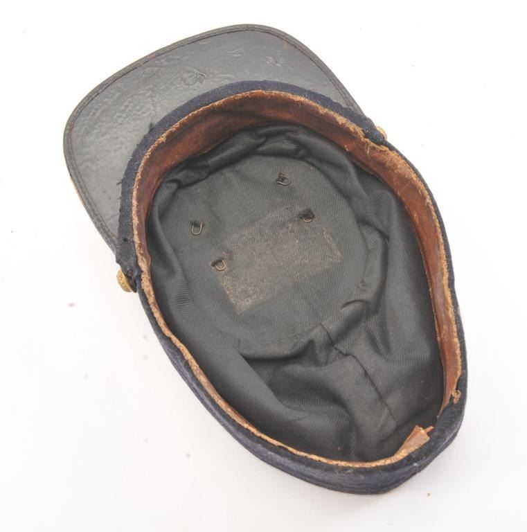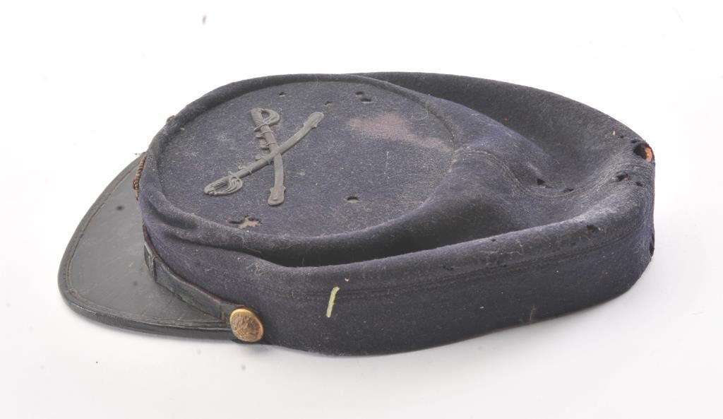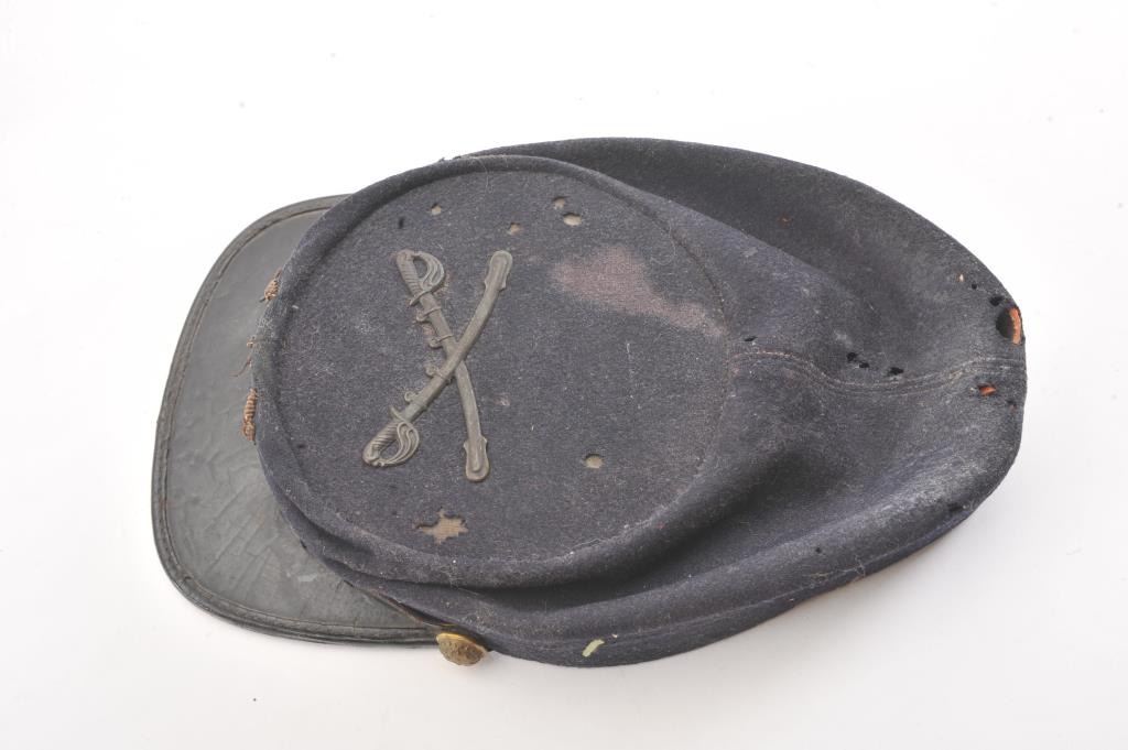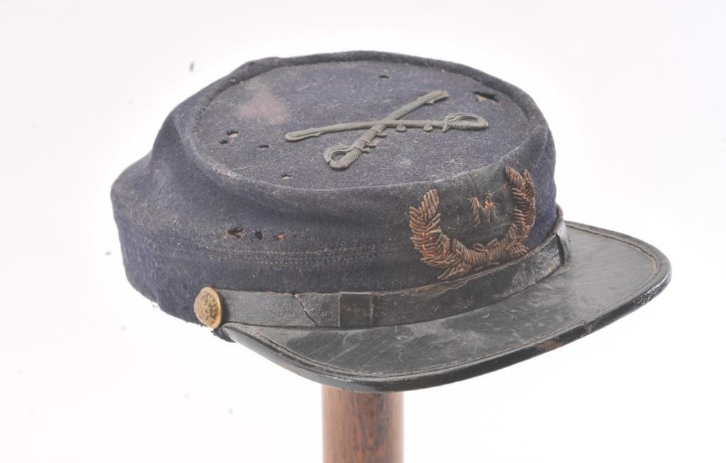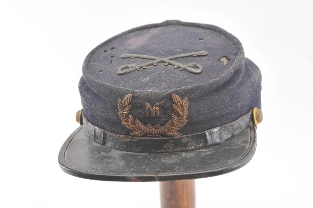 Model 1872 Cavalry Officer Kepi with M and wreaths at the front. Buttons and straps. Some moth holes. Outline of maker’s label. Liner intact and sweat band. Est.: $300-$600