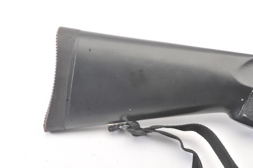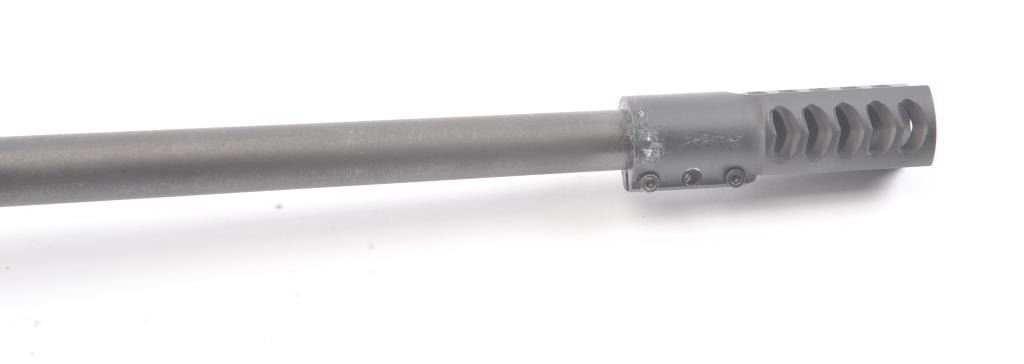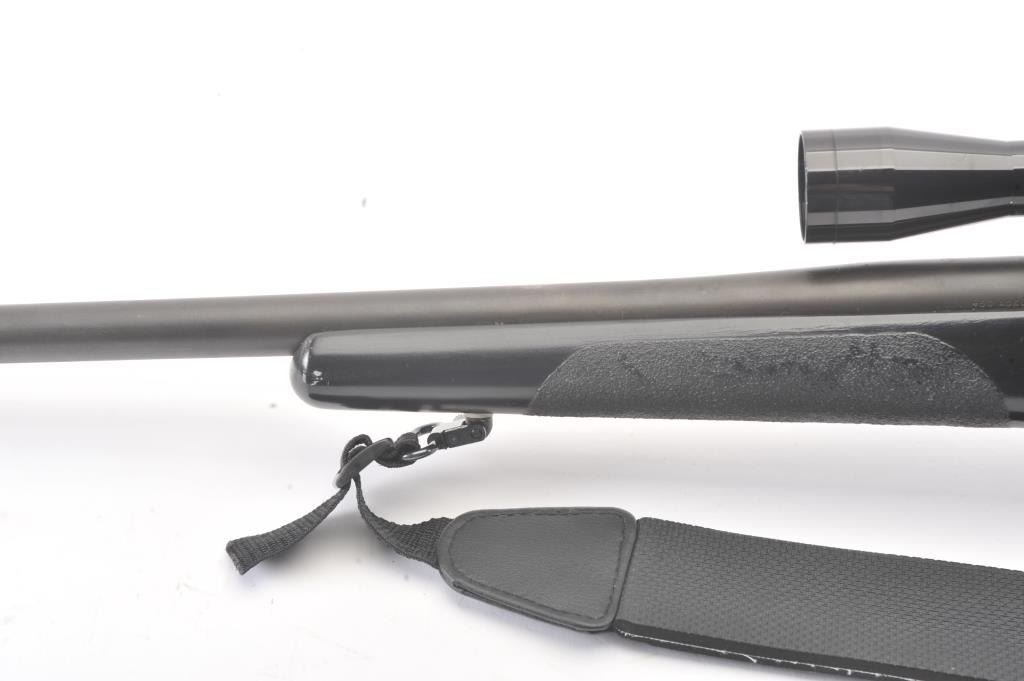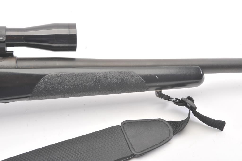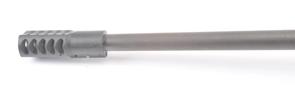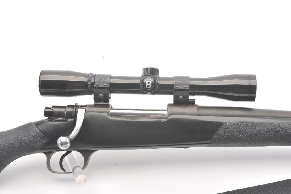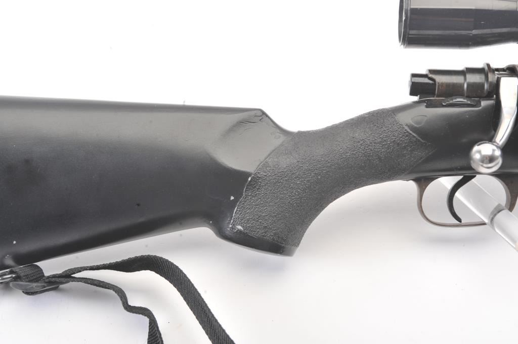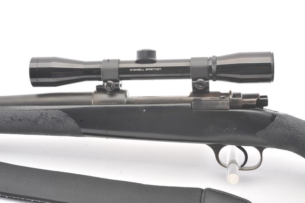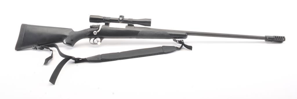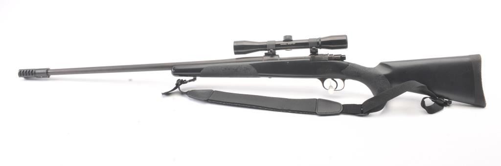 Custom Whitworth Mauser bolt action sporting rifle, .450 Ackley caliber, Serial #A307578. The rifle is in very good overall condition with a 27” custom barrel with a bolt on muzzle break. The rifle has drifted to adark patina with muted blue in the protected areas. The textured synthetic stock is in good condition with sling swivels, nylon sling and a solid rubber recoil pad providing a 14” LOP. The rifle is topped with Weaverrings and a Bushnell Sport View fixed power scope. The bore is rough showing light to moderate pitting, particularly at the throat. The markings are sharp and the action is crisp. According to the consignor, the rifle will shoot .458 Lott, .458 Winchester Magnum and .450 Ackley cartridges. Est.: $500-$1,000. (Modern).