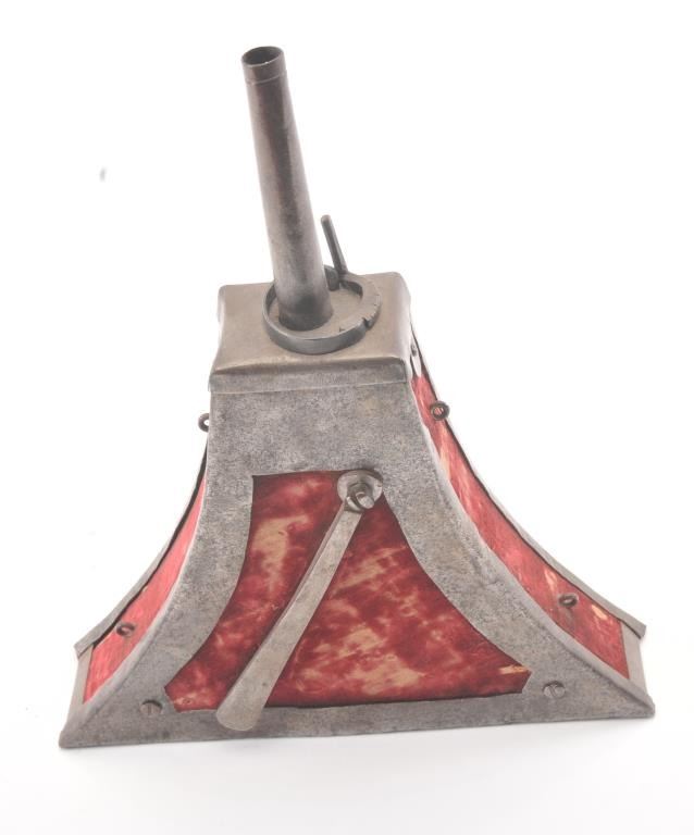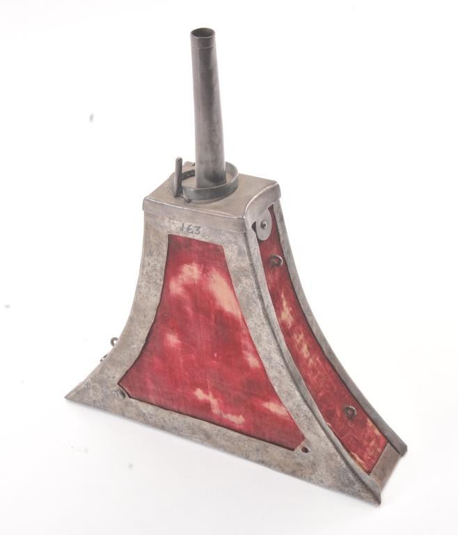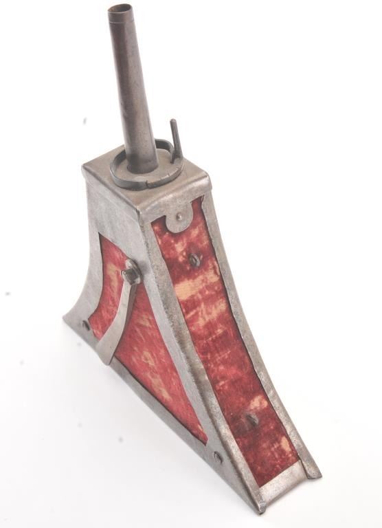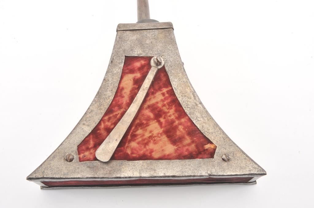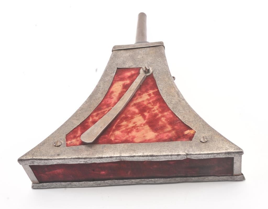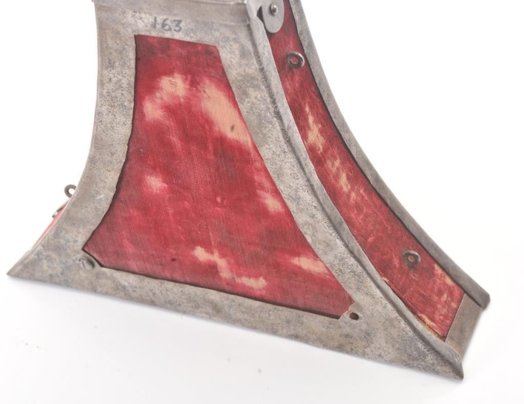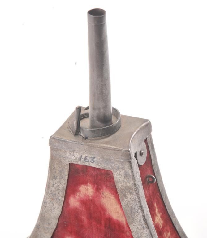16th-17th century musketeers style flask with velvet over wood triangular shaped body and forged steel mountings. Measures 11 1/2" from tip to end with a 4" spout (large charger for a musket). Measures 9 1/2" across thewidest part of the base. Scattered rust and pitting. Wear to velvet but authentic to the matchlock/wheelock era and a military or guard unit. Belt hook retained. Rings are also present (1 screw) is missing. #163 GeneHerrick flask collection. Est.: $500-$1000