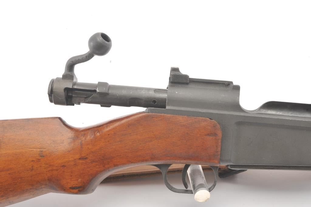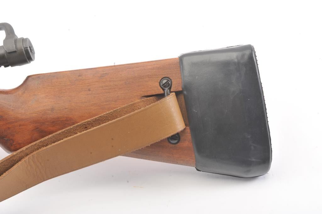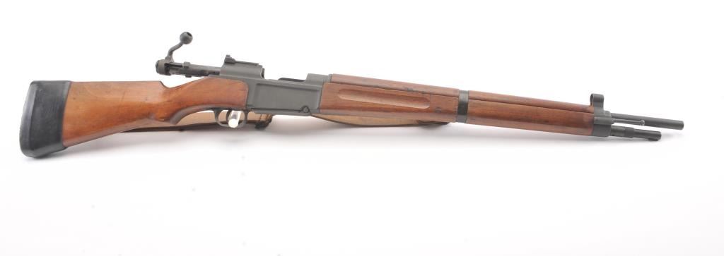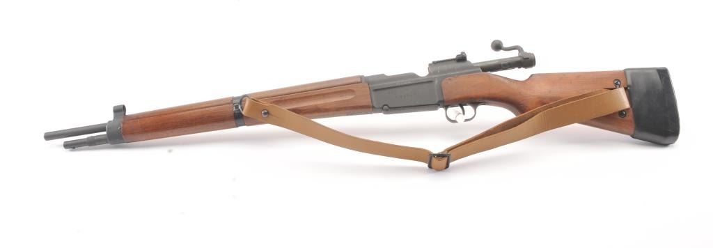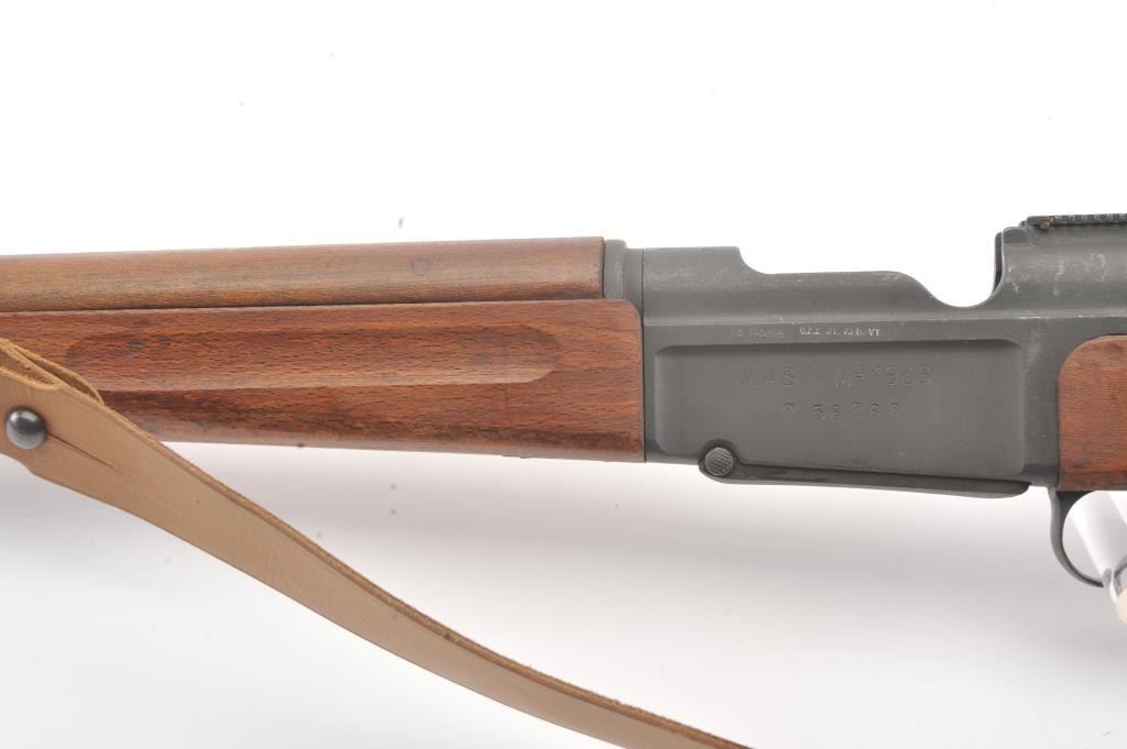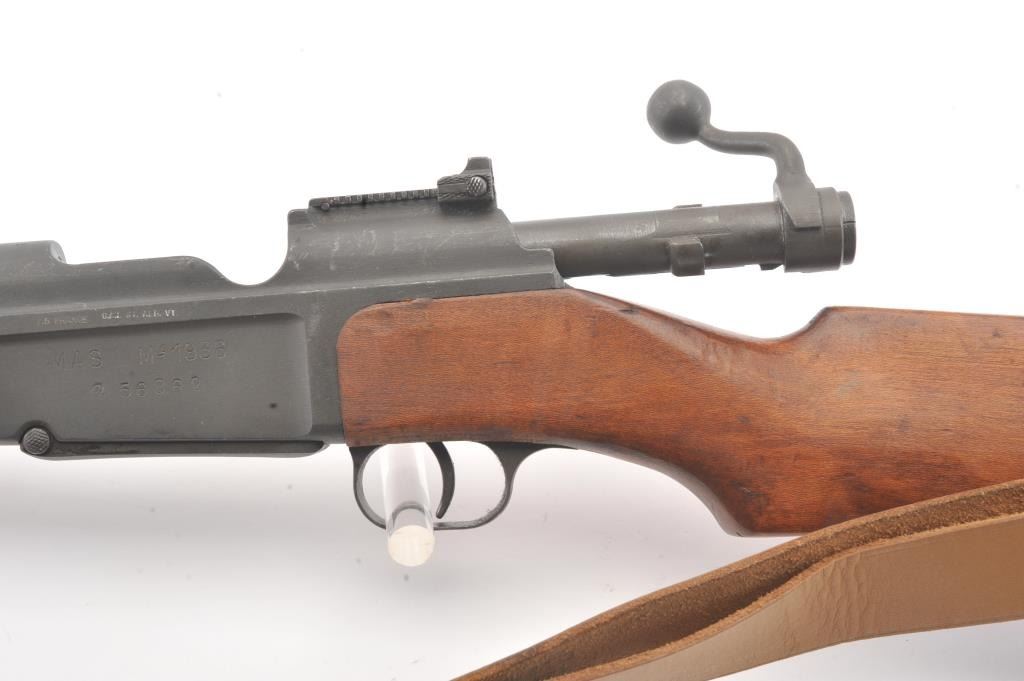 French MAS 36 bolt action rifle, 7.5 French caliber, Serial #G56862. The rifle is in very good to nearly fine overall condition with a 23” barrel. The rifle retains nearly all of the military finish with wear at themuzzle and high point edge wear consistent with service use. The left side of the receiver is import marked and dated 1936. The smooth wood stock is in very good condition with mars and bruising, a periodleather sling and slip-on rubber recoil pad. The bore is fair, the action is crisp and the markings are sharp. The lot includes 25 pieces of new brass with the Graf’s head stamp and a set of RCBS loading dies. A nice lot for the MAS shooter. Est.: $350-$700. (C+R).