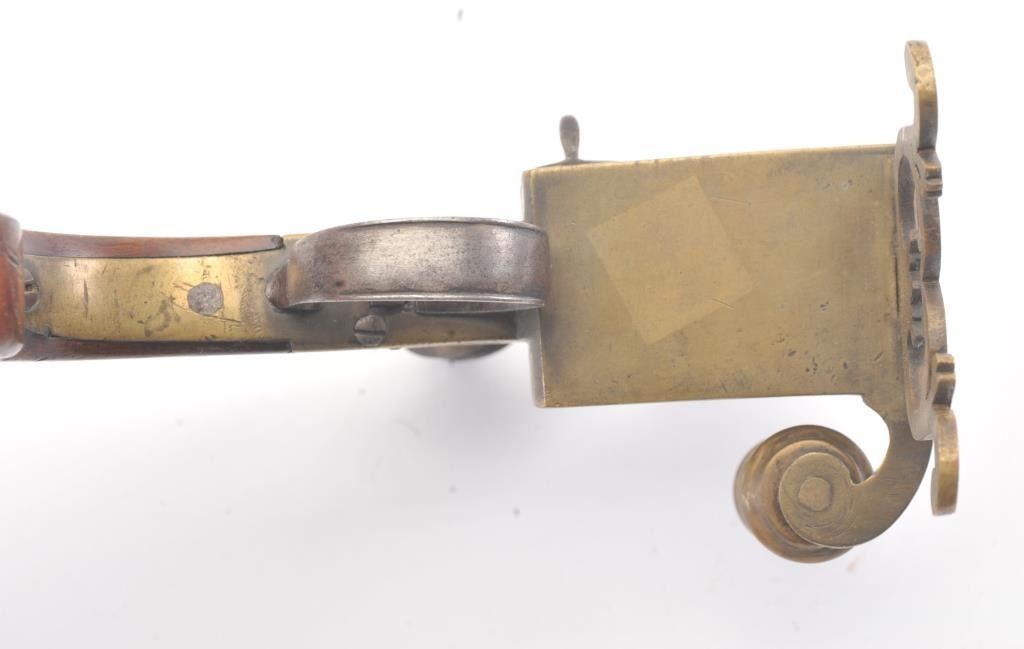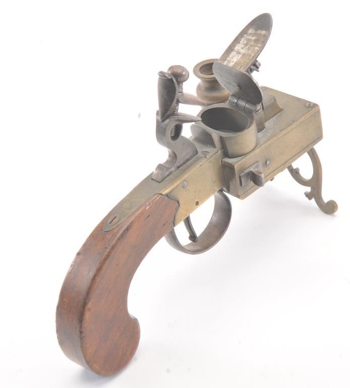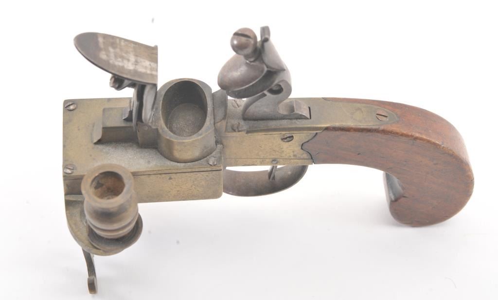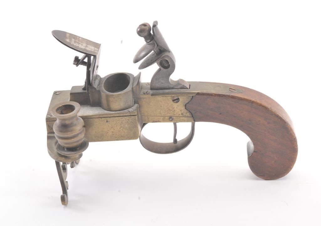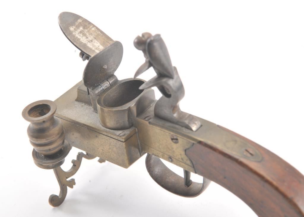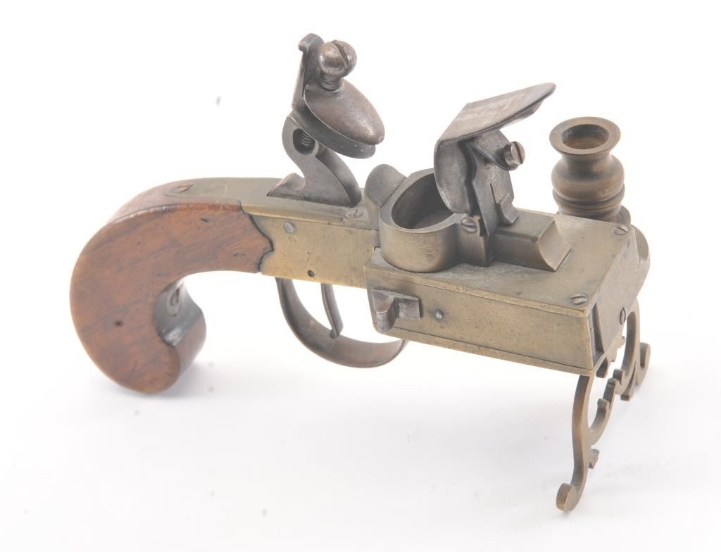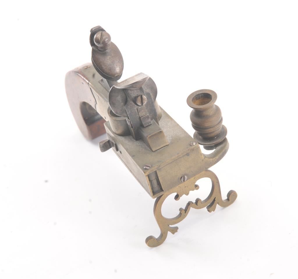 Early 19th century all brass flintlock "Tinder Lighter" with bag shaped grip and candle holder. Measures 7" x 4 3/4" in height. Very good condition with uncleaned patina and all correct parts. Made like aflintlock pistol by a gun maker in British style. Virtually every nice home had one by the fireplace in early America. Est.: $600-$1200