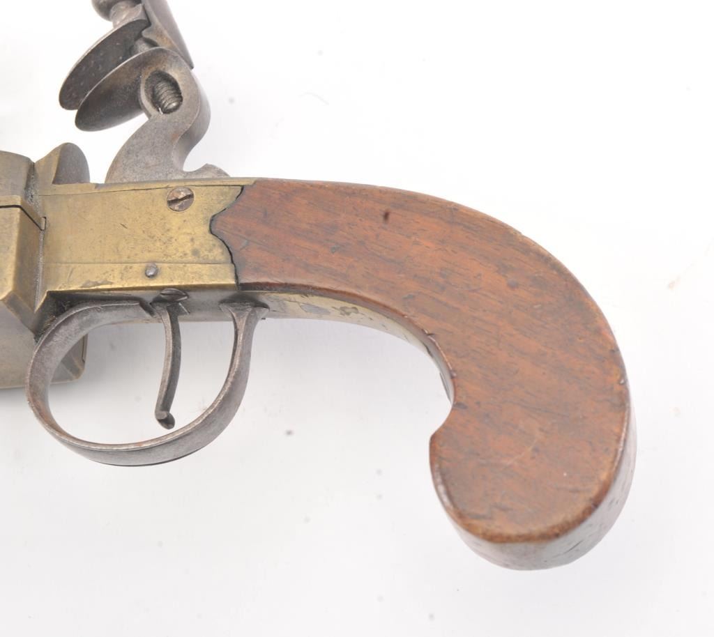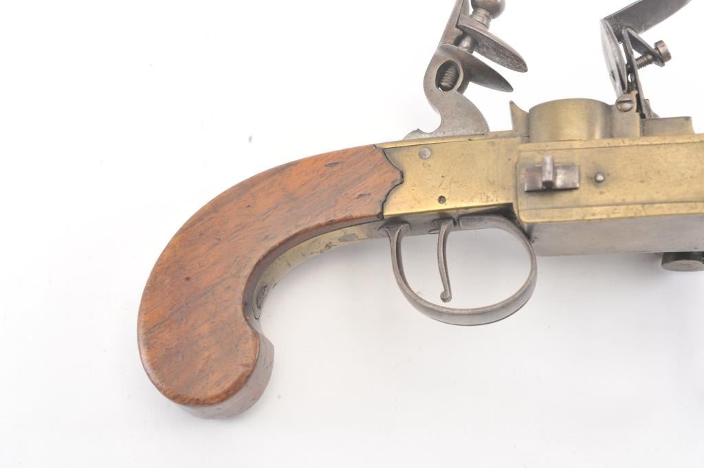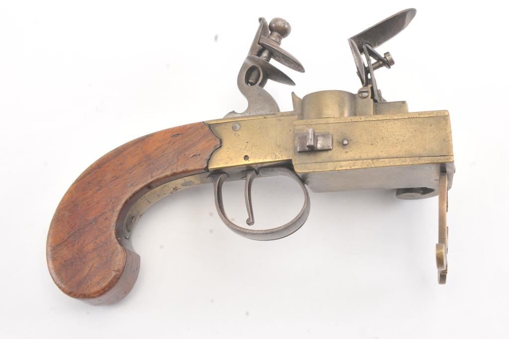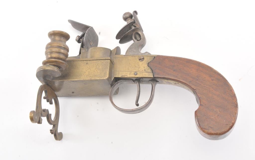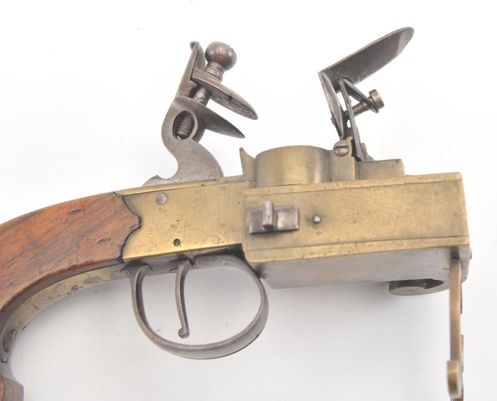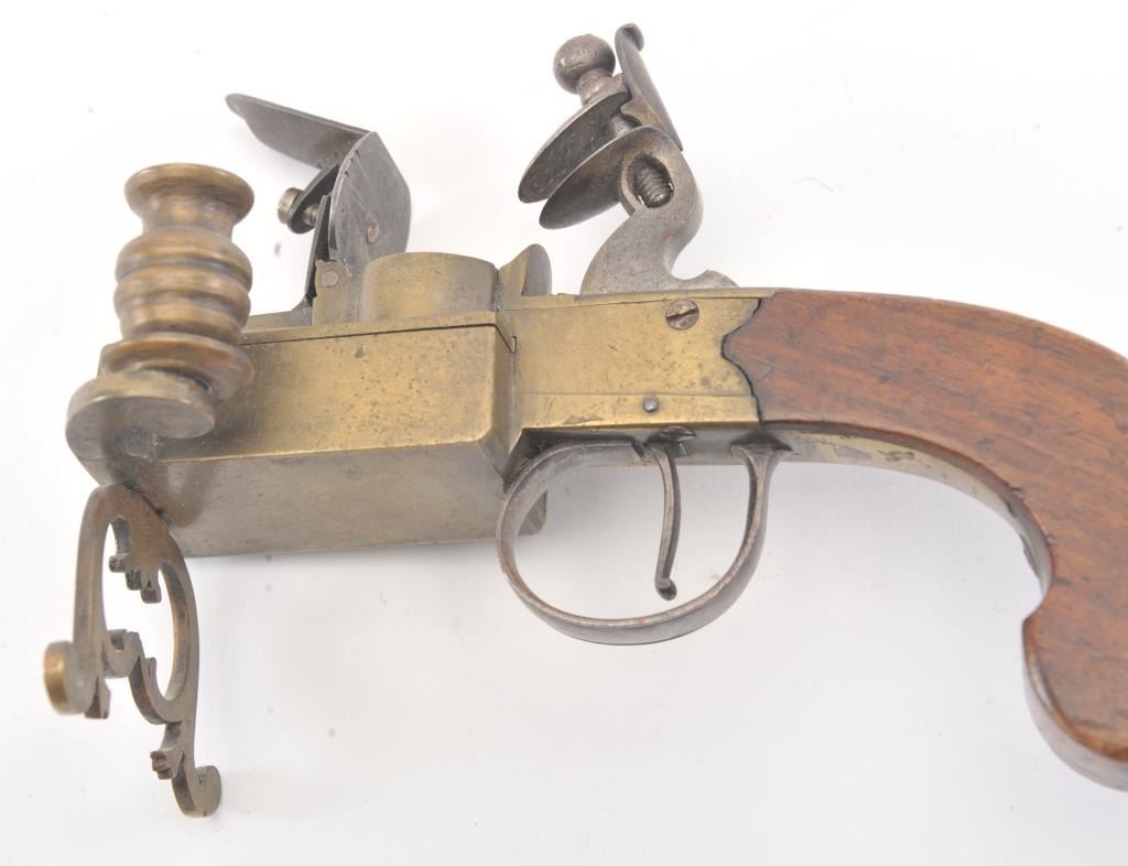 Early 19th century all brass flintlock "Tinder Lighter" with bag shaped grip and candle holder. Measures 7" x 4 3/4" in height. Very good condition with uncleaned patina and all correct parts. Made like aflintlock pistol by a gun maker in British style. Virtually every nice home had one by the fireplace in early America. Est.: $600-$1200