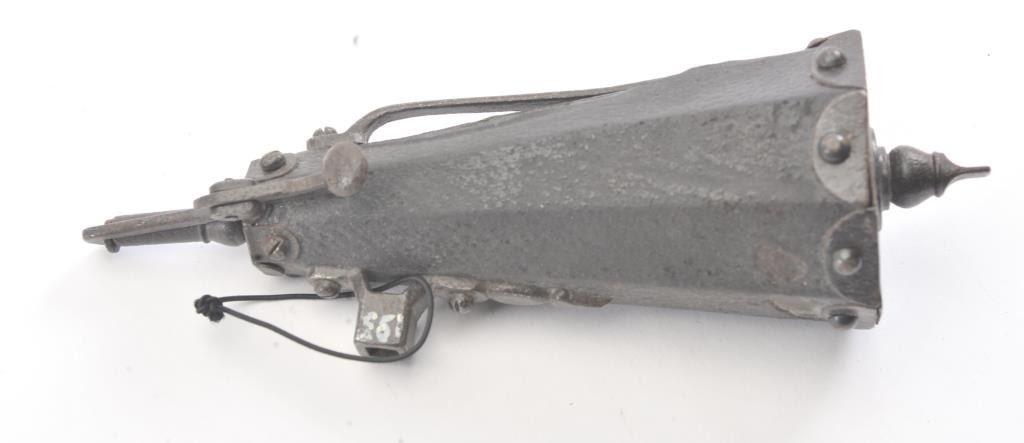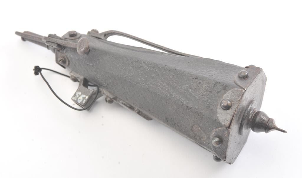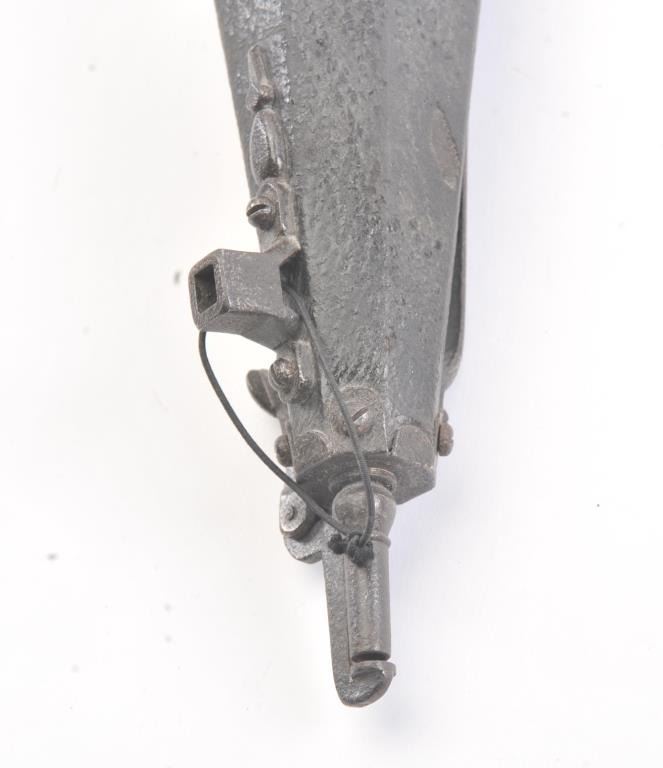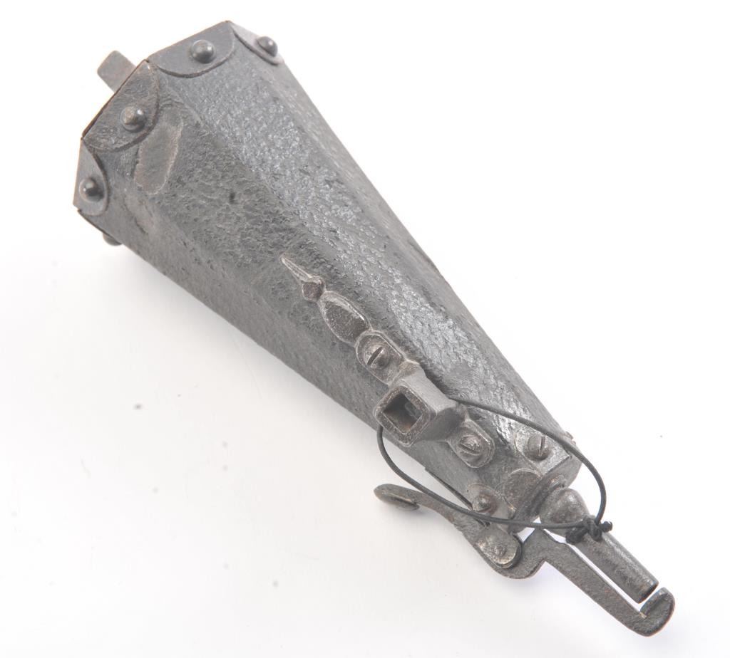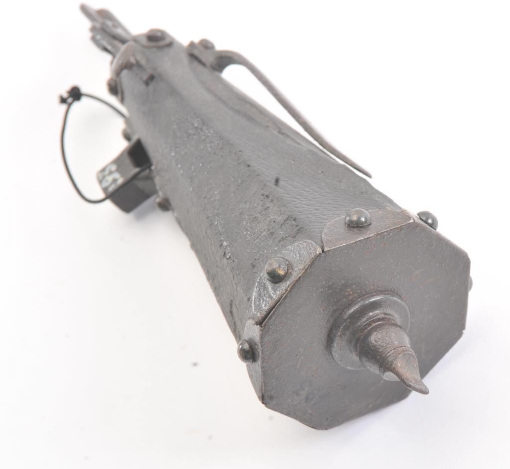 Germanic wheelock combo tool and flask circa 1580-1650. Has spanner wrench and screw driver. Leather covered body. Measures 7 3/4" from tip to end and 2 1/2" across the widest part of the bottom. Dark patina with somepitting and loses of leather but fair to good for its age. Belt hook attached. A military issue style probably Saxson. Est.: $600-$1200