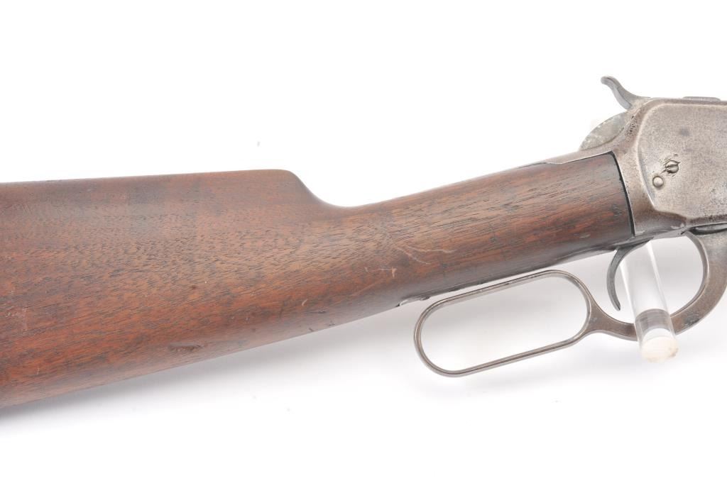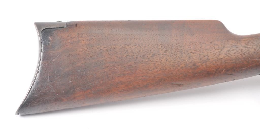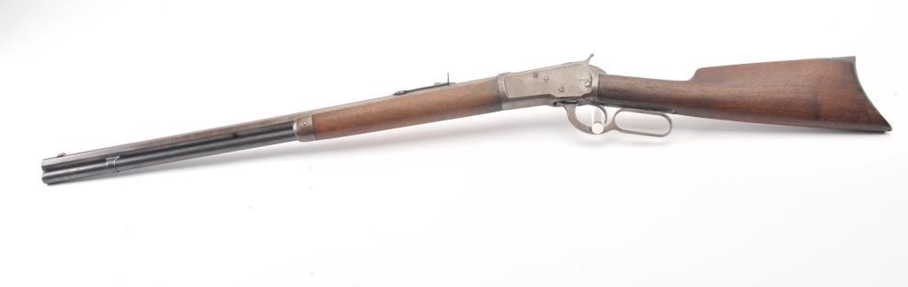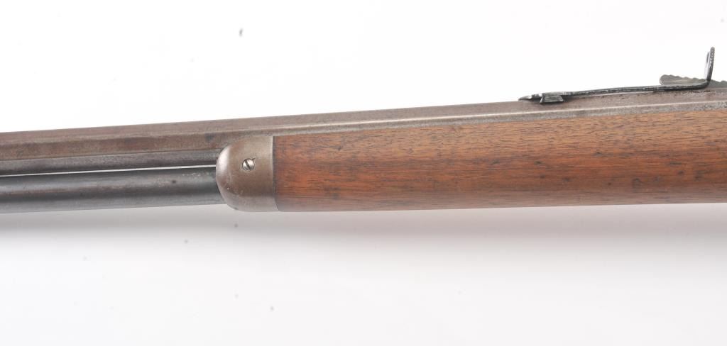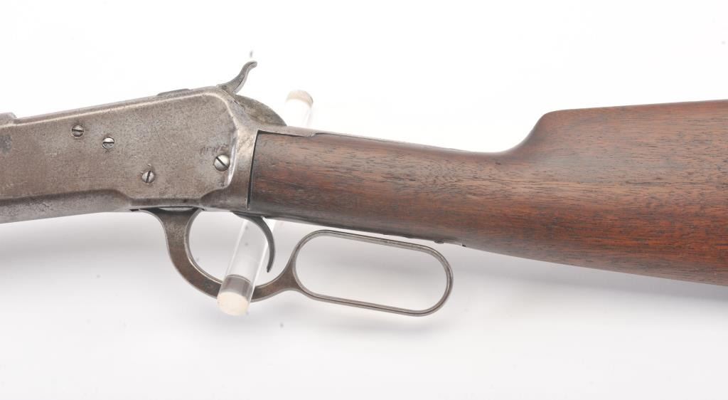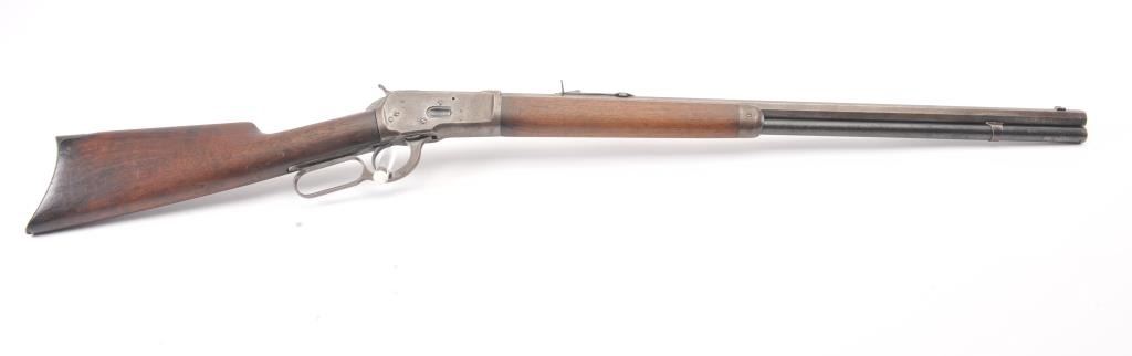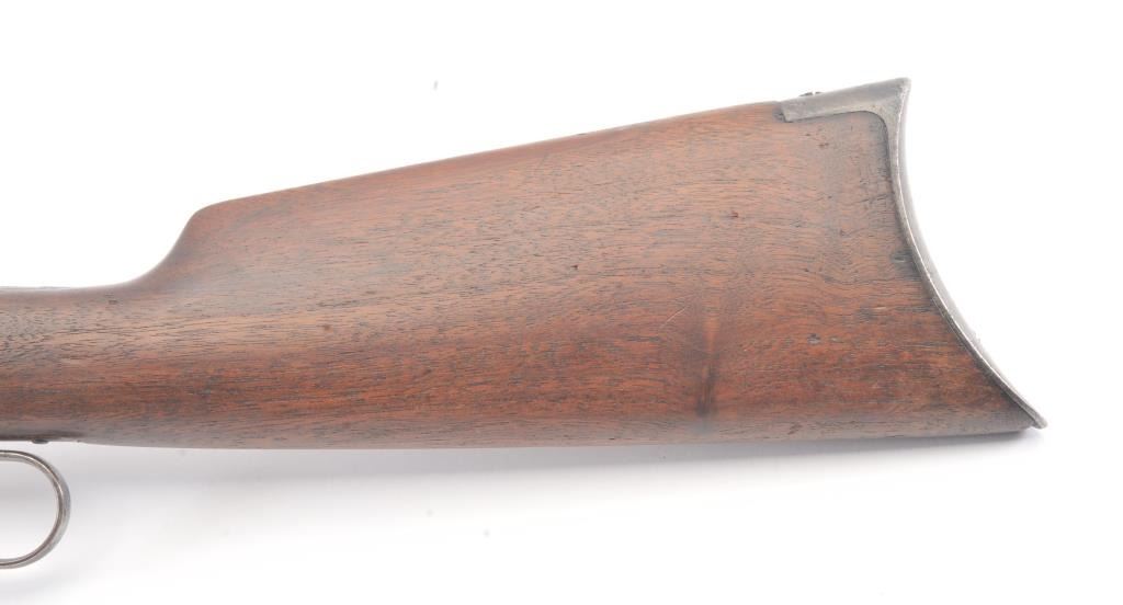 Winchester 1892 rifle rechambered to .45 LC, #551146, with 24" octagon barrel, full mag, rifle butt. Rear buckhorn oversize sight with later or reblued mag tube. Patina with traces of blue on aged metal, stocksrefinished and buttstock is undersized. Action is good, bore is bright, with good quality rechambering. (C&R) Est. 600-1200