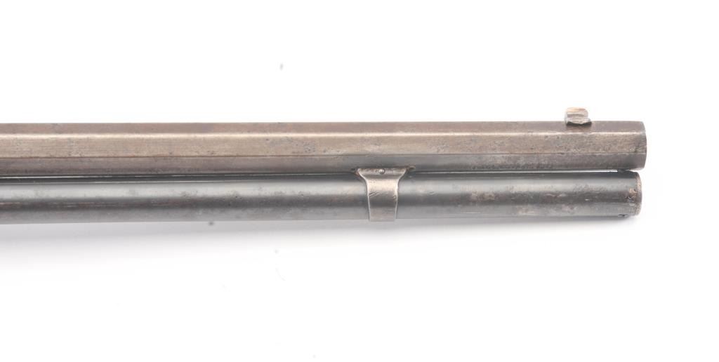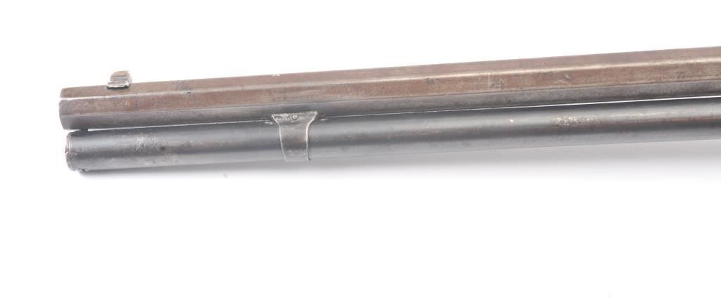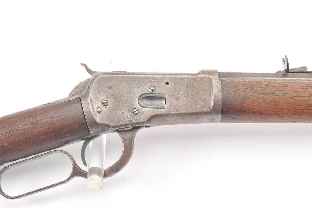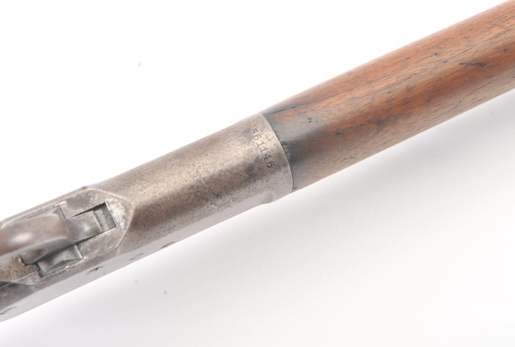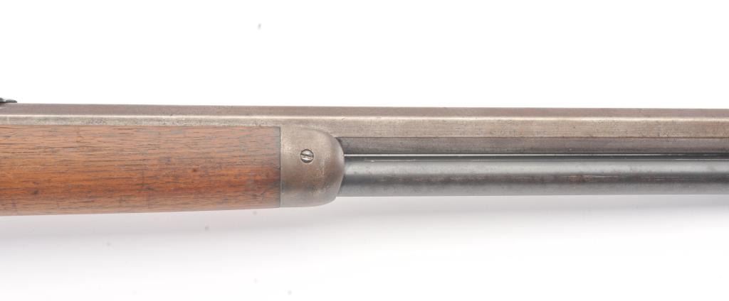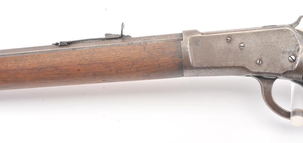 Winchester 1892 rifle rechambered to .45 LC, #551146, with 24" octagon barrel, full mag, rifle butt. Rear buckhorn oversize sight with later or reblued mag tube. Patina with traces of blue on aged metal, stocksrefinished and buttstock is undersized. Action is good, bore is bright, with good quality rechambering. (C&R) Est. 600-1200