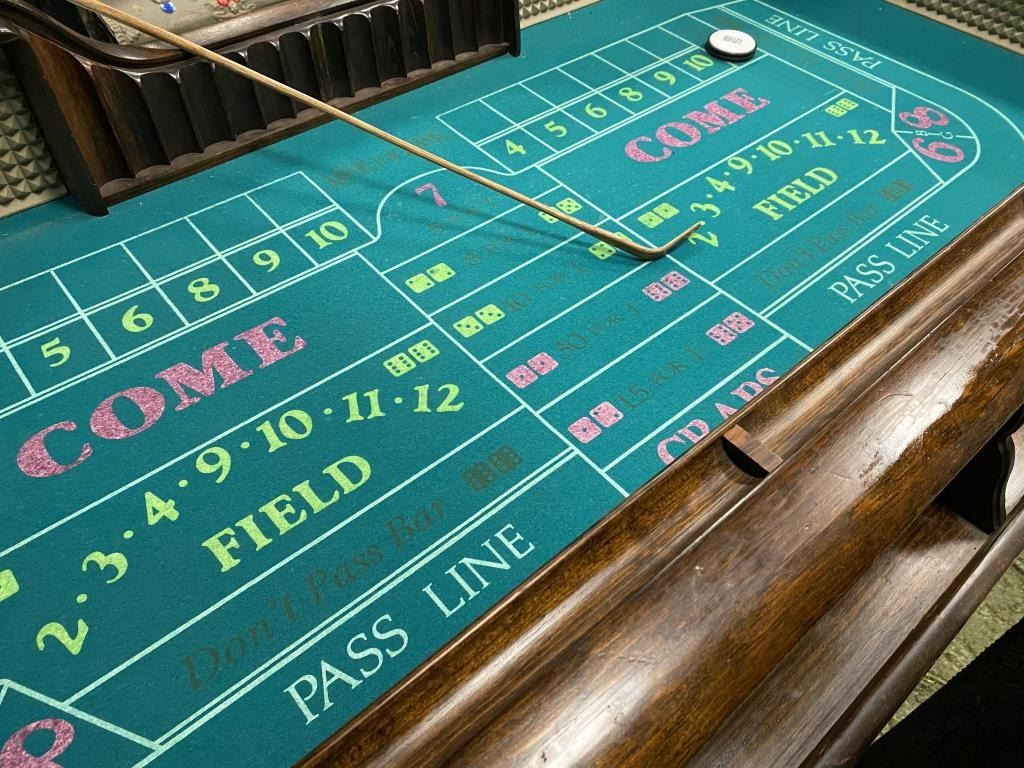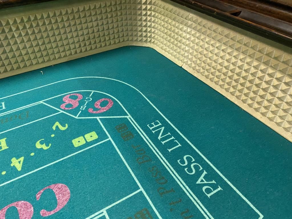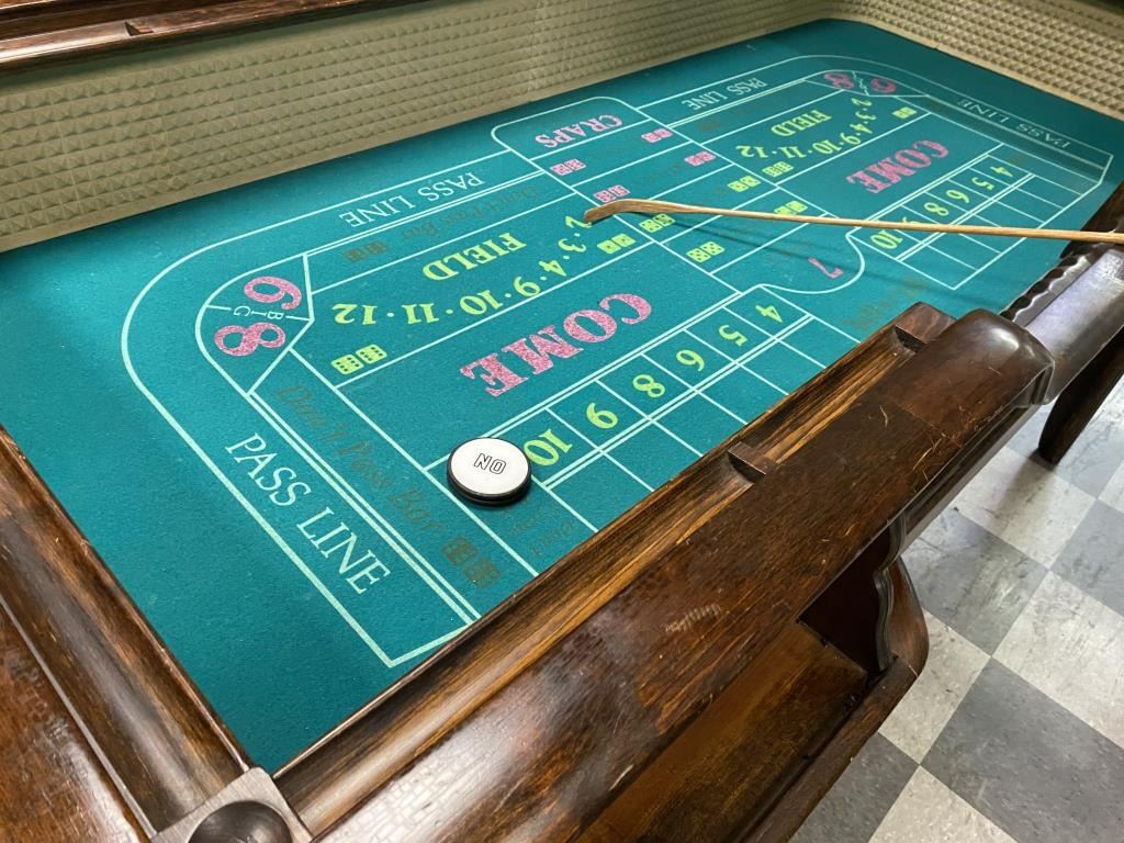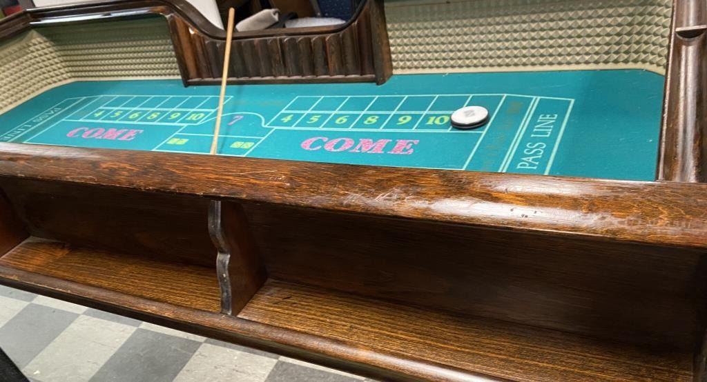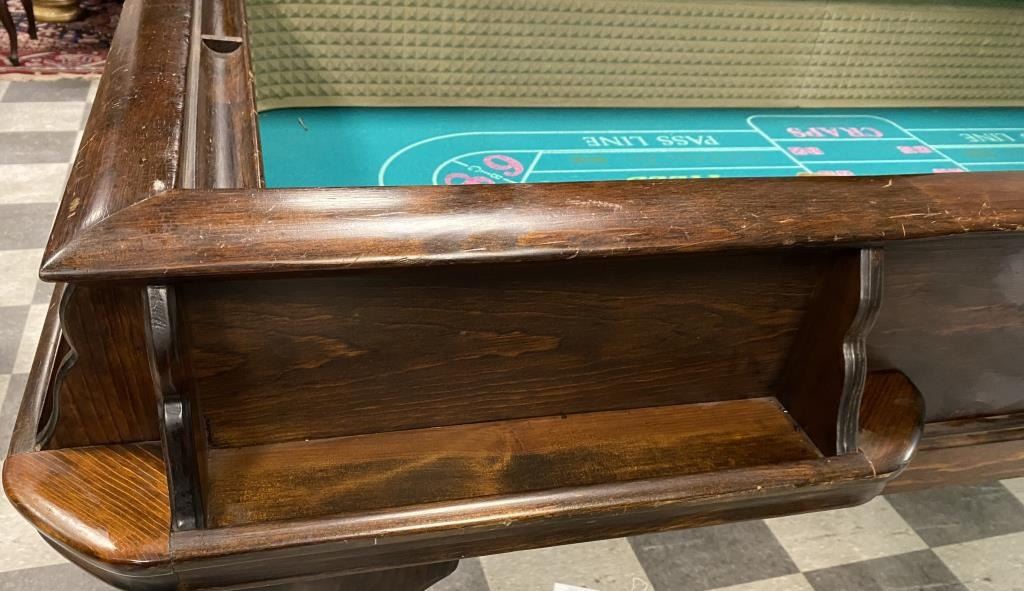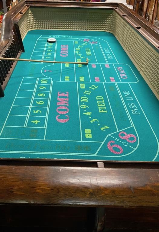 "Pocket Size" crap table from small casino in very good condition. Measures 81 1/2" x 38 1/2". Purportedly Mizpah Hotel Casino in Tonapah, NV. Obtained 30%-40% years ago at auction by our consignors and estateconsigned. Est.: $500-$1000