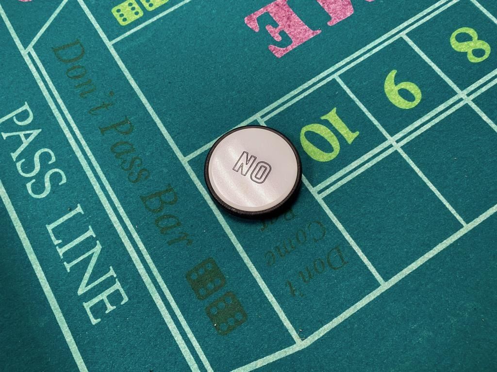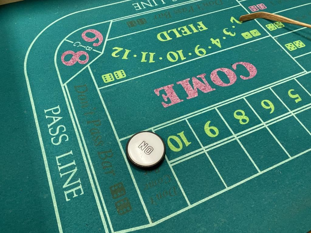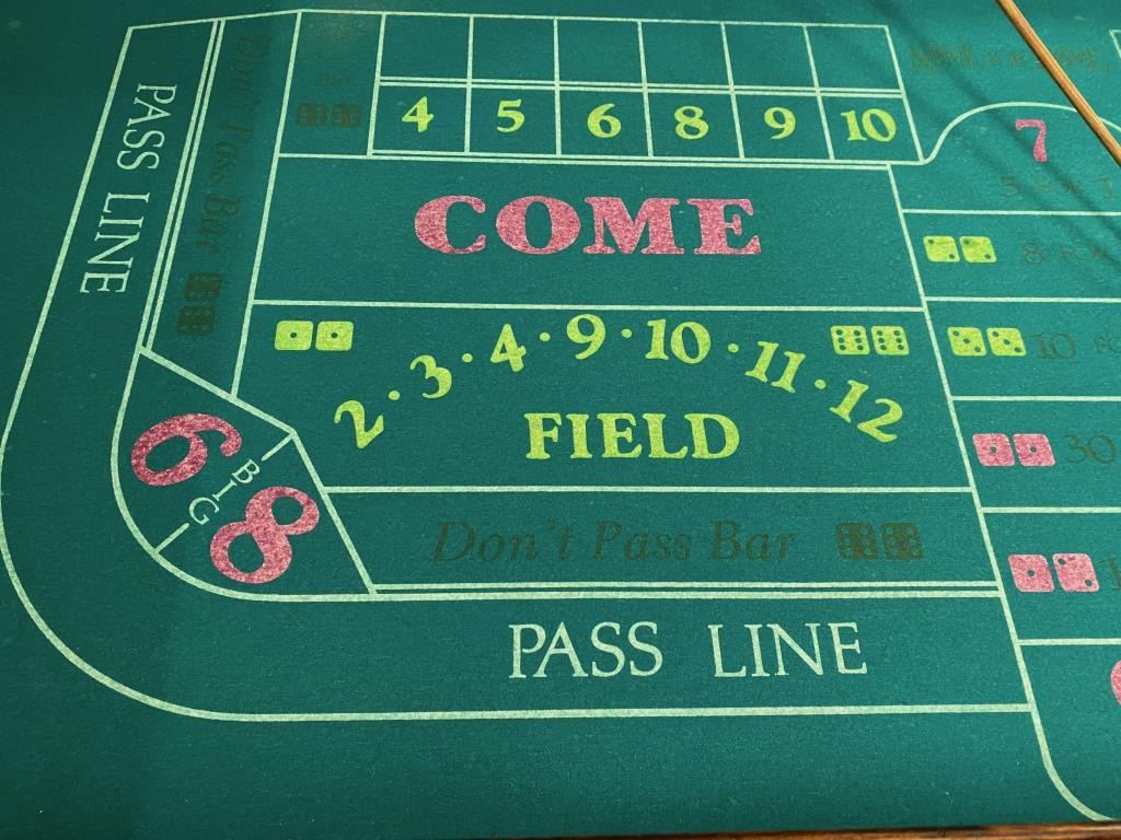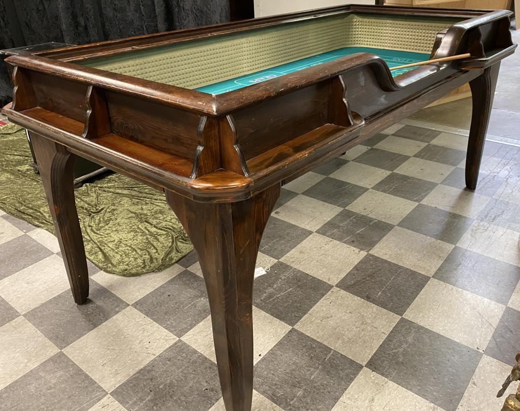 "Pocket Size" crap table from small casino in very good condition. Measures 81 1/2" x 38 1/2". Purportedly Mizpah Hotel Casino in Tonapah, NV. Obtained 30%-40% years ago at auction by our consignors and estateconsigned. Est.: $500-$1000