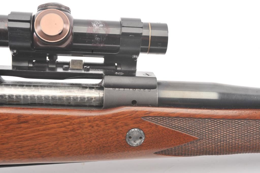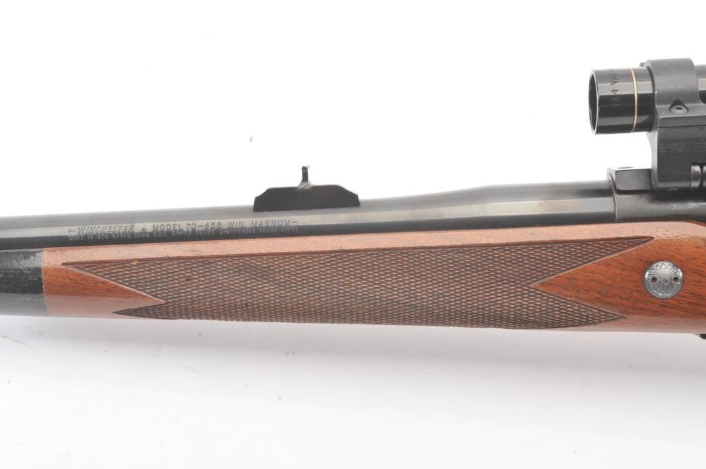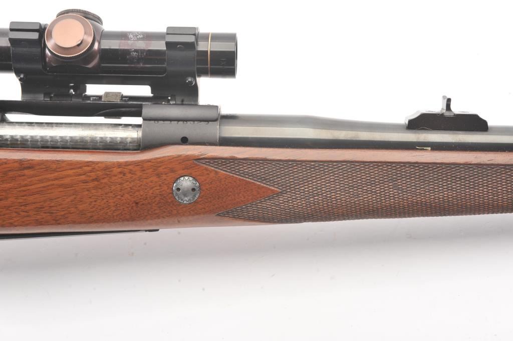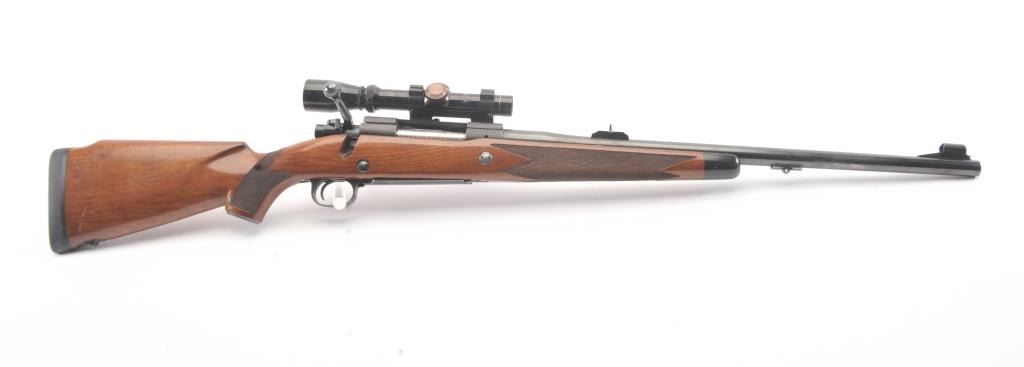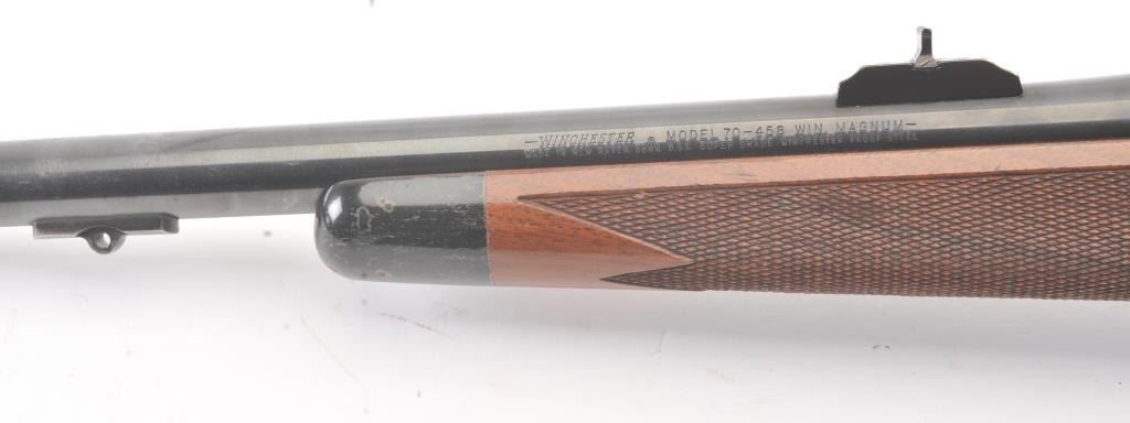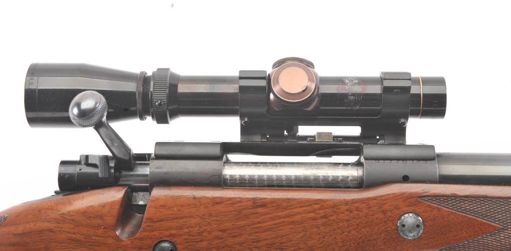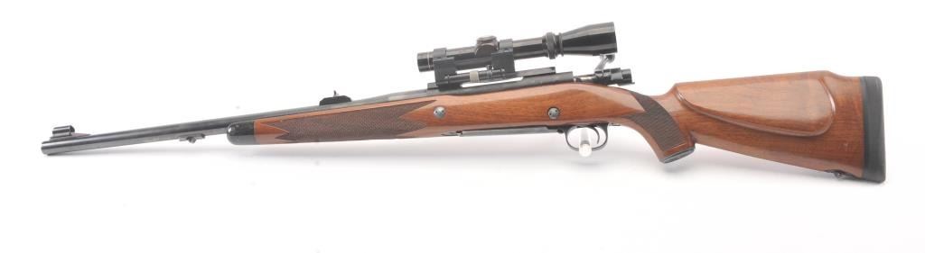Post-64 Winchester Model 70 Super Grade bolt action sporting rifle, .458 Winchester Magnum caliber, Serial #G1178325. The rifle is in fine overall condition with a 22” barrel with a hooded blade front and fixed rear sights. The barrel retains the majority of the thinning blue finish with wear on top and bottom. The receiver shows significant blue finish with a Pachmayr tip-off scope mount and Leupold VARI-X II 1 x 4 variable powerscope. The bolt and follower have been engine turned. The finely checkered Walnut stock has an ebony tip on the fore end, two cross bolts with engraved, domed screw heads. The magazine base plate is marked “SUPER GRADE”and the butt stock ends with a solid rubber recoil pad providing a 12 ½” LOP. The bore is good, the action is crisp and the markings are sharp on this M70 Super Grade. Est.: $700-$1,400. (Modern).