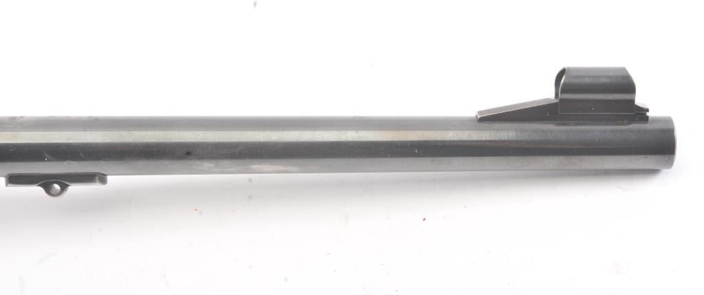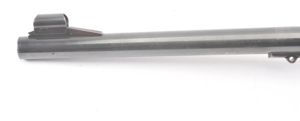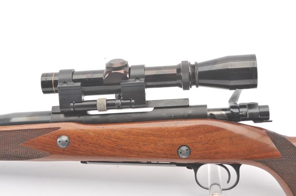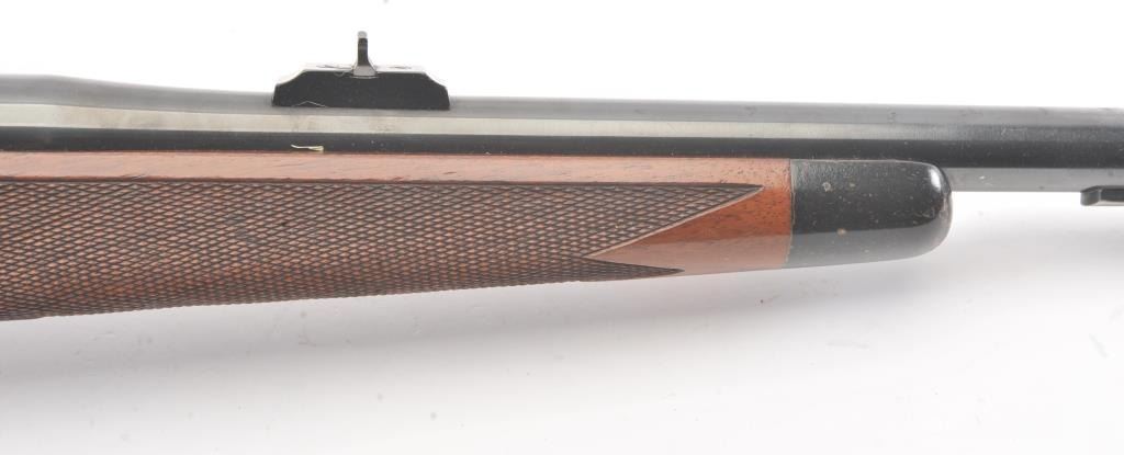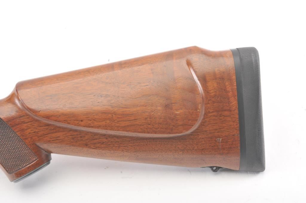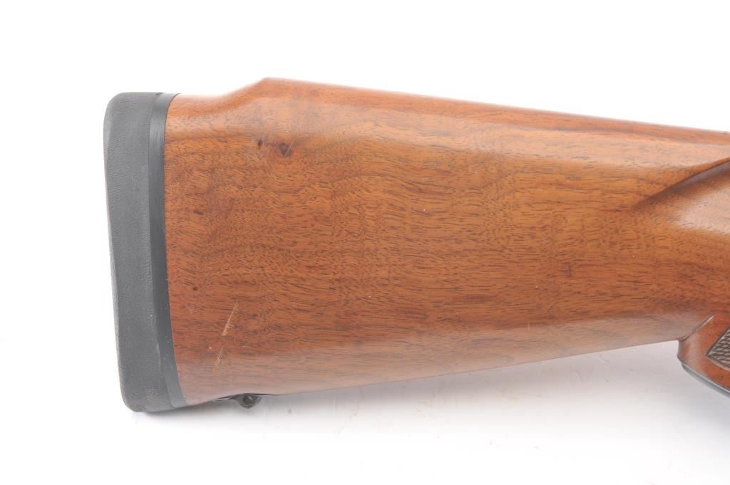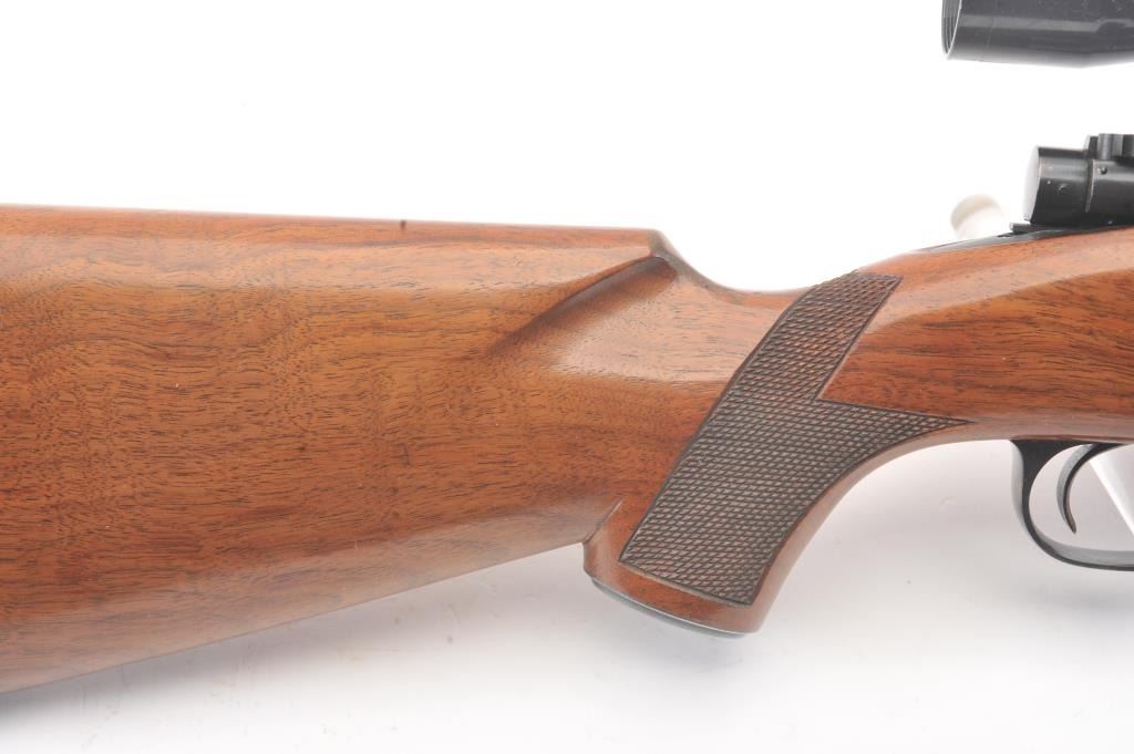 Post-64 Winchester Model 70 Super Grade bolt action sporting rifle, .458 Winchester Magnum caliber, Serial #G1178325. The rifle is in fine overall condition with a 22” barrel with a hooded blade front and fixed rear sights. The barrel retains the majority of the thinning blue finish with wear on top and bottom. The receiver shows significant blue finish with a Pachmayr tip-off scope mount and Leupold VARI-X II 1 x 4 variable powerscope. The bolt and follower have been engine turned. The finely checkered Walnut stock has an ebony tip on the fore end, two cross bolts with engraved, domed screw heads. The magazine base plate is marked “SUPER GRADE”and the butt stock ends with a solid rubber recoil pad providing a 12 ½” LOP. The bore is good, the action is crisp and the markings are sharp on this M70 Super Grade. Est.: $700-$1,400. (Modern).