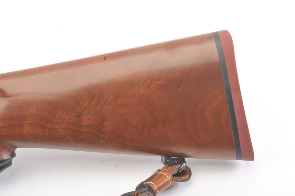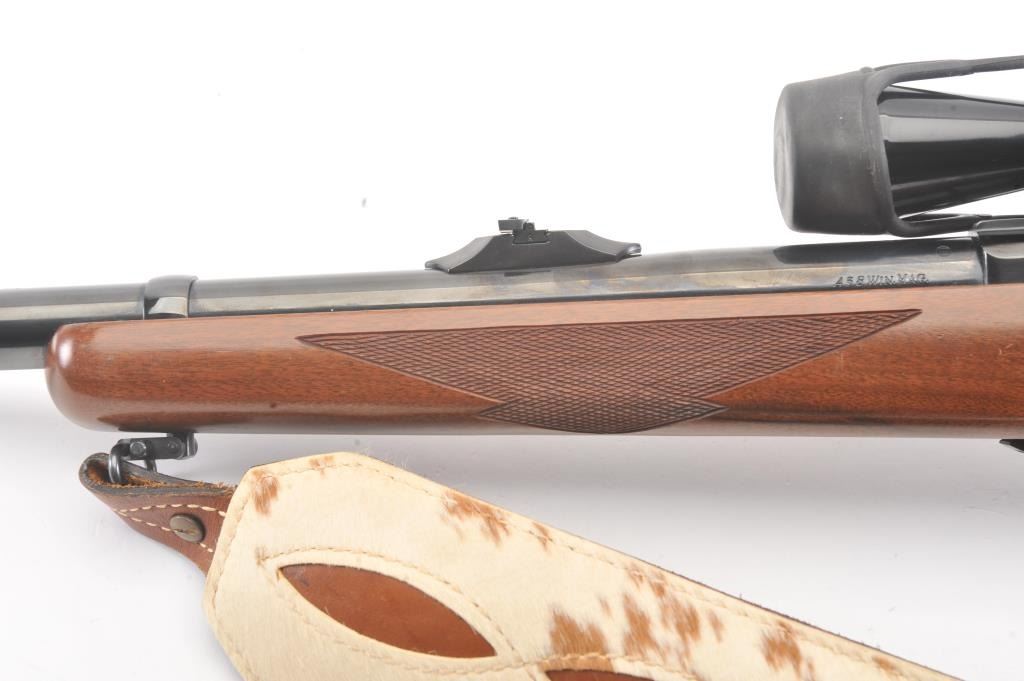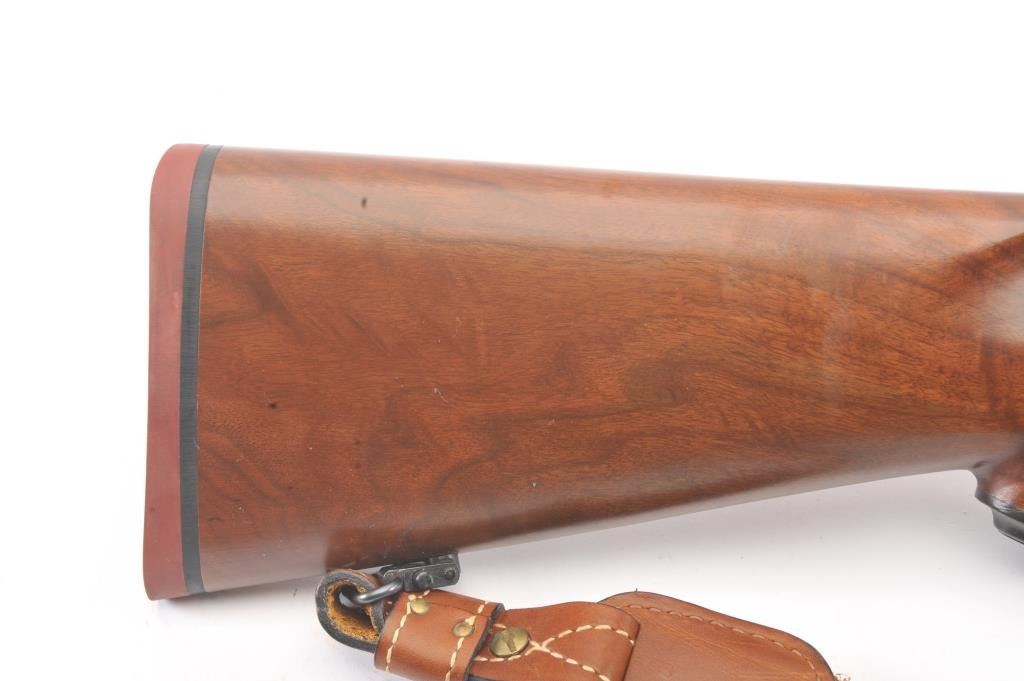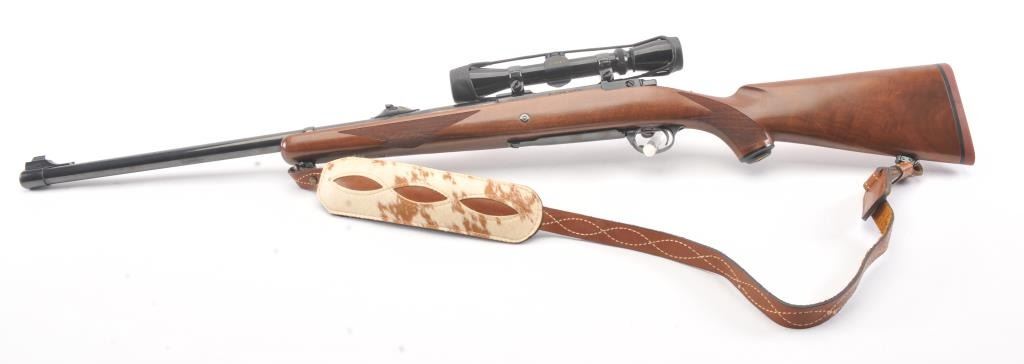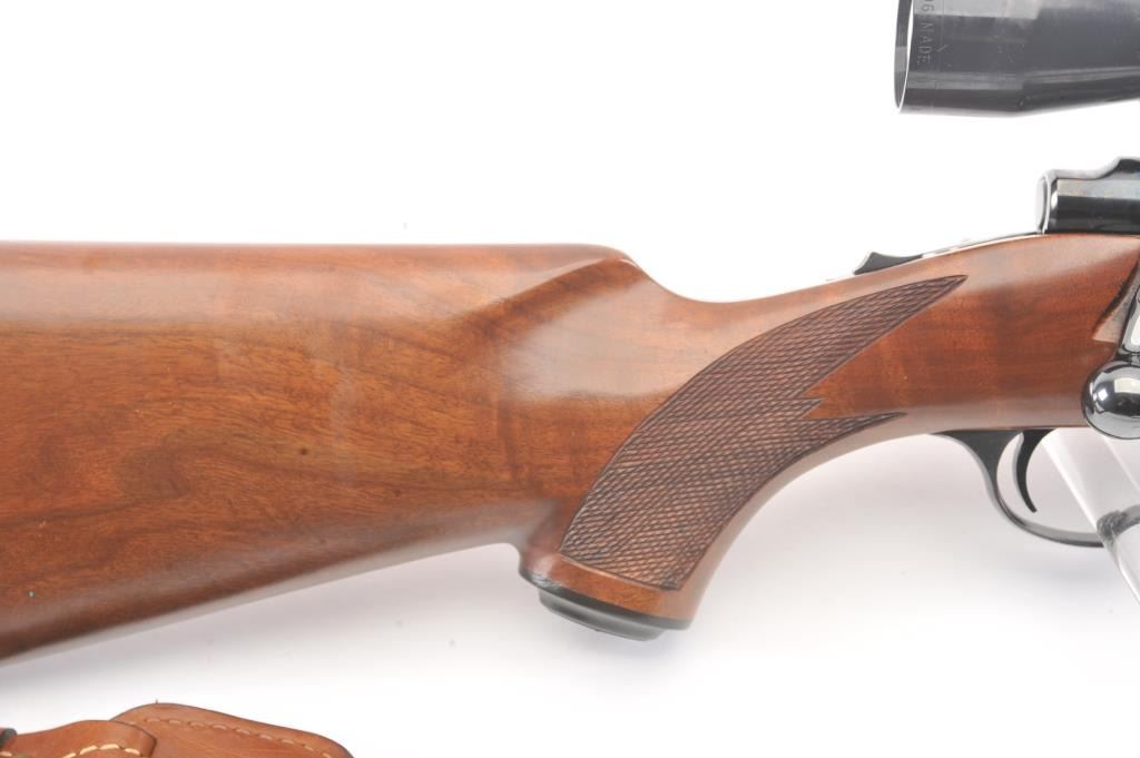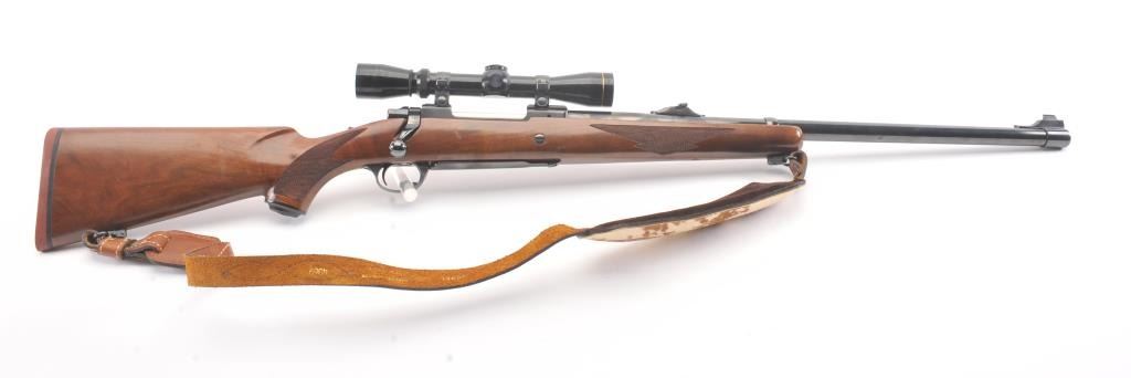 Ruger Model 77 bolt action sporting rifle, .458 Winchester Magnum caliber, Serial #74-44941. The rifle is in fine overall condition with a 24” barrel with a banded blade front and folding rear sights. Therifle retains approximately 95%-97% of the blue finish with light storage marks. The checkered wood stock is in very good condition with mars and scratches consistent with field use. The stock has a cross boltto mitigate recoil, sling swivels, a leather sling and a red solid rubber recoil pad providing a 13 ¾” LOP. The rifle is topped with a Leupold VARI-X II 2 x 7 variable power scope. The bore is good, the action iscrisp and the markings are sharp on this stout Ruger. Est.: $700-$1,400. (Modern).