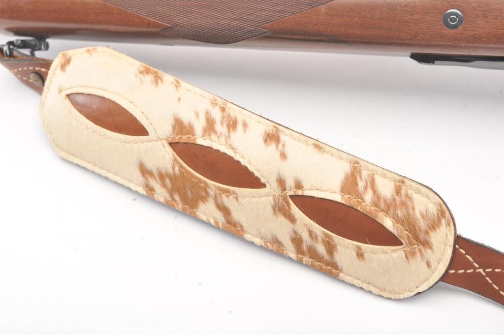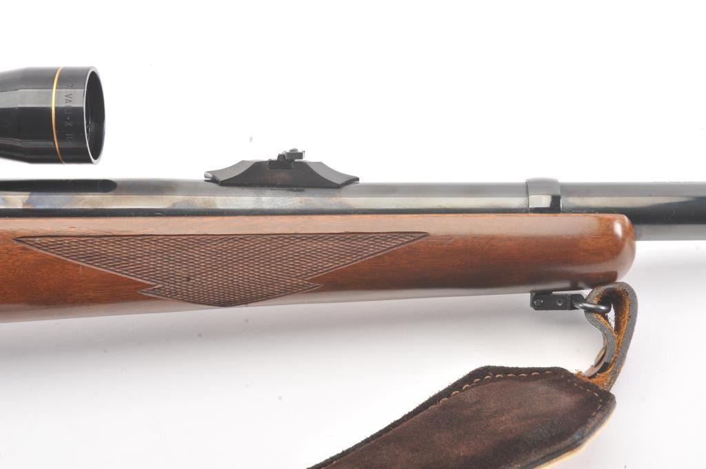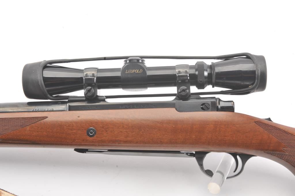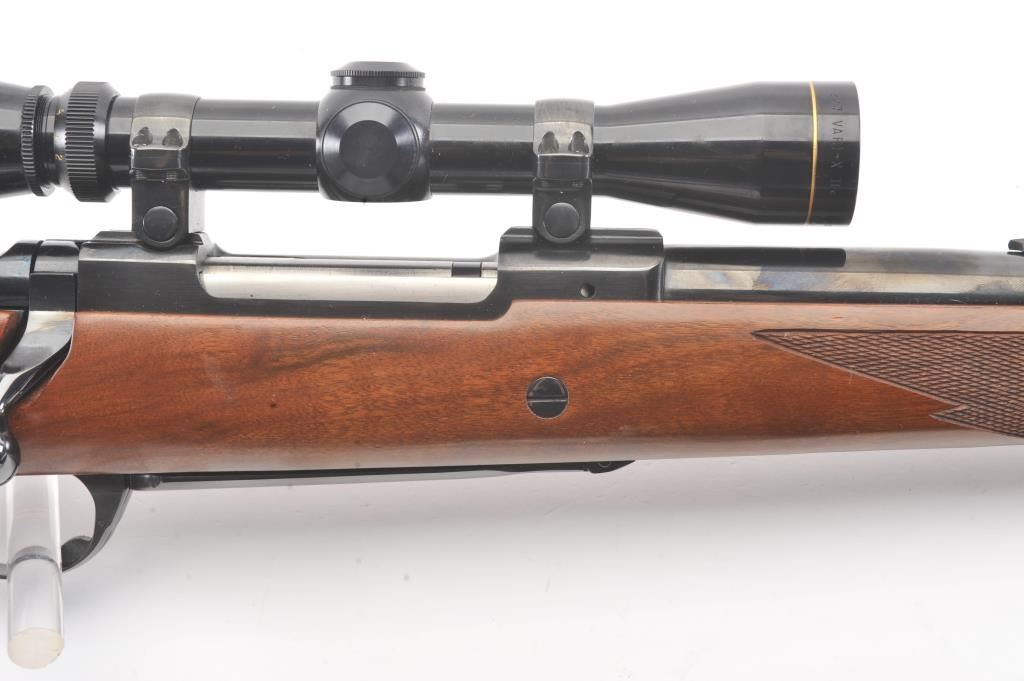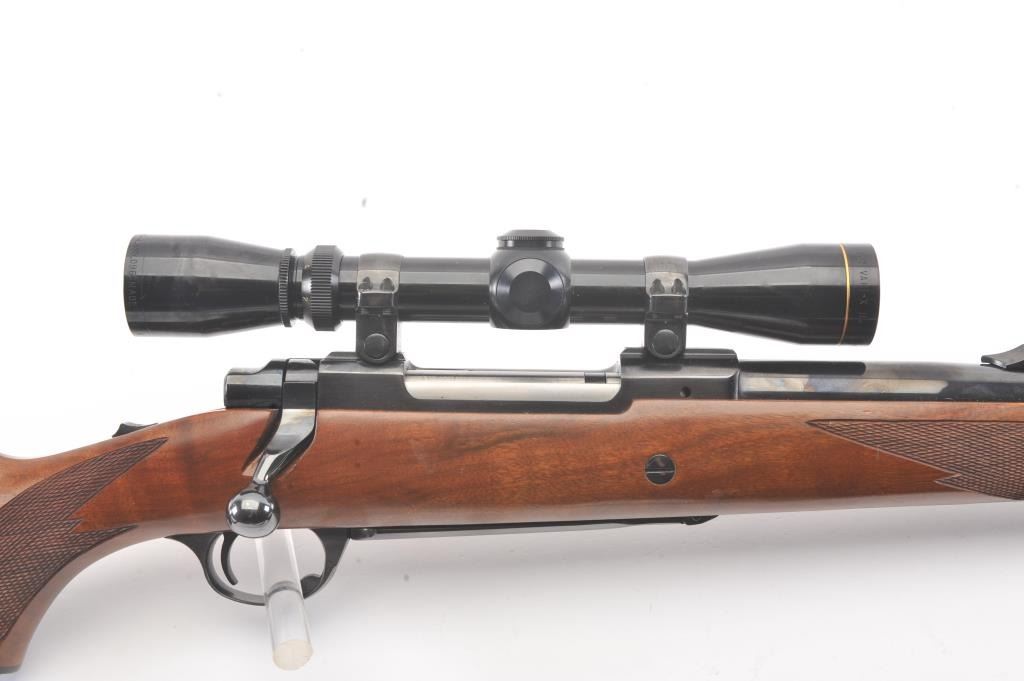 Ruger Model 77 bolt action sporting rifle, .458 Winchester Magnum caliber, Serial #74-44941. The rifle is in fine overall condition with a 24” barrel with a banded blade front and folding rear sights. Therifle retains approximately 95%-97% of the blue finish with light storage marks. The checkered wood stock is in very good condition with mars and scratches consistent with field use. The stock has a cross boltto mitigate recoil, sling swivels, a leather sling and a red solid rubber recoil pad providing a 13 ¾” LOP. The rifle is topped with a Leupold VARI-X II 2 x 7 variable power scope. The bore is good, the action iscrisp and the markings are sharp on this stout Ruger. Est.: $700-$1,400. (Modern).
