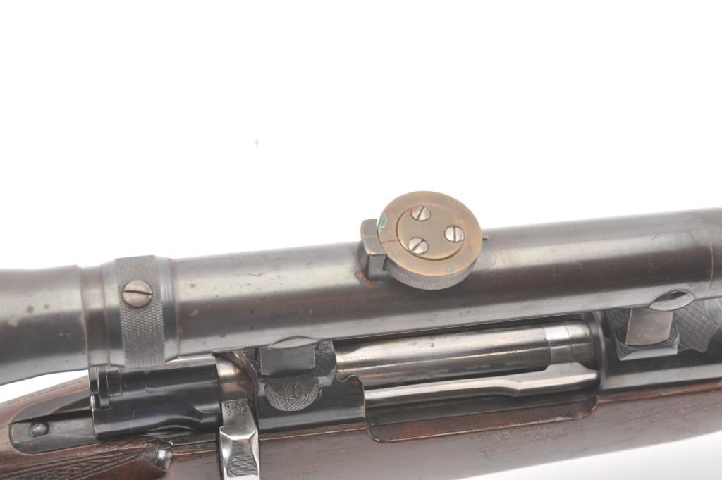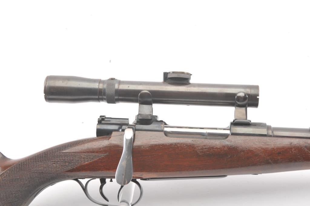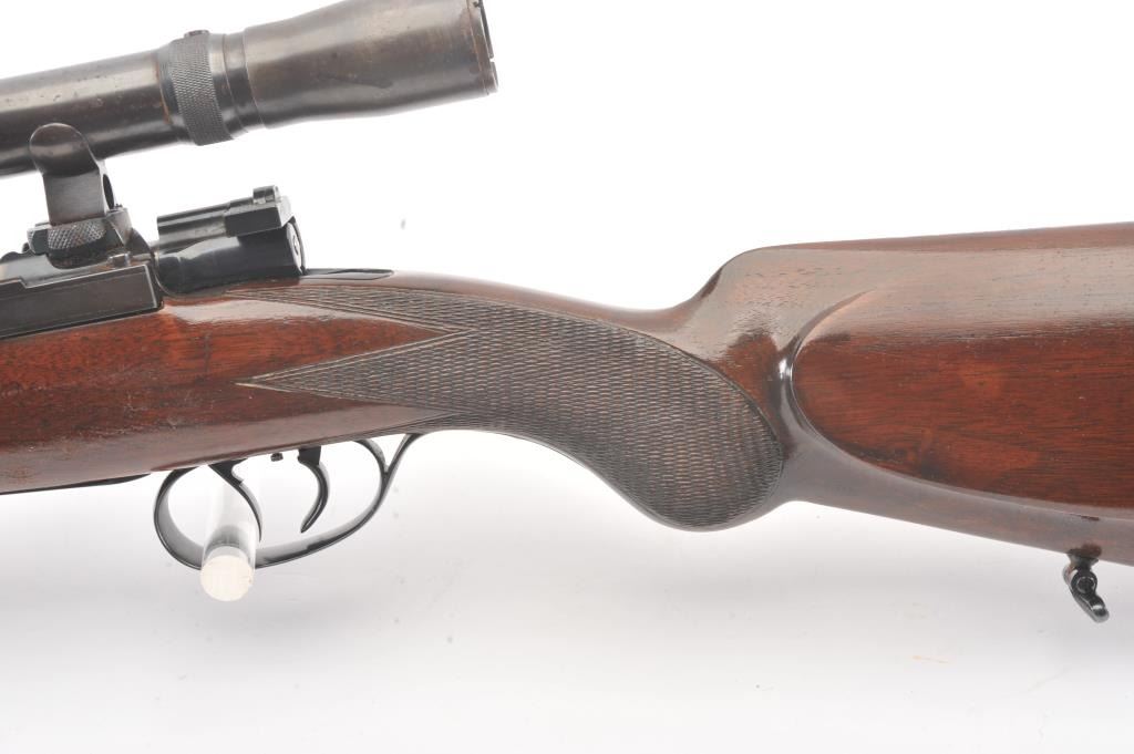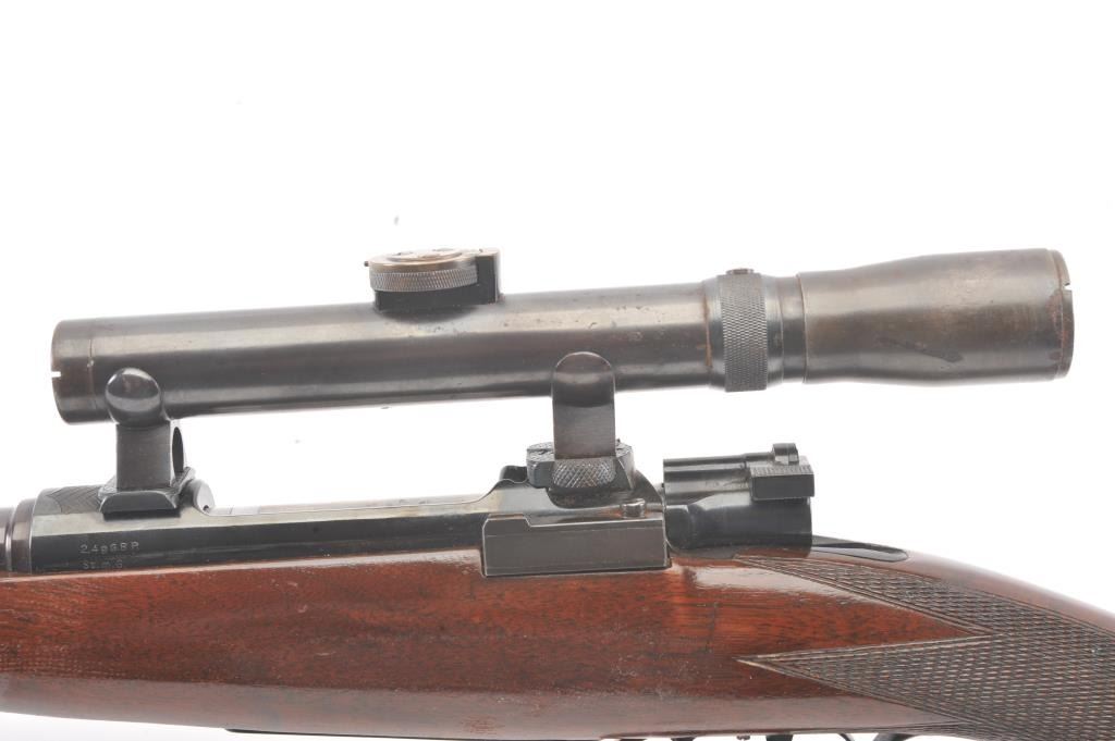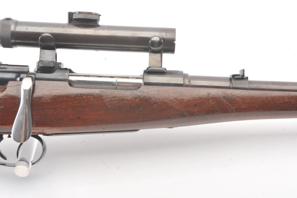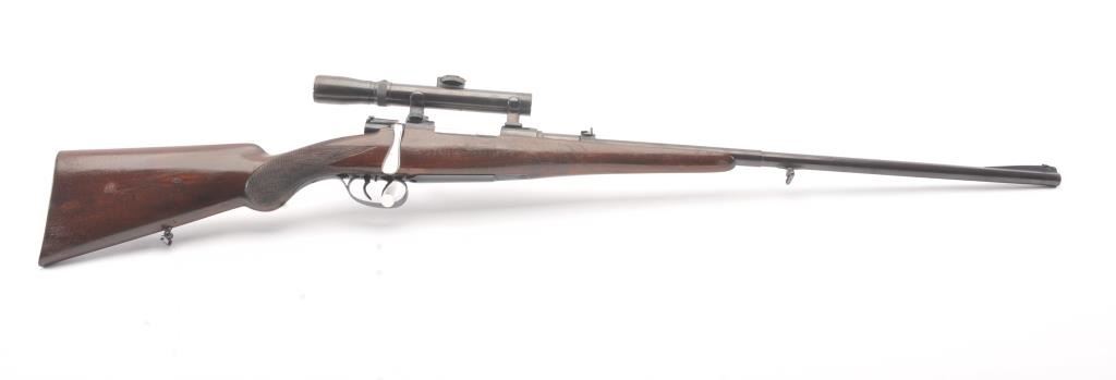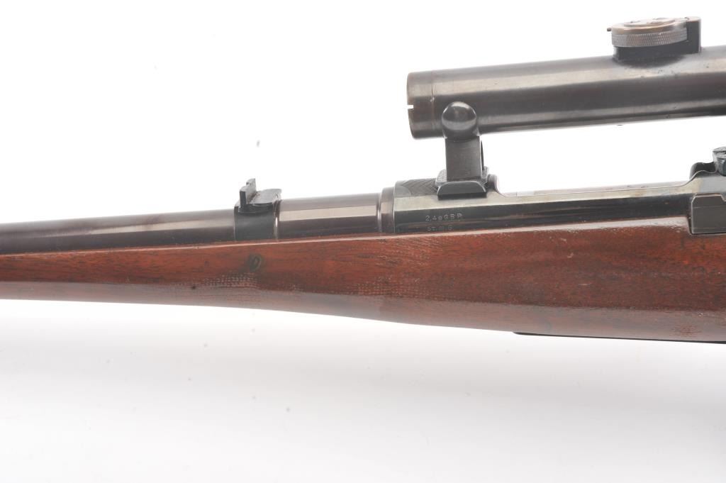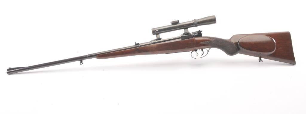 Vintage Pre-War Mauser Model 98 sporting rifle, 8mm caliber, Serial #NSNV. The rifle is in fine overall condition with a 24” barrel with a ramped blade front and two-leaf folding rear sights. The barrel retainsapproximately 98% of an old re-blue finish. The receiver has German proofs, a crest on the front ring, a hard chromed butter knife bolt, double set triggers and period claw mounts. The finely checkered wood stock isin very good condition with a half knob pistol grip and sling swivels ending with a horn butt plate providing a 14” LOP. The bore is good, the action is crisp and the markings are sharp. The rifle is topped with a vintage Zeiss scope in period claw mounts. Est.: $700-$1,400. (C+R).