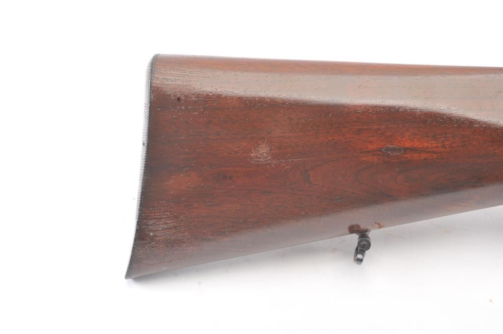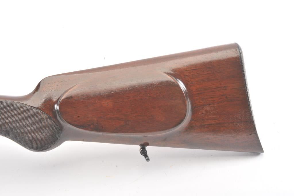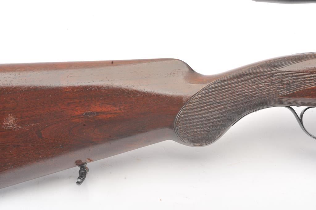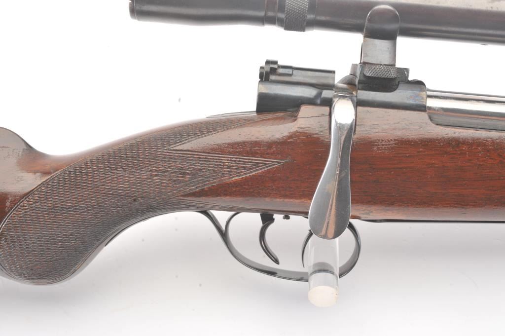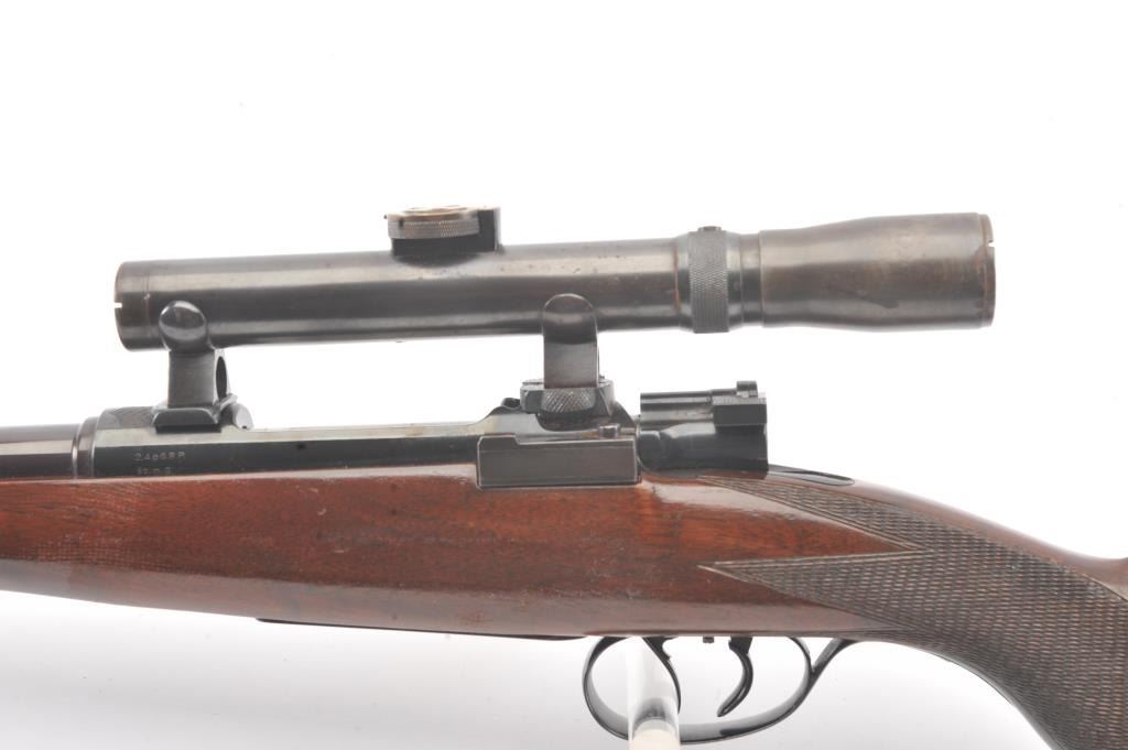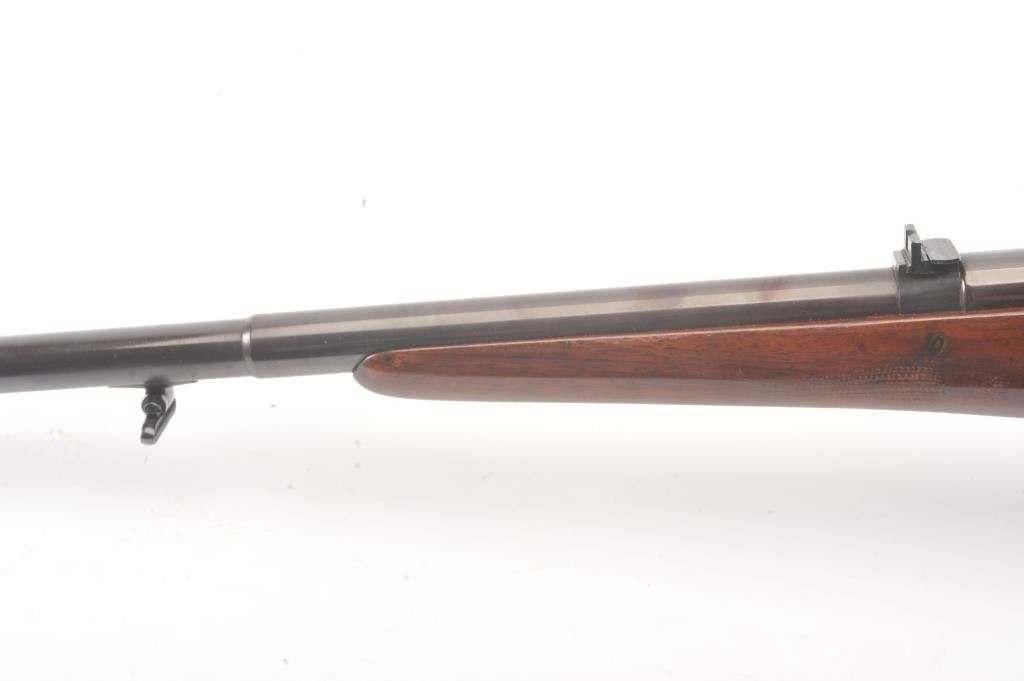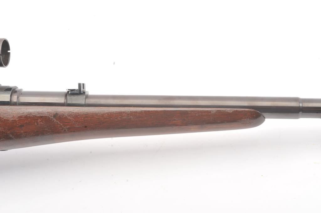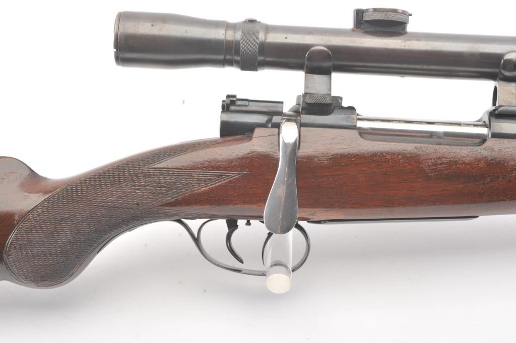Vintage Pre-War Mauser Model 98 sporting rifle, 8mm caliber, Serial #NSNV. The rifle is in fine overall condition with a 24” barrel with a ramped blade front and two-leaf folding rear sights. The barrel retainsapproximately 98% of an old re-blue finish. The receiver has German proofs, a crest on the front ring, a hard chromed butter knife bolt, double set triggers and period claw mounts. The finely checkered wood stock isin very good condition with a half knob pistol grip and sling swivels ending with a horn butt plate providing a 14” LOP. The bore is good, the action is crisp and the markings are sharp. The rifle is topped with a vintage Zeiss scope in period claw mounts. Est.: $700-$1,400. (C+R).