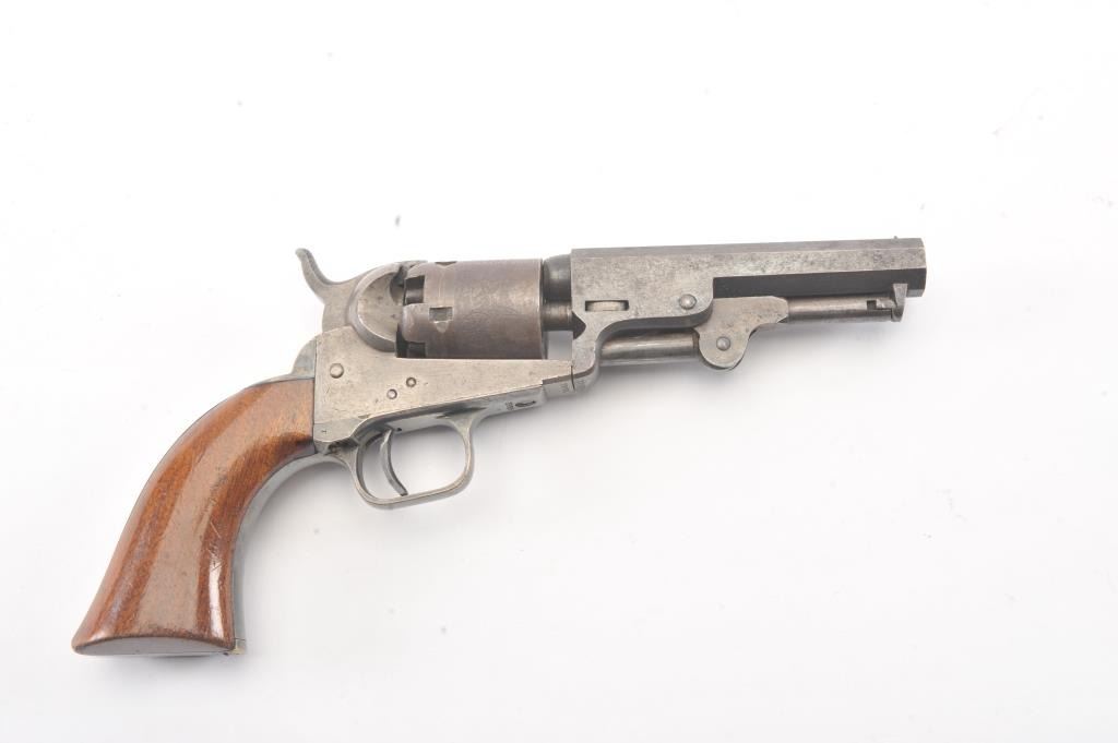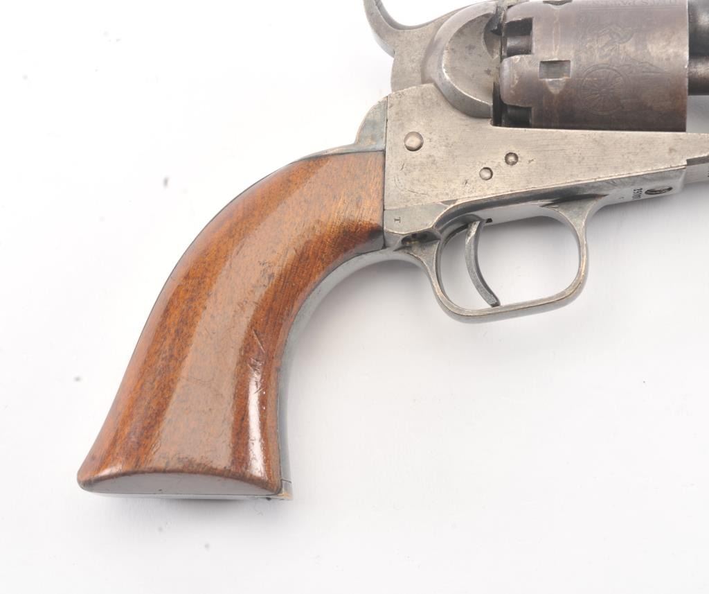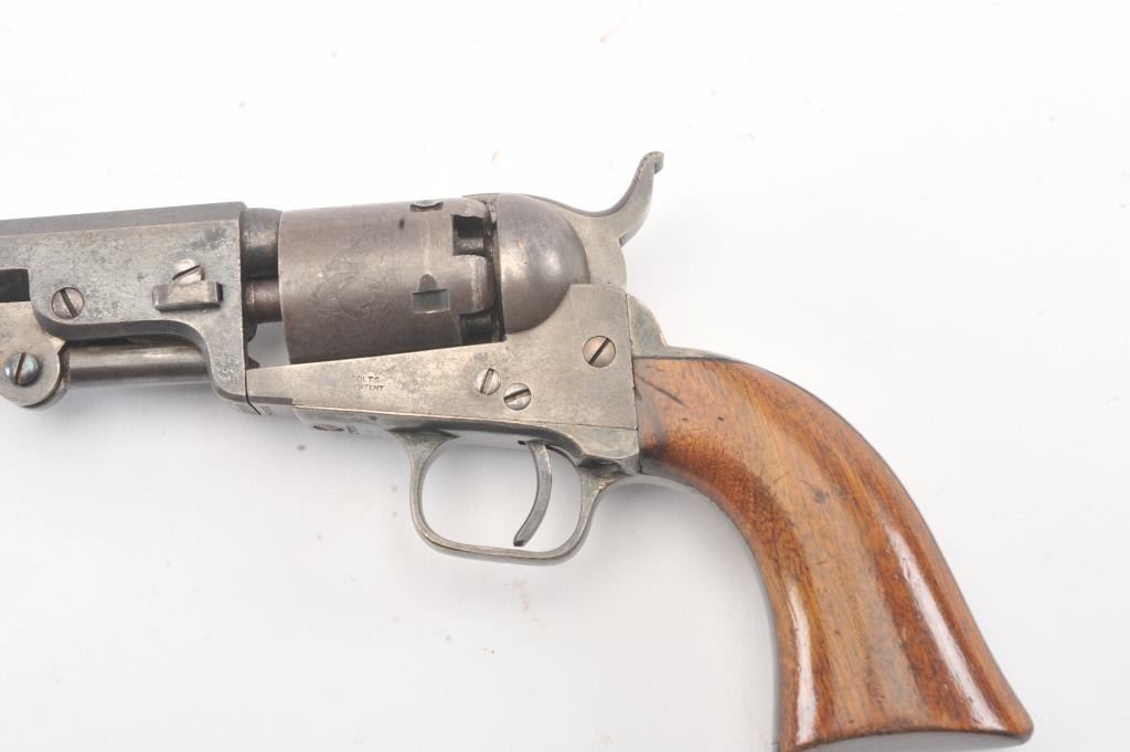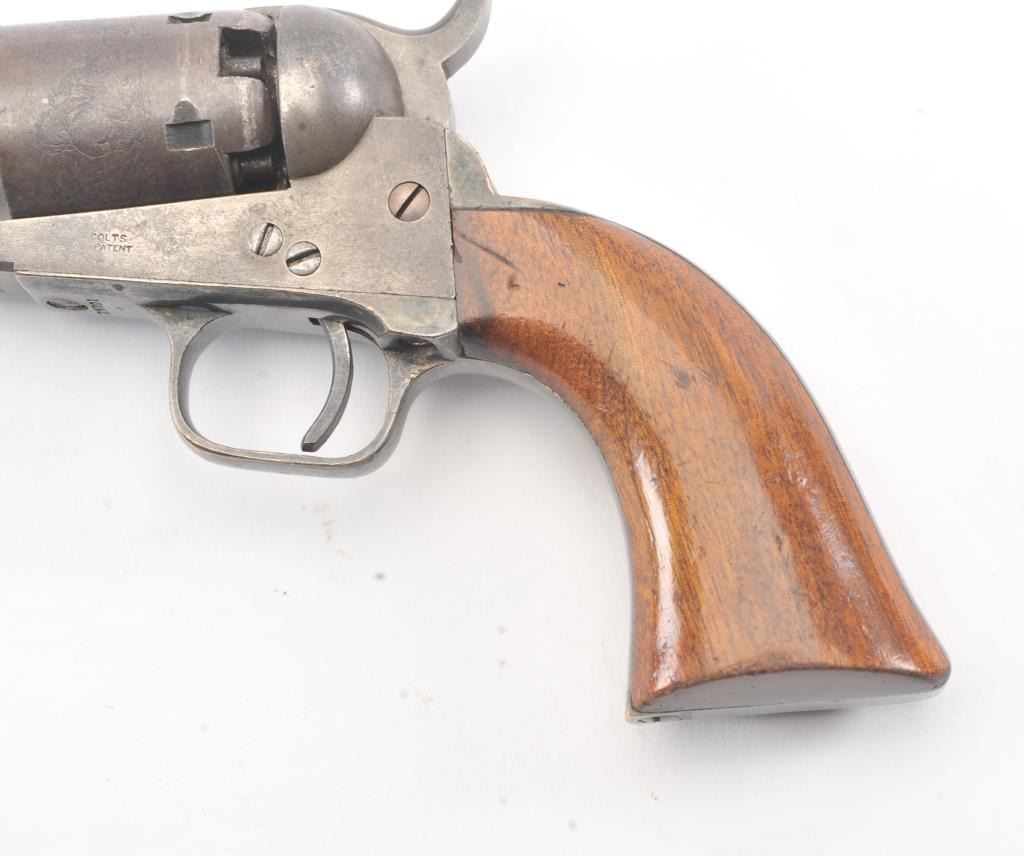 Colt 1849 Pocket Model .31 caliber percussion revolver with a 4" barrel, 2 line New York address, 5 shot, and small trigger guard, S/N 25001. Subject revolver remains in very good condition with 50%-70% aging and toning blue on the barrel and cylinder. Some scattered erosion and pinprick pitting. 50%-70% light original cylinder scene remains. 75%-85%darkened original silver plate. 75%-85%original varnish on very good plusgrips. 30%-50% early case hardening remains. Good markings and fairly crisp overall. All matching serial numbers. (Antique) Est.: $700-$1400