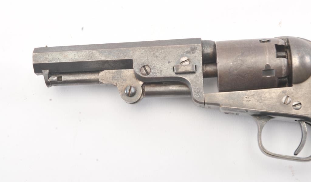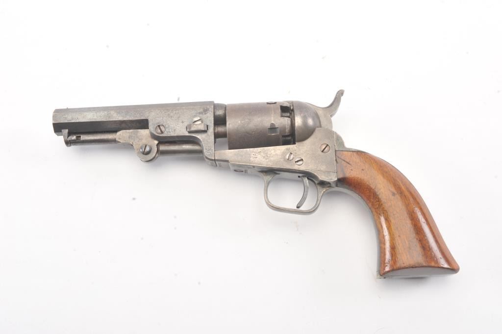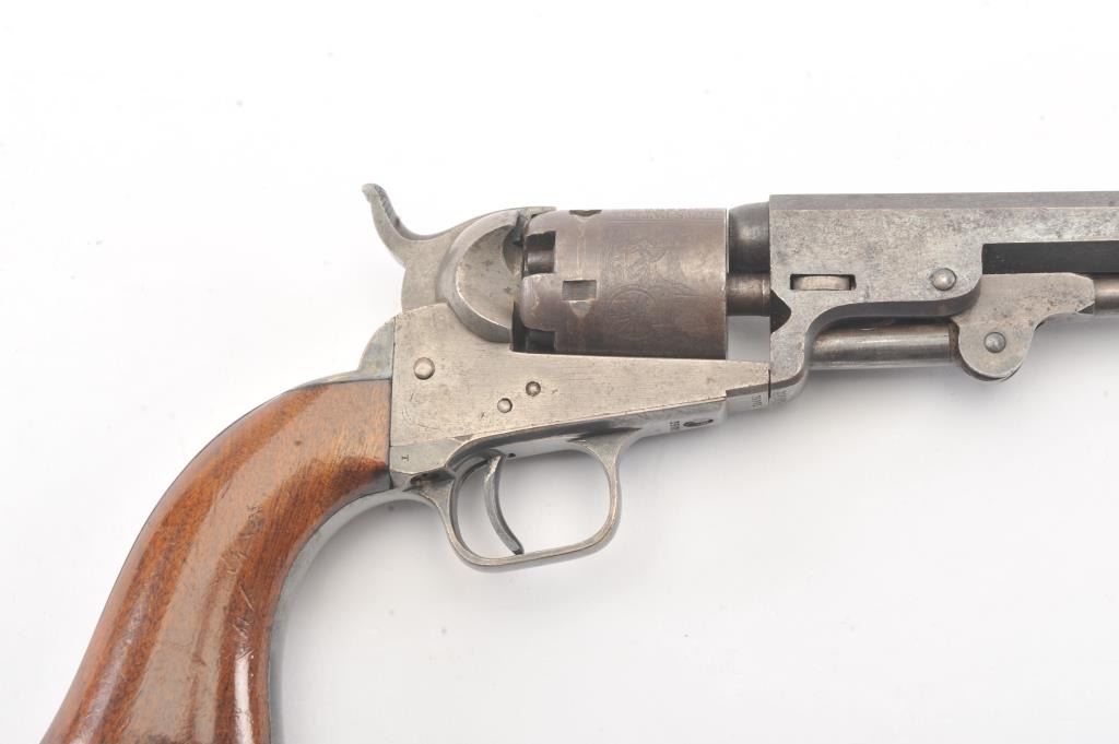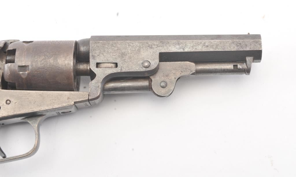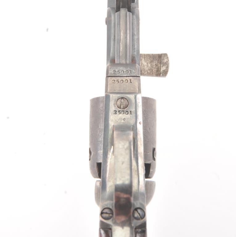 Colt 1849 Pocket Model .31 caliber percussion revolver with a 4" barrel, 2 line New York address, 5 shot, and small trigger guard, S/N 25001. Subject revolver remains in very good condition with 50%-70% aging and toning blue on the barrel and cylinder. Some scattered erosion and pinprick pitting. 50%-70% light original cylinder scene remains. 75%-85%darkened original silver plate. 75%-85%original varnish on very good plusgrips. 30%-50% early case hardening remains. Good markings and fairly crisp overall. All matching serial numbers. (Antique) Est.: $700-$1400