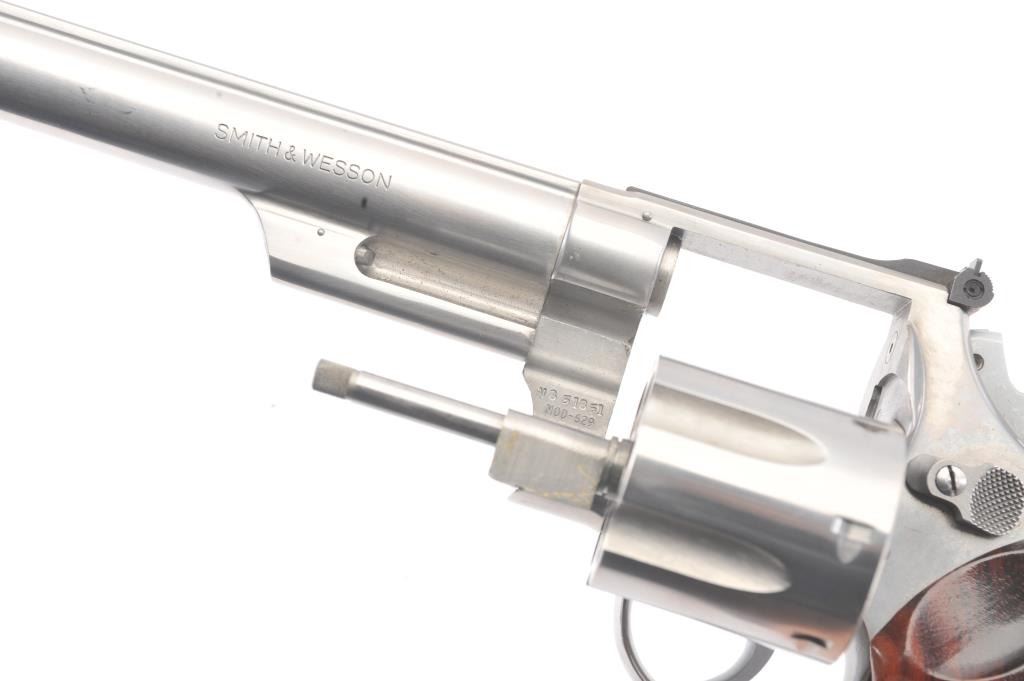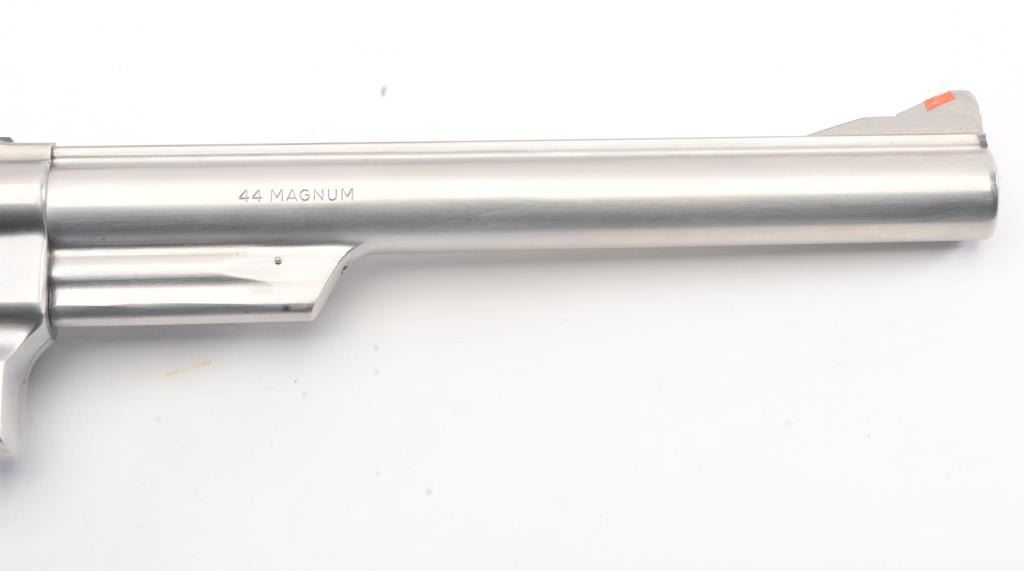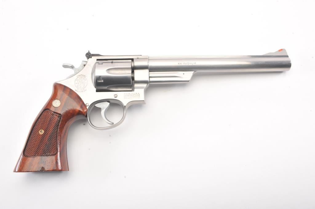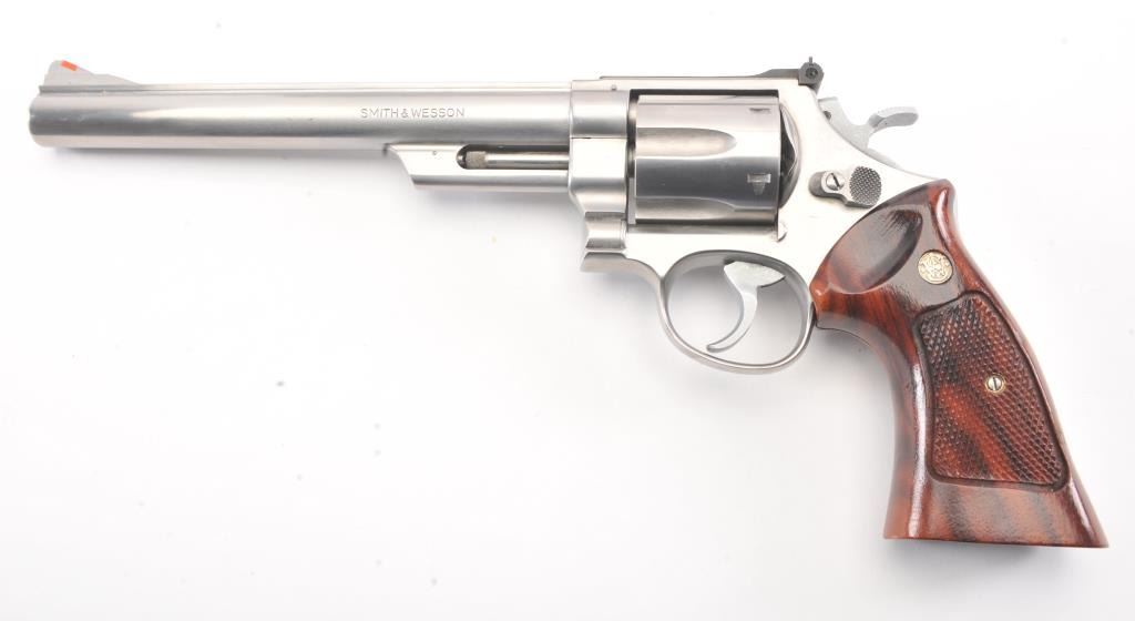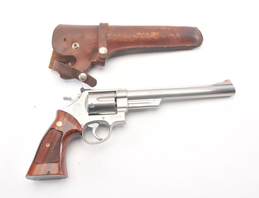 Smith & Wesson Model 629 DA revolver, .44 magnum caliber, Serial #N851851. The pistol is in fine overall condition with an 8 3/8” pinned barrel with an orange insert ramped blade front and adjustable rear sights. Thepistol retains nearly all of the stainless steel finish with wear at the muzzle and an index line on the cylinder. The checkered wood medallion grips are in excellent condition with sharp checkering and a smallflea bite chip at the bottom of the right panel. The bore is good, the action is crisp and the markings are sharp. The lot includes a Hunter leather Slim Jim belt holster. Est.: $700-$1,400. (Modern/PPT).