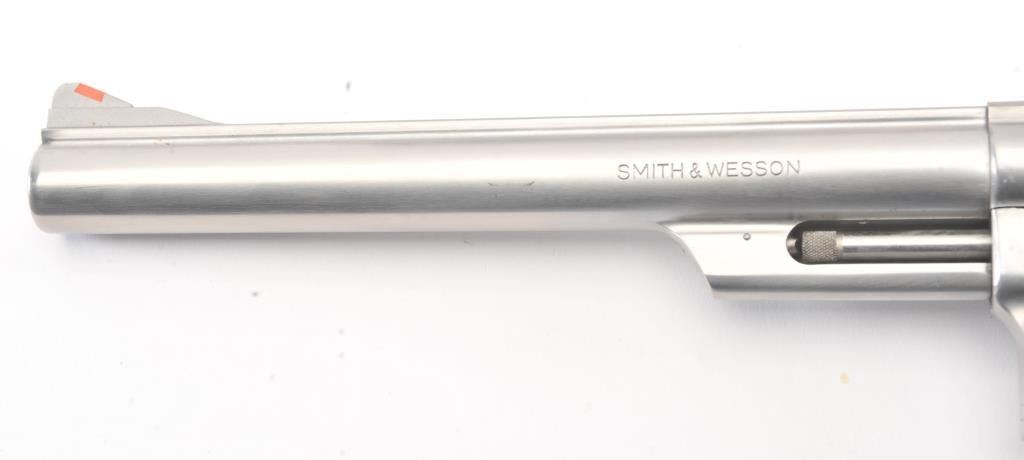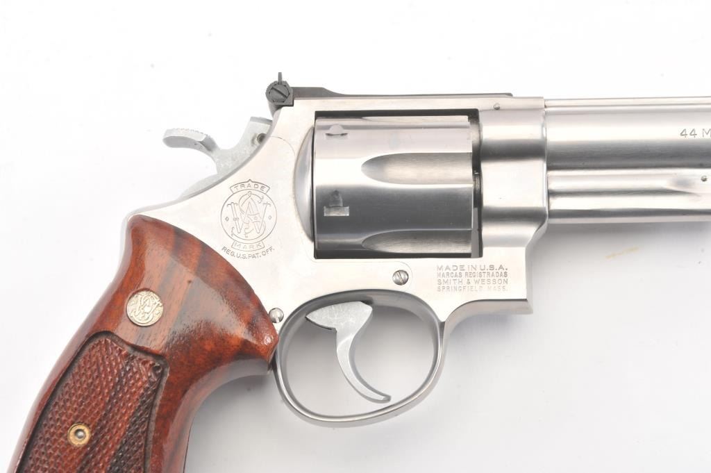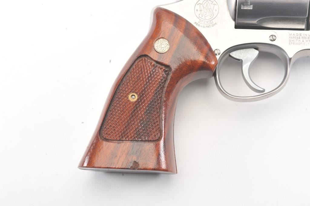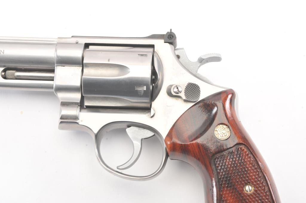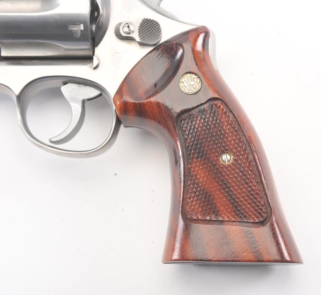 Smith & Wesson Model 629 DA revolver, .44 magnum caliber, Serial #N851851. The pistol is in fine overall condition with an 8 3/8” pinned barrel with an orange insert ramped blade front and adjustable rear sights. Thepistol retains nearly all of the stainless steel finish with wear at the muzzle and an index line on the cylinder. The checkered wood medallion grips are in excellent condition with sharp checkering and a smallflea bite chip at the bottom of the right panel. The bore is good, the action is crisp and the markings are sharp. The lot includes a Hunter leather Slim Jim belt holster. Est.: $700-$1,400. (Modern/PPT).