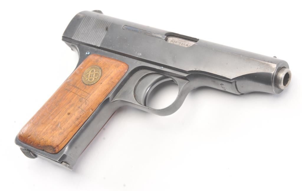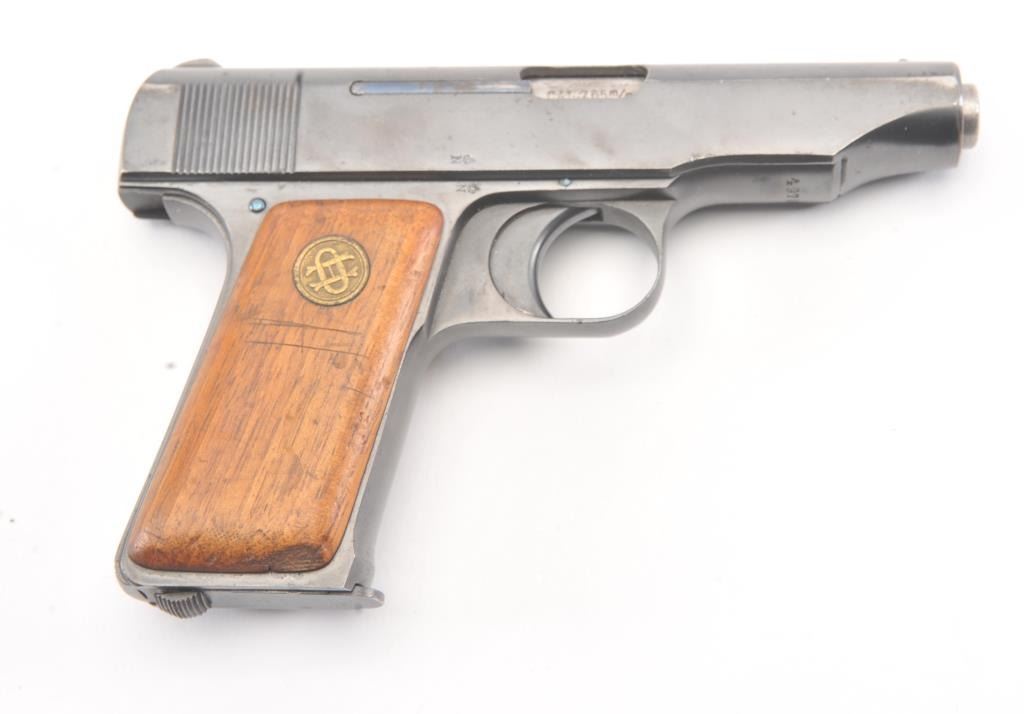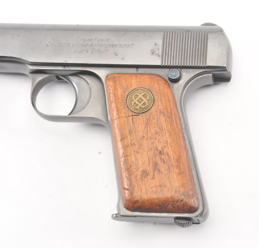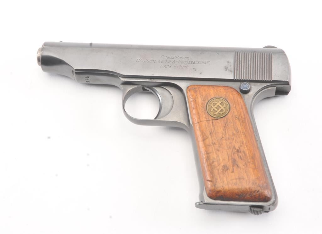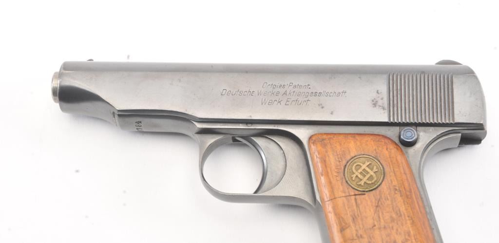 Ortgies Patent .32 Auto by DWM circa Pre-WWII, S/N 49784. Made at the same German factory that produced the Luger pistol in Germany. Very good condition with 85%-95% original blue. Some nicks to the originalgrips. Sharp and crisp with very good bore and correct mag. (C&R/PPT) Est.: $200-$400