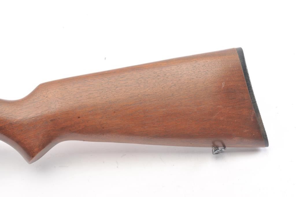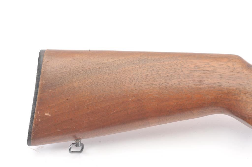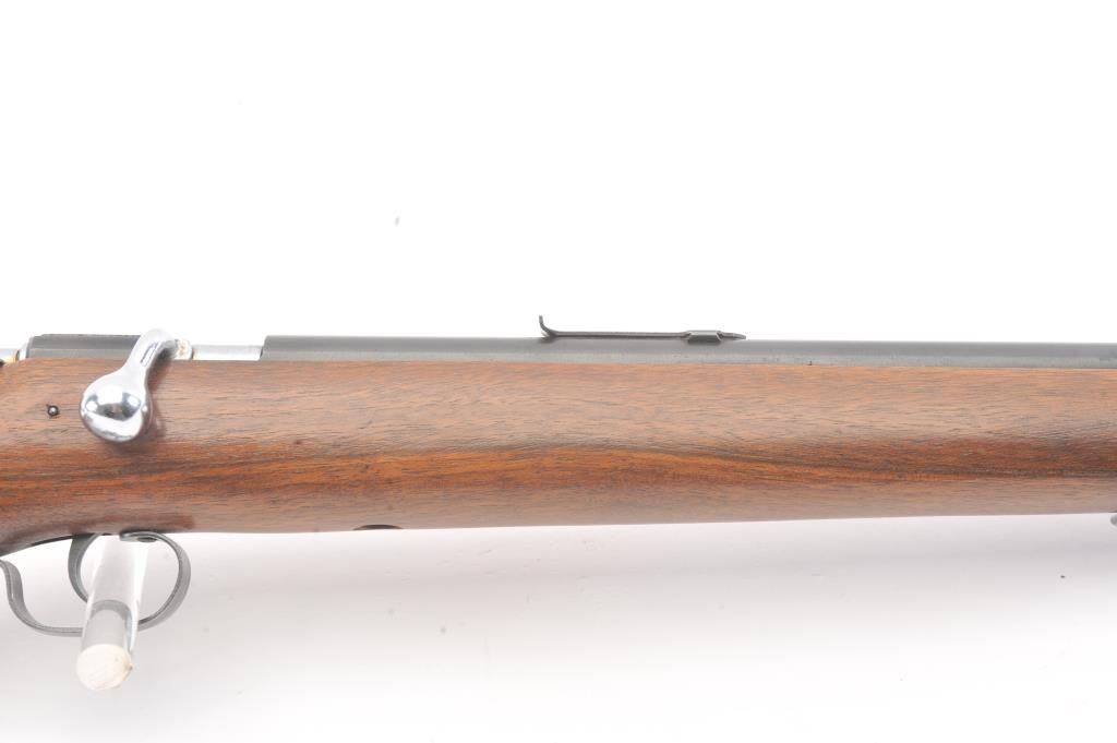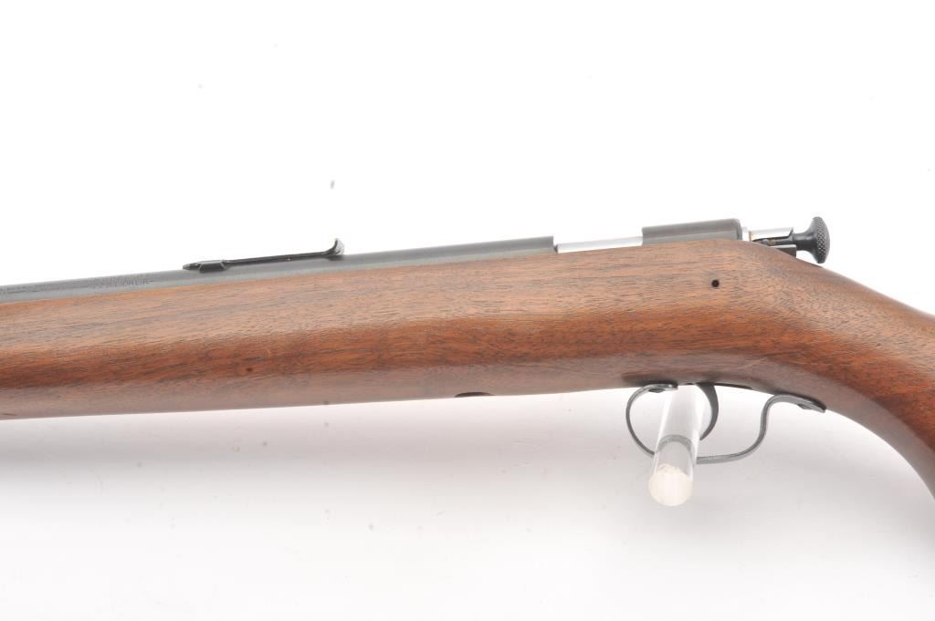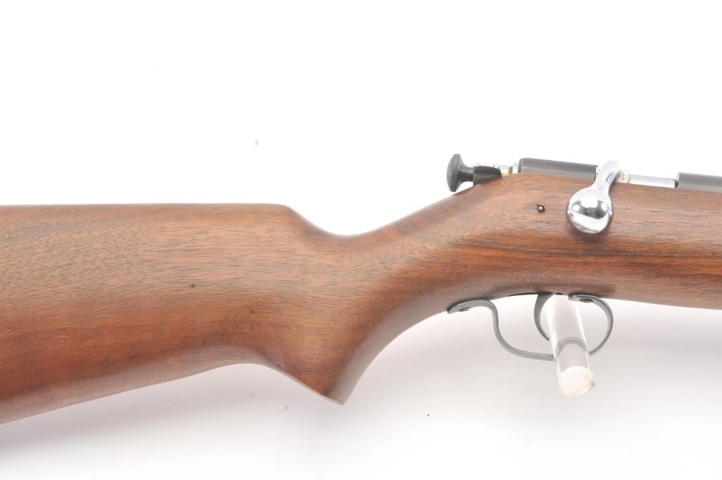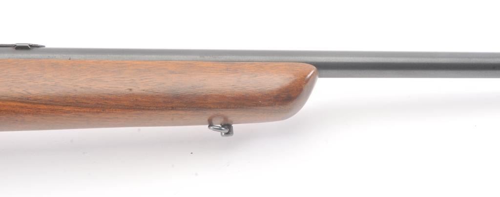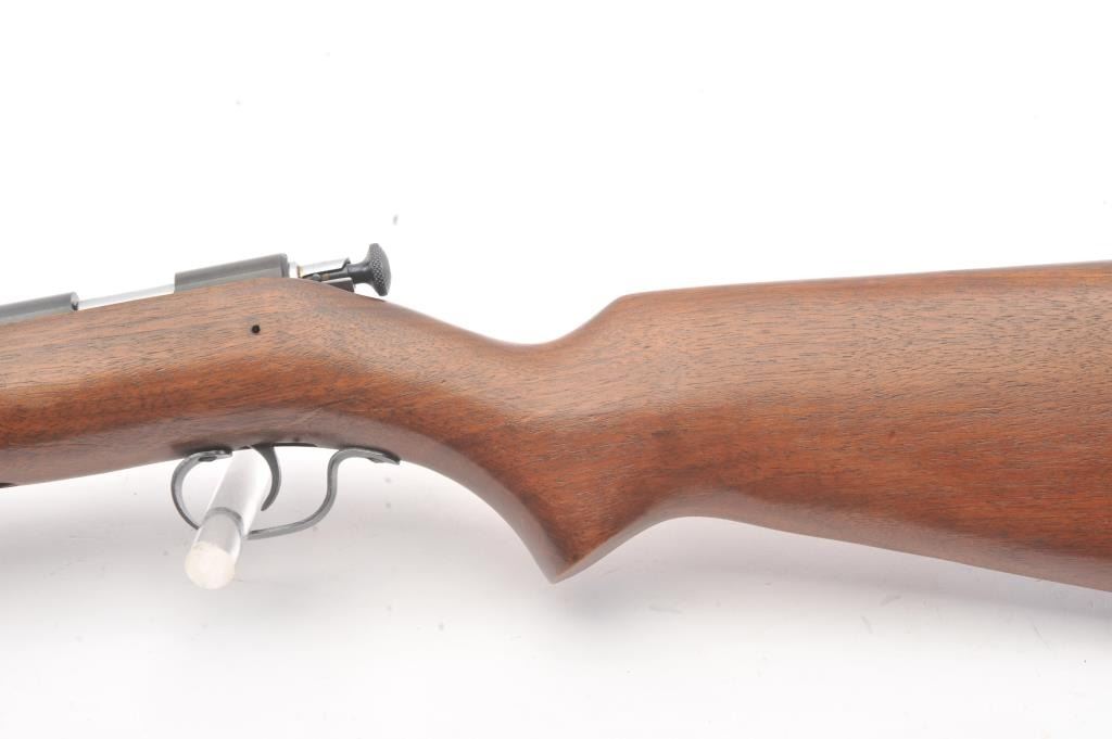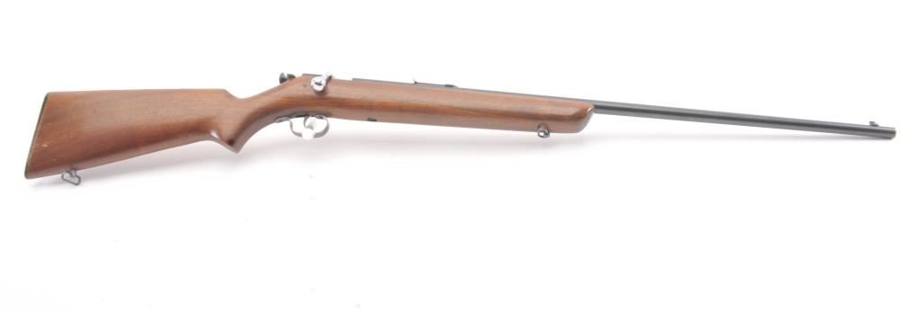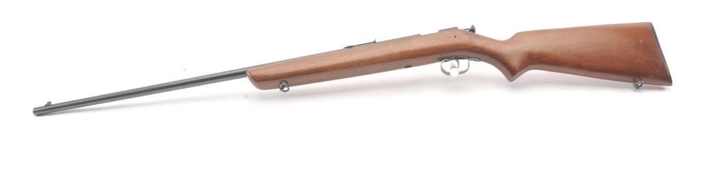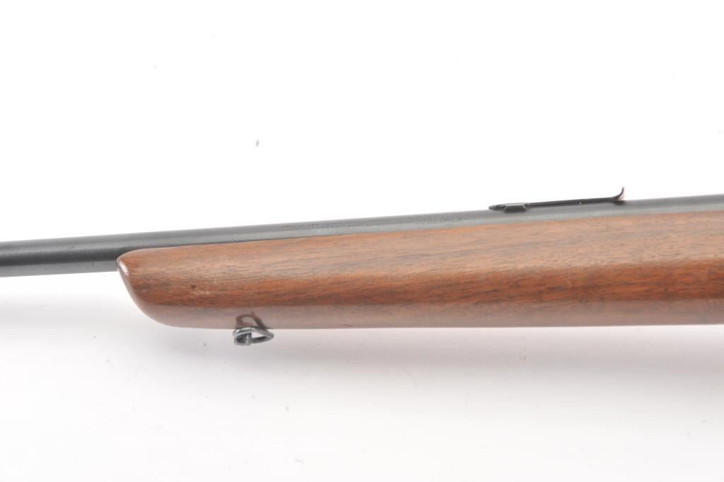 Winchester Model 67 single shot rifle, .22 S., L., or L.R. caliber, Serial #NSNV. The rifle is in nearly excellent overall condition with a 27” barrel. The rifle retains 95%-96% of the blue finish with achrome bolt handle and the elevator removed from the rear sight. The smooth wood stock is in very good condition with light handling marks and a checkered plastic Winchester marked butt plate. The bore is good,markings are sharp and the action is crisp on this nice Model 67 rifle produced from 1934-1960. Est.: $150-$300. (C+R).