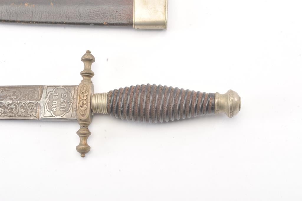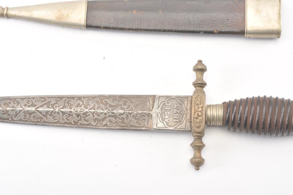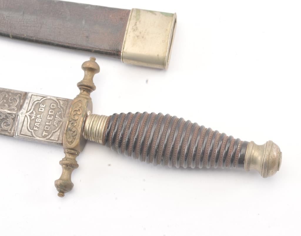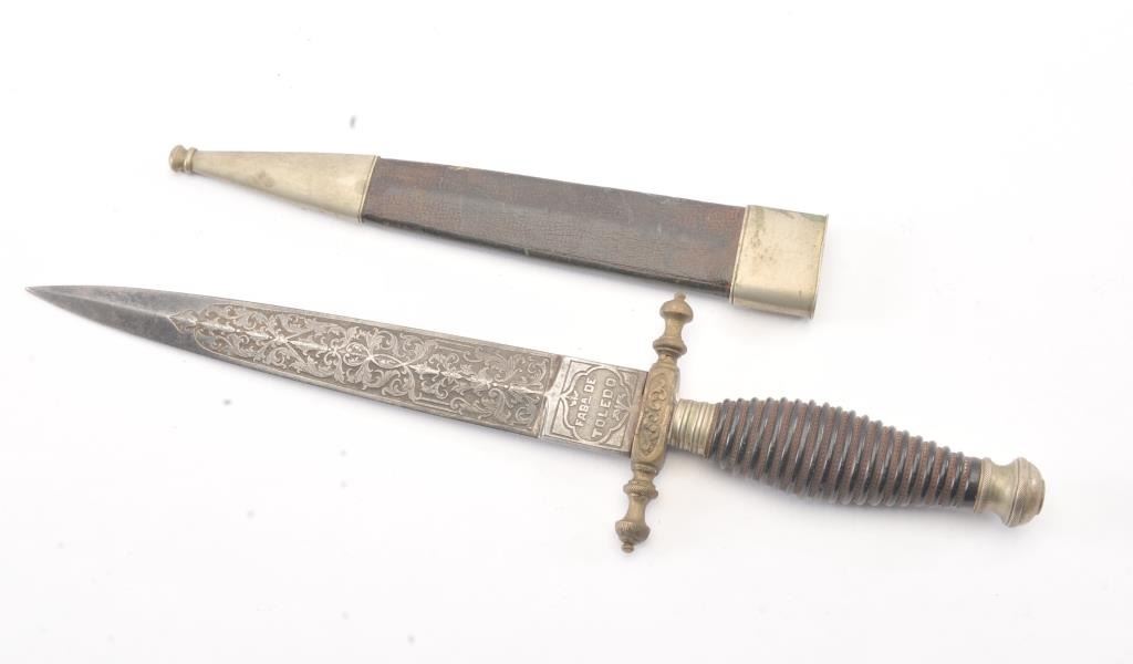 Fabrica De Toledo 19th century dagger with elaborate etched blade showing profuse patterns on each side and "Ano De 1873". Measures 12 1/2" overall with a 7 7/8" blade with fluted grip and scabbard. Very good plus overall. A good example. Est.: $200-$400