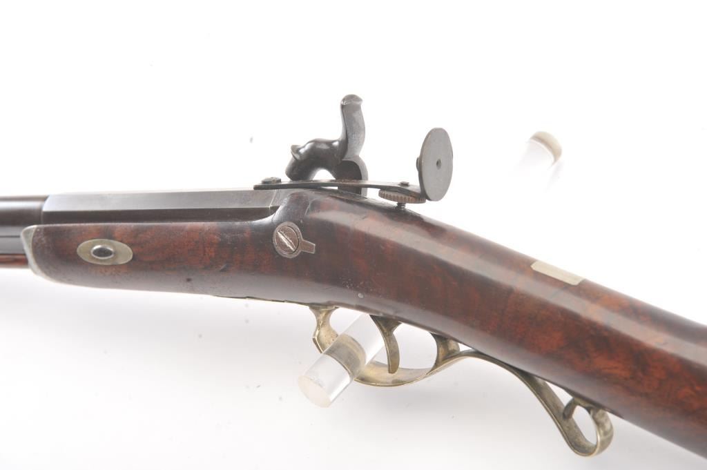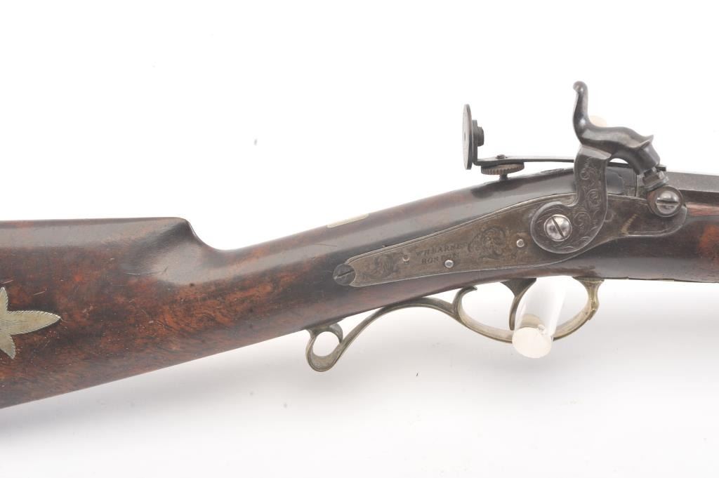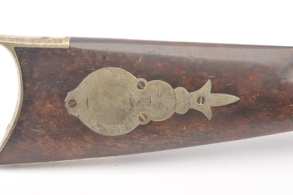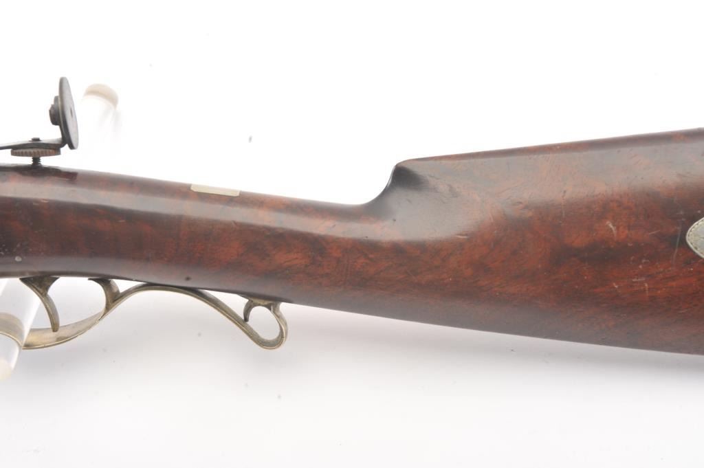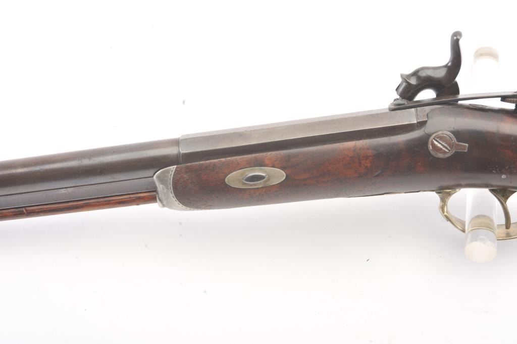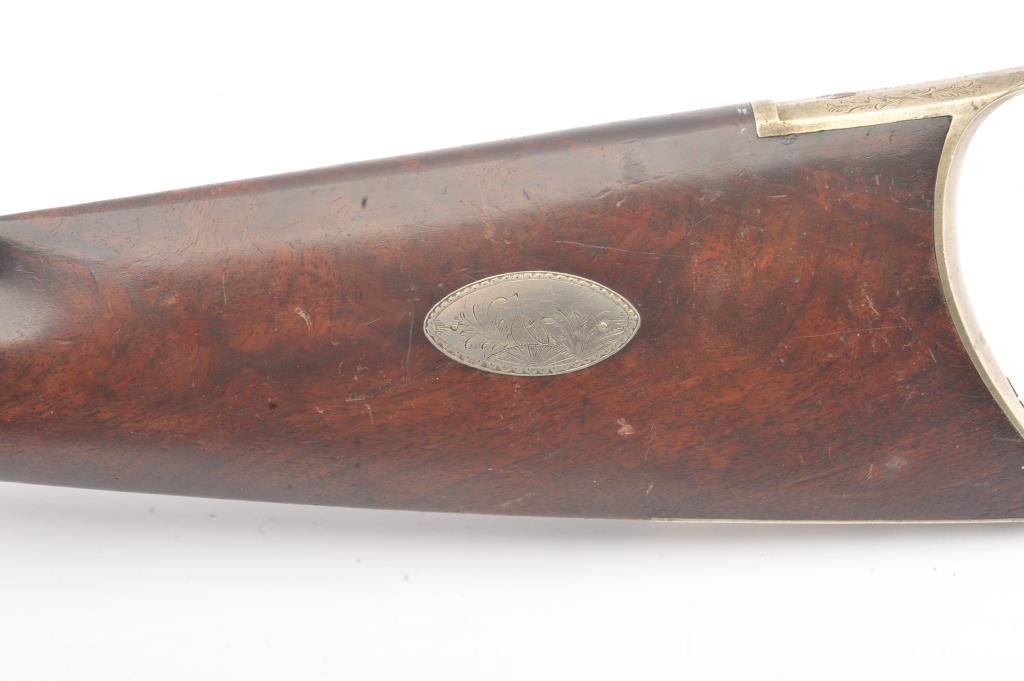 Good quality percussion “Buggy Rifle” circa about 1860 marked “W.H. Barnes Boston” on the back action lock. Measures 29 ½” overall with a 15 3/8” half round/half octagon barrel of approximately .36 caliber rifled. Tangand target front sight. Engraved German silver mounts. Most of the original brown on the barrel. Good to very good overall and would clean nicely. (Antique) Est.: $600-$1200