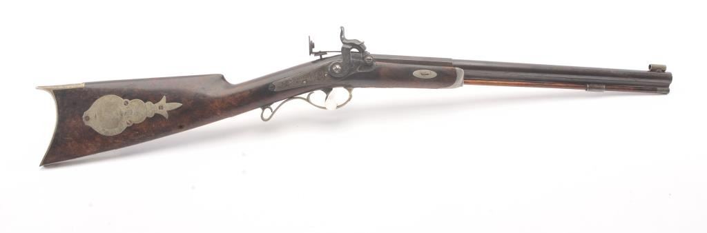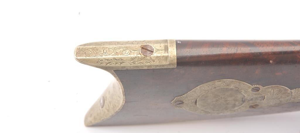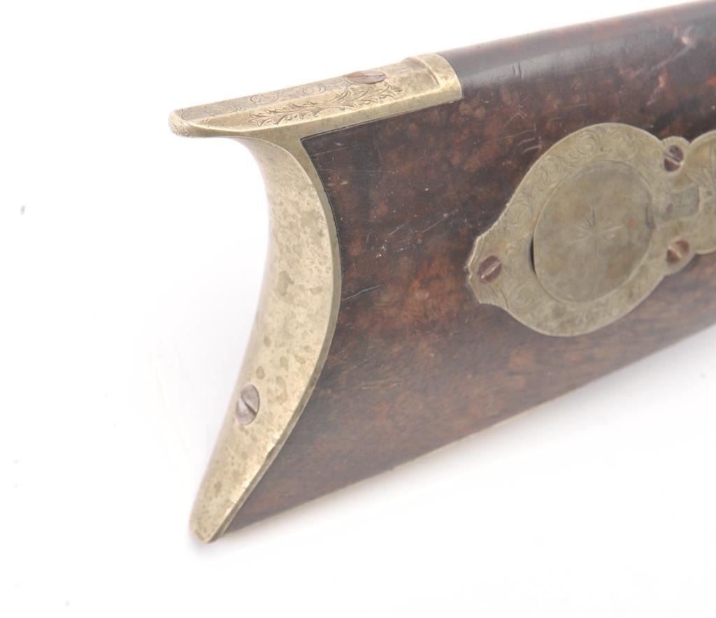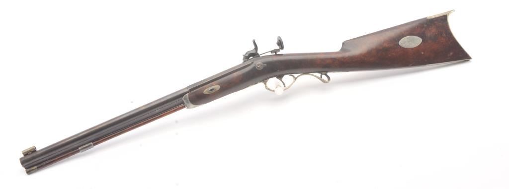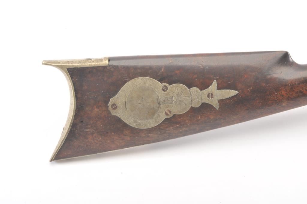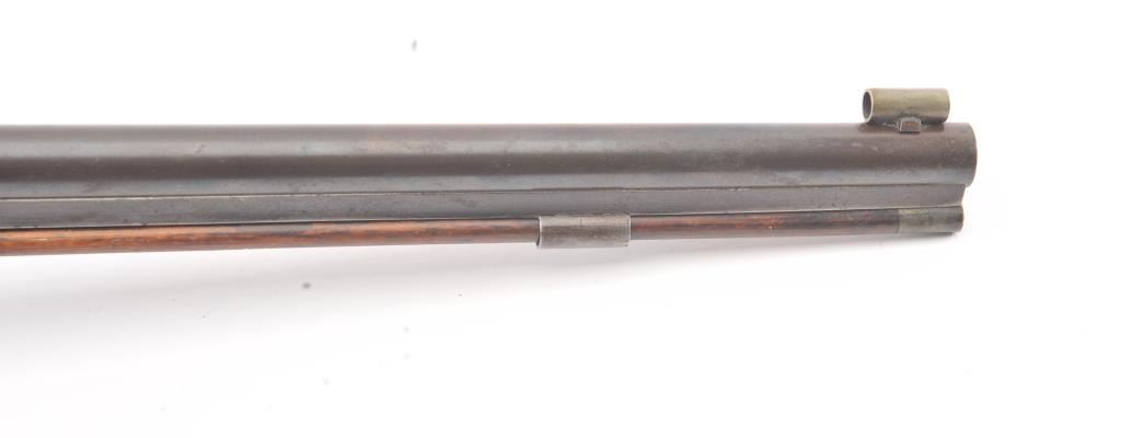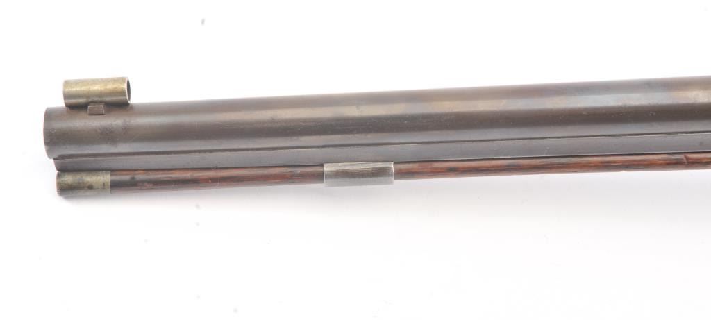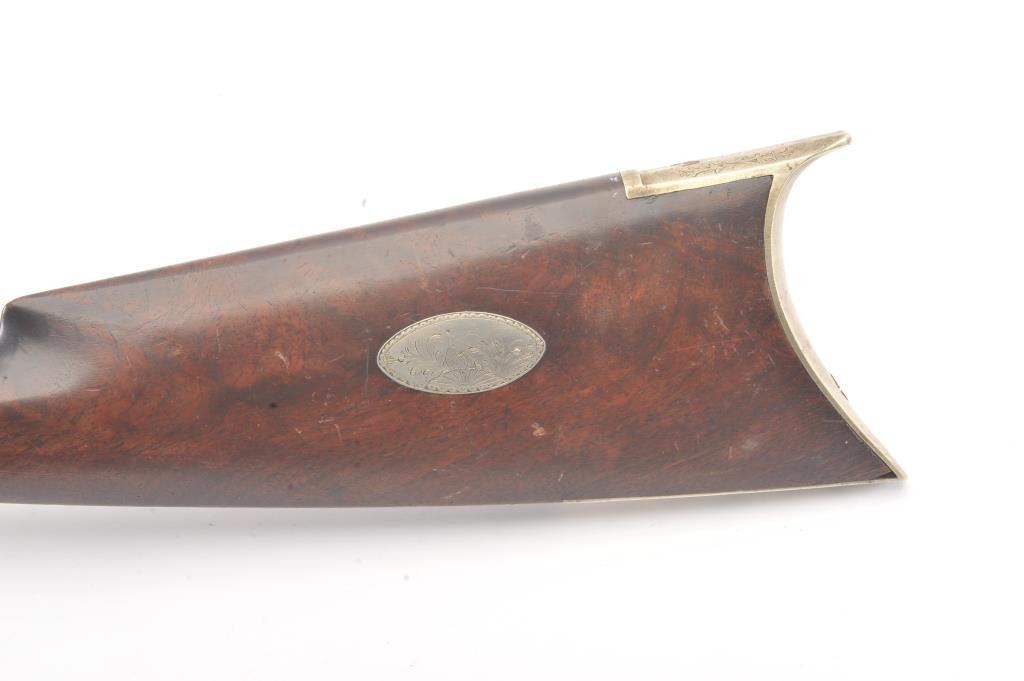 Good quality percussion “Buggy Rifle” circa about 1860 marked “W.H. Barnes Boston” on the back action lock. Measures 29 ½” overall with a 15 3/8” half round/half octagon barrel of approximately .36 caliber rifled. Tangand target front sight. Engraved German silver mounts. Most of the original brown on the barrel. Good to very good overall and would clean nicely. (Antique) Est.: $600-$1200