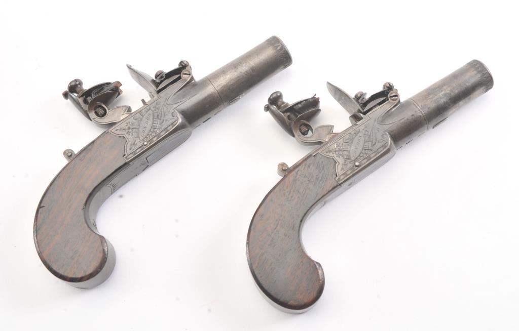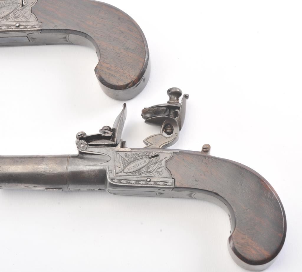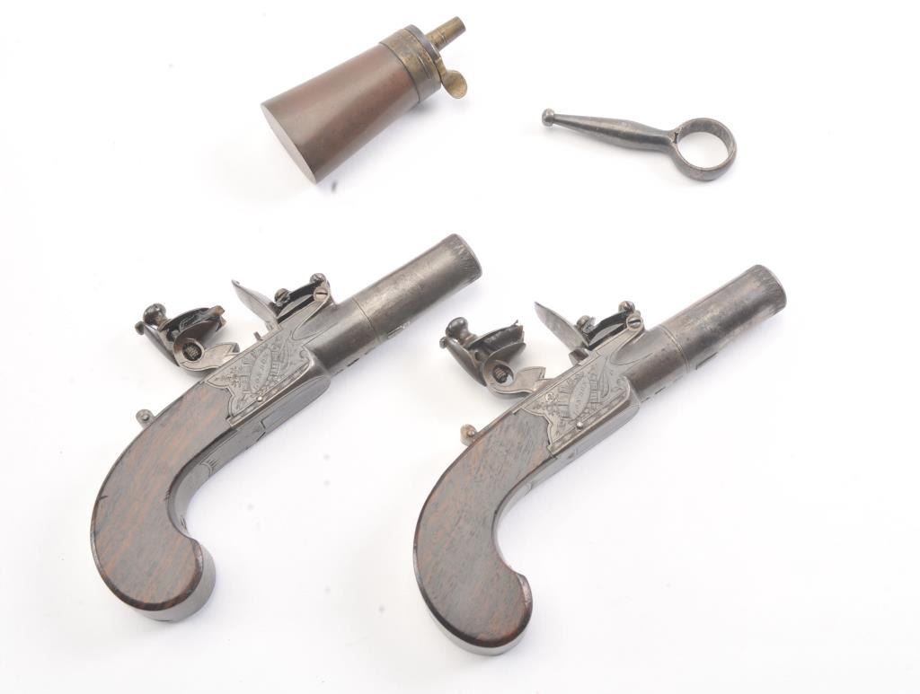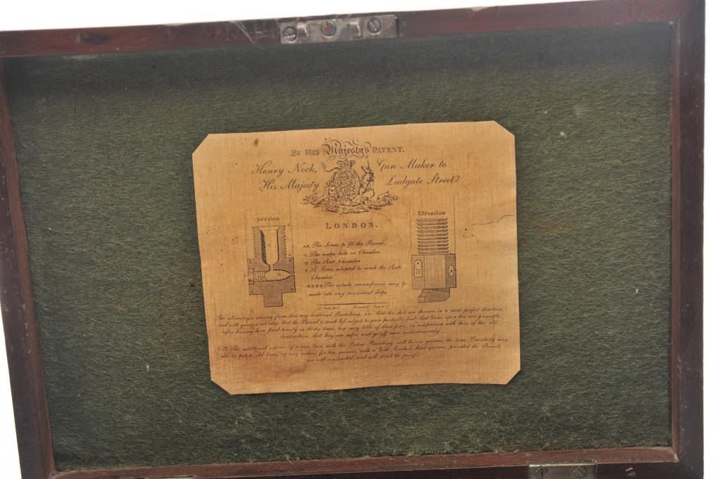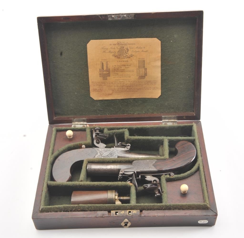 Pair of cased English center hammer flintlock pistols by "H. Nock London" with interesting patent advertising trade label in the lid. Measures 6 1/2" overall with 1 5/8" barrel of .46-.48 caliber smoothbore. Very good pluscondition showing toned bright and case colors with bright fire blue on the triggers and springs. Fine engraving and excellent quality throughout by well-known London maker. The stocks are very good plus withminor marks and aging. The "Wooley" felt is original lining and trade label is slightly discolored. The case interior is very good plus with just slight imperfections. Correct flaks and barrel wrench retained. Originalkey retained also and the exterior of the box is good with minor scratches and normal storage marks. A quality set. (Antique) Est.: $1000-$2000