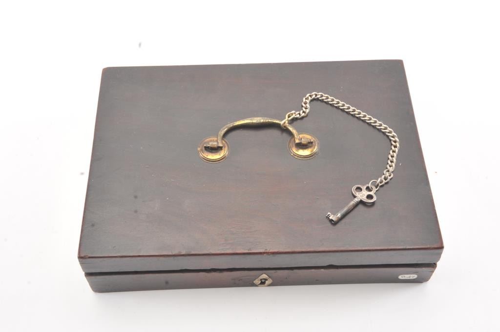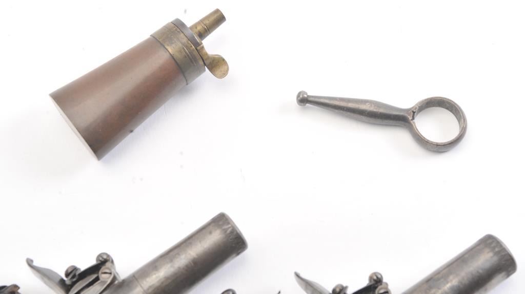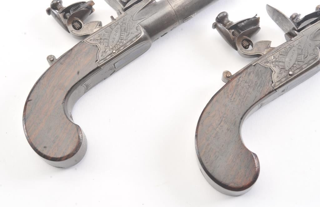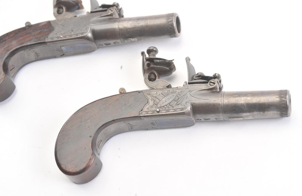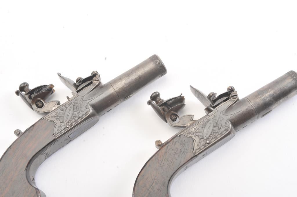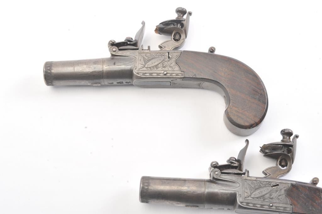 Pair of cased English center hammer flintlock pistols by "H. Nock London" with interesting patent advertising trade label in the lid. Measures 6 1/2" overall with 1 5/8" barrel of .46-.48 caliber smoothbore. Very good pluscondition showing toned bright and case colors with bright fire blue on the triggers and springs. Fine engraving and excellent quality throughout by well-known London maker. The stocks are very good plus withminor marks and aging. The "Wooley" felt is original lining and trade label is slightly discolored. The case interior is very good plus with just slight imperfections. Correct flaks and barrel wrench retained. Originalkey retained also and the exterior of the box is good with minor scratches and normal storage marks. A quality set. (Antique) Est.: $1000-$2000