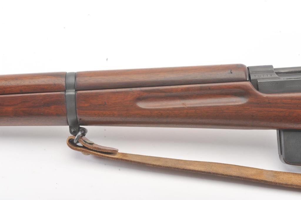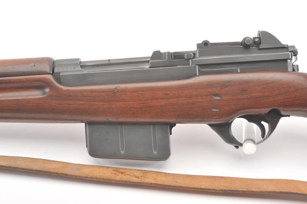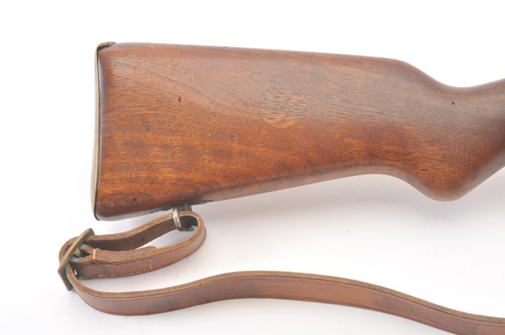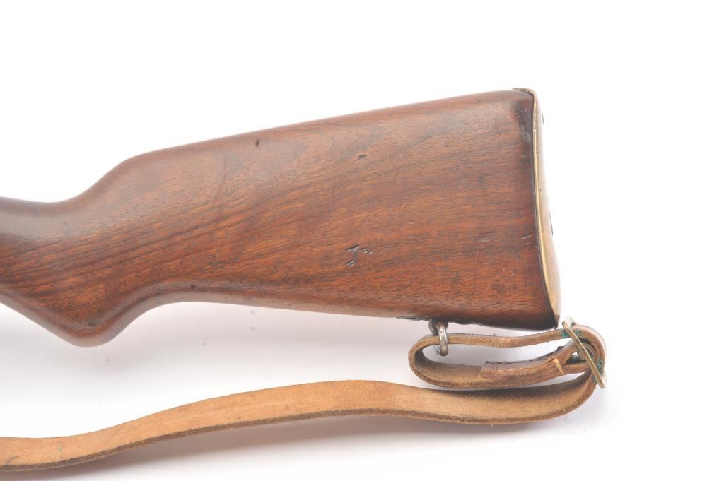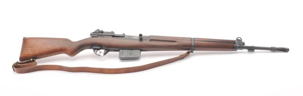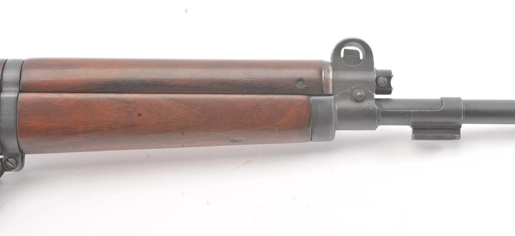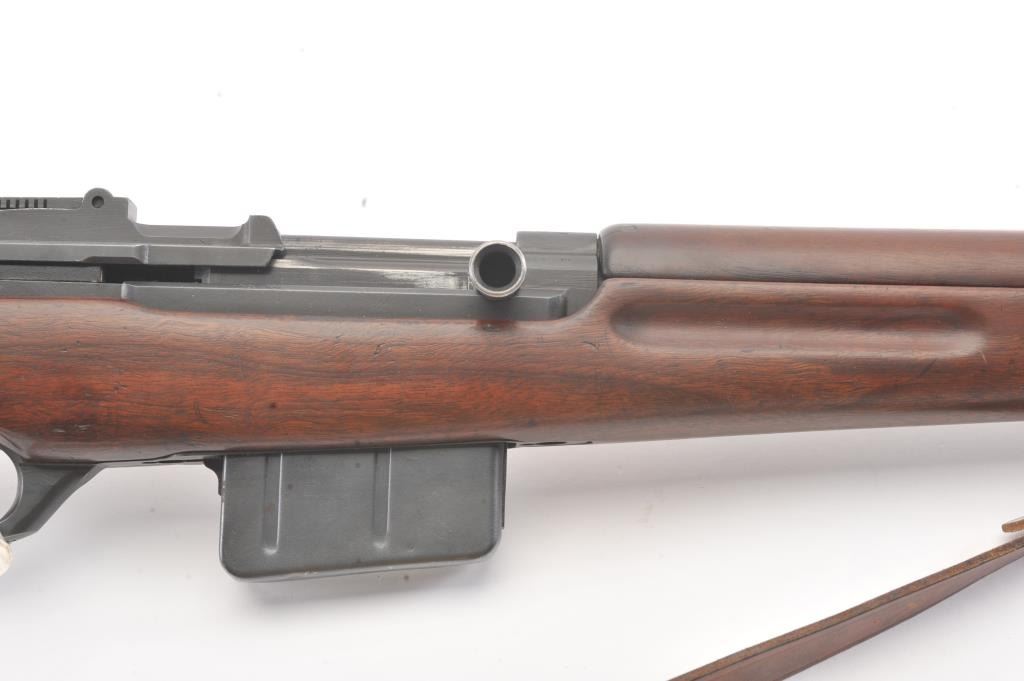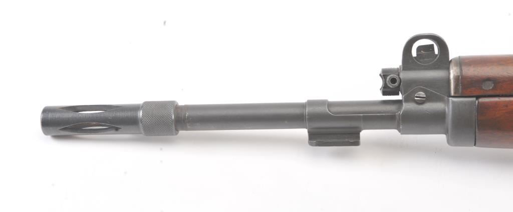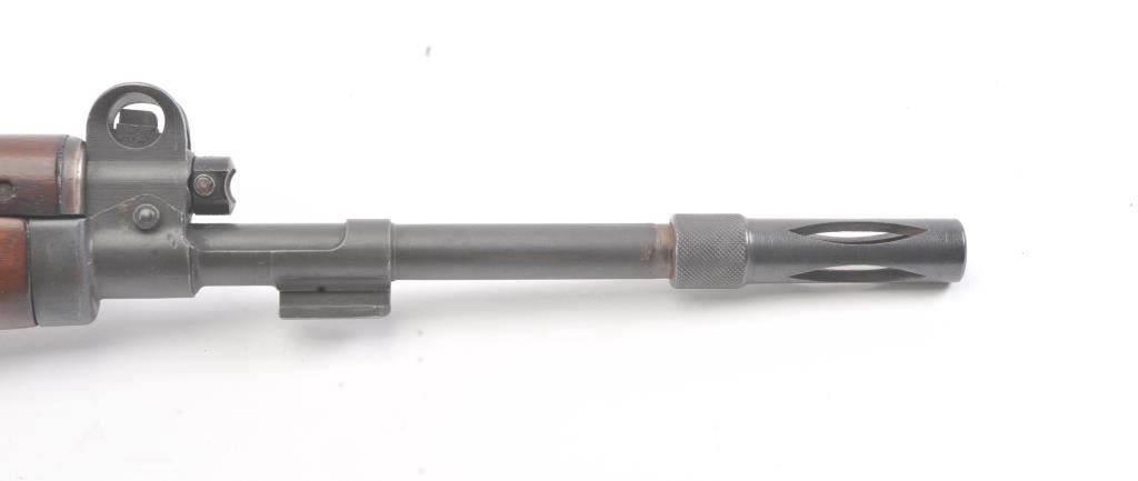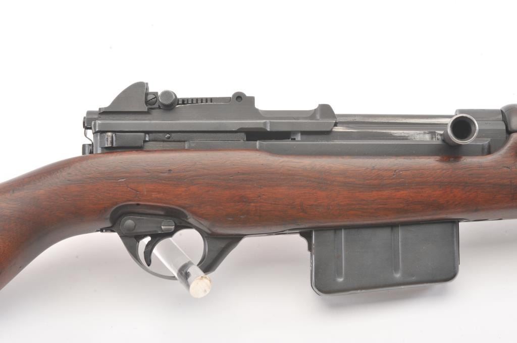 Egyptian FN 49 semi-automatic rifle, 8 x 57 caliber, Serial #25327. The rifle is in fine overall condition with a 25” barrel with a 3” after-market muzzle break, protected blade front sight and military tangent style rearsight. The rifle retains nearly all of the military finish with Egyptian crest on the front ring and Egyptian script. The smooth wood stock is in very good condition with sling swivels, sling and smooth brass buttplate. The bore is good, the action is crisp and the markings are sharp. Est.: $800-$1,600. (C+R).