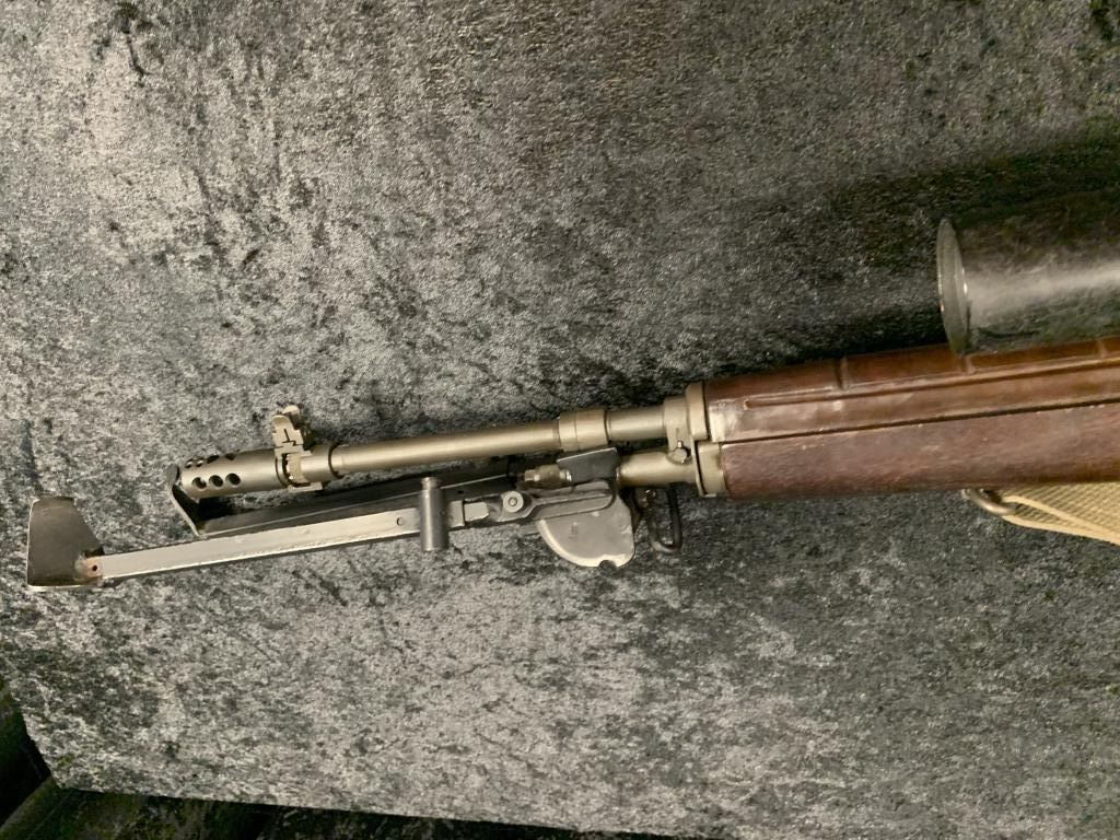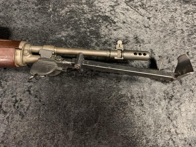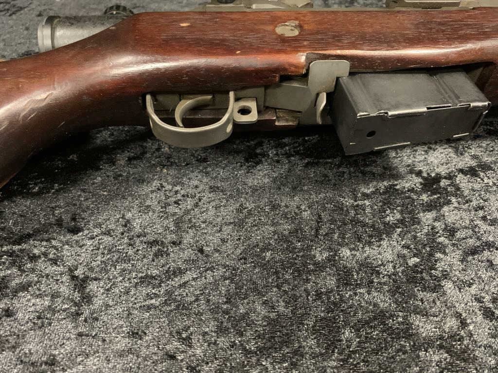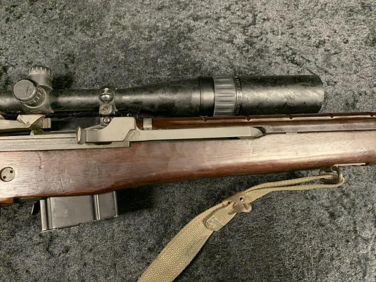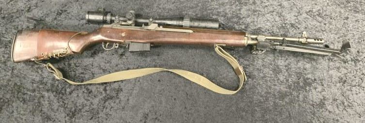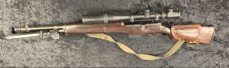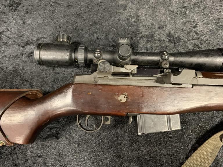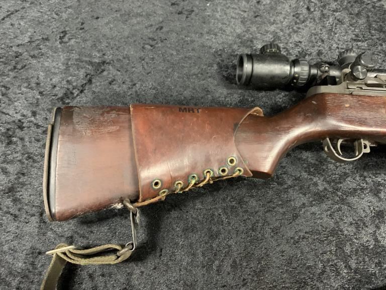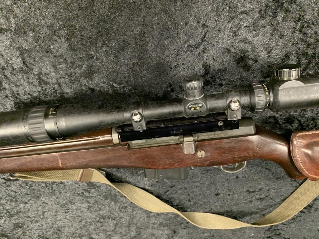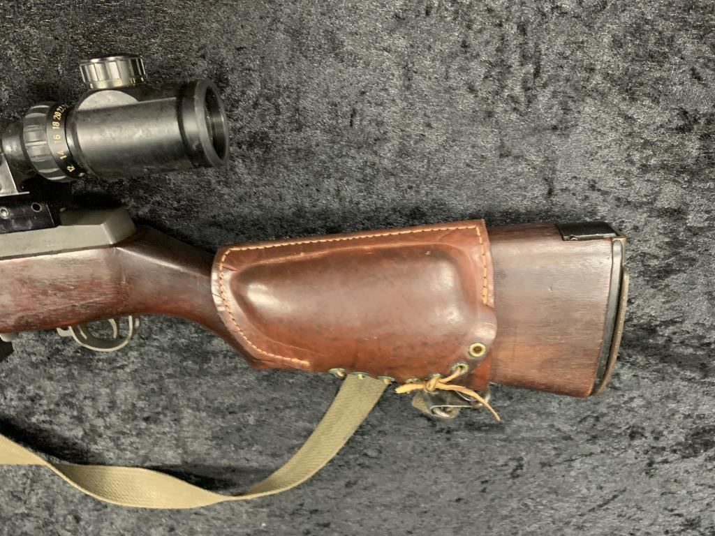 Chinese Norinco M1A semi-automatic sniper rifle, .308 Winchester caliber, Serial #000563. The rifle is in fine overall condition with a 24” barrel with an after-market muzzle break, protected bladefront and standard rear aperture sight. The rifle retains nearly all of the military finish with mars and scratches consistent with carry and use. A folding steel bi-pod has been added during the period of use. The smooth wood stock is in very good condition showing light to moderate use. Sling swivels, a canvas sling and a lace-on leather cheek piece have been added. The rifle is topped with a B-Square picatinny rail systemand a BSA 6 x 24 variable power scope with an adjustable objective and sunshade. The bore is good, the action is crisp and the markings are sharp on this scarce Chinese import of the M1A. Est.: $900-$1,800.(Modern).