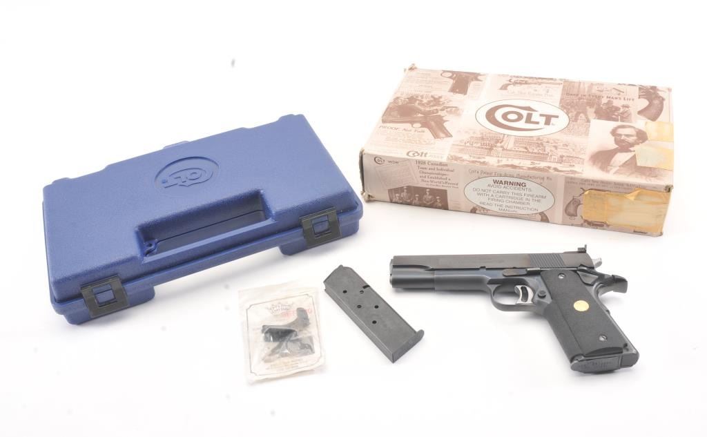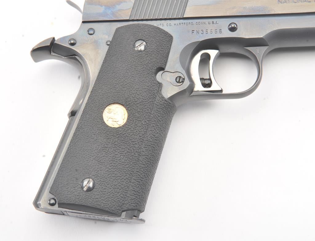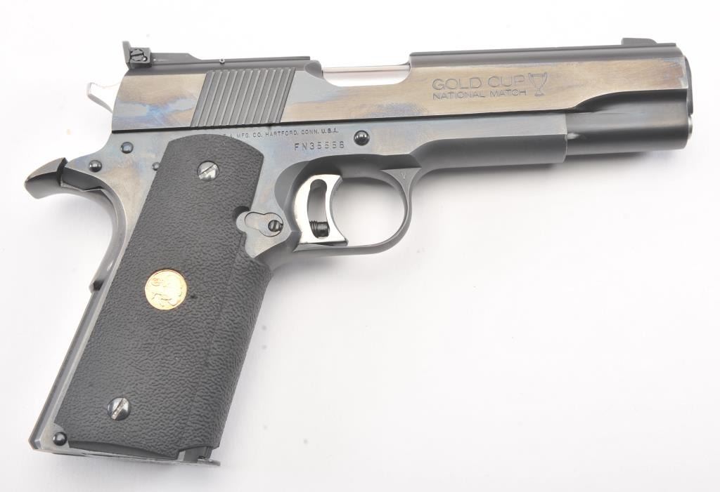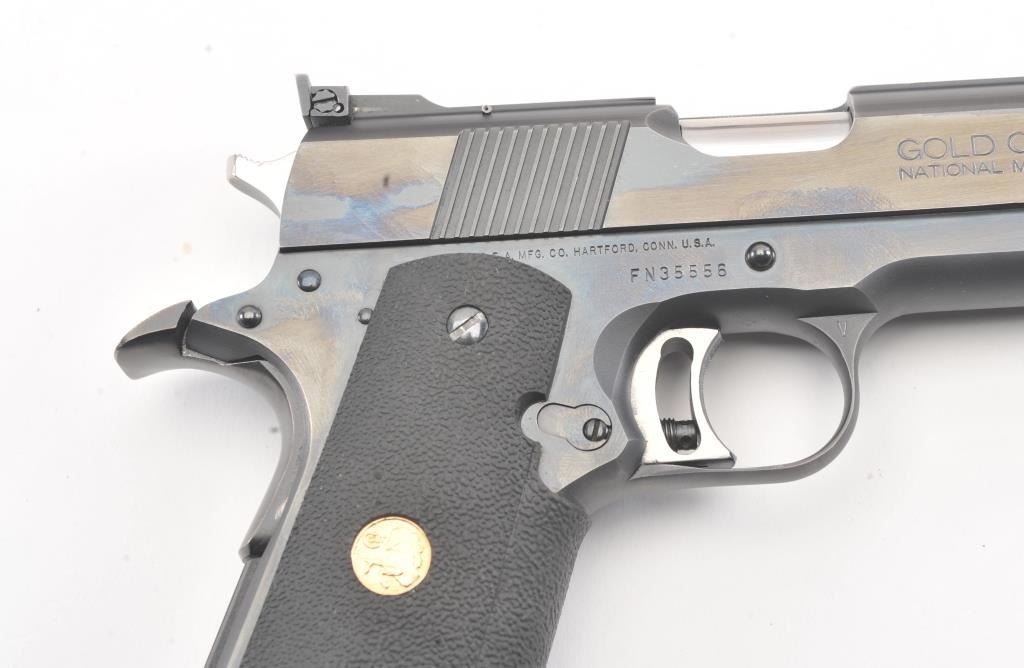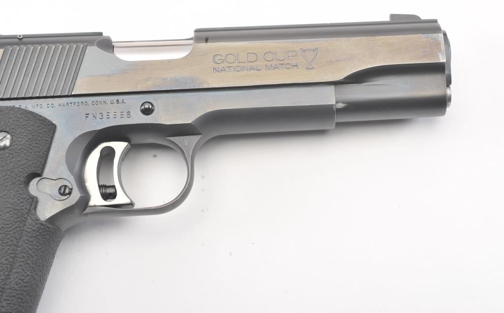 Colt Series 80 MK. IV Gold Cup National Match semi-automatic pistol, .45 ACP caliber, Serial #FN35556. The pistol is in nearly excellent overall condition with a 5” barrel with a blade front and adjustable Elliasonrear sights. The pistol retains approximately 98%-99% of the blue finish with the hammer bobbed, manual safety slightly trimmed and a beavertail grip safety added. The textured rubber Colt medallion grips arein very good condition. The pistol comes in the factory blue plastic case and cardboard sleeve with all associated packaging materials, manual, an extra King’s wide grip safety and two correct magazines. The action is crisp, the markings are sharp and the bore is very good on this desirable, lightly used Series 80 Gold Cup. Est.: $1,100-$2,200. (Modern/PPT).