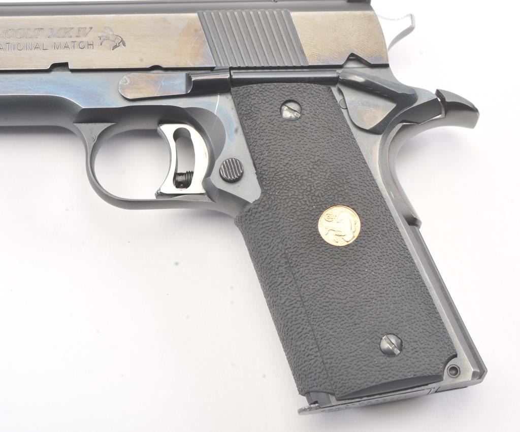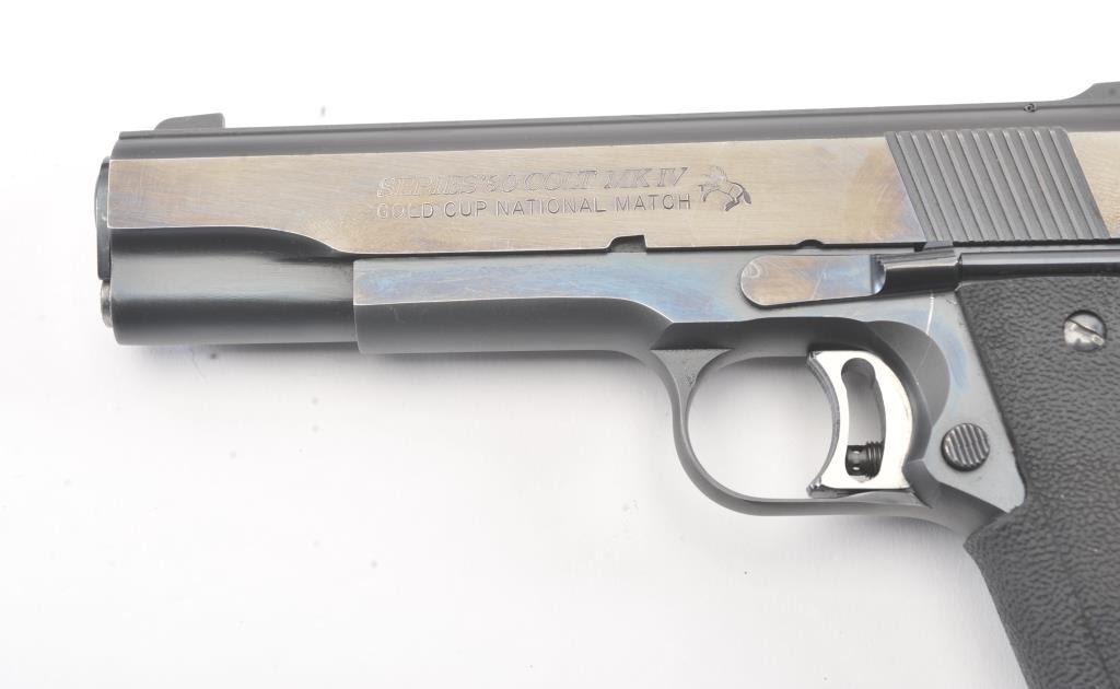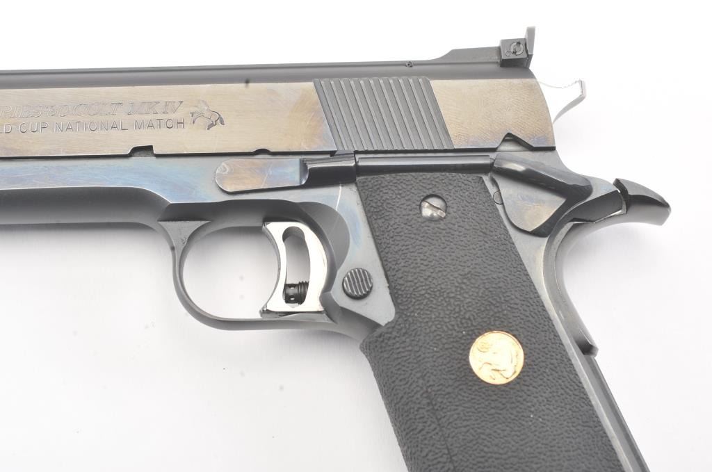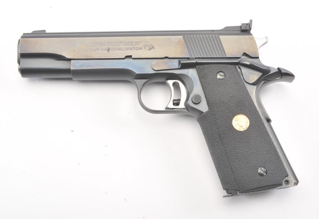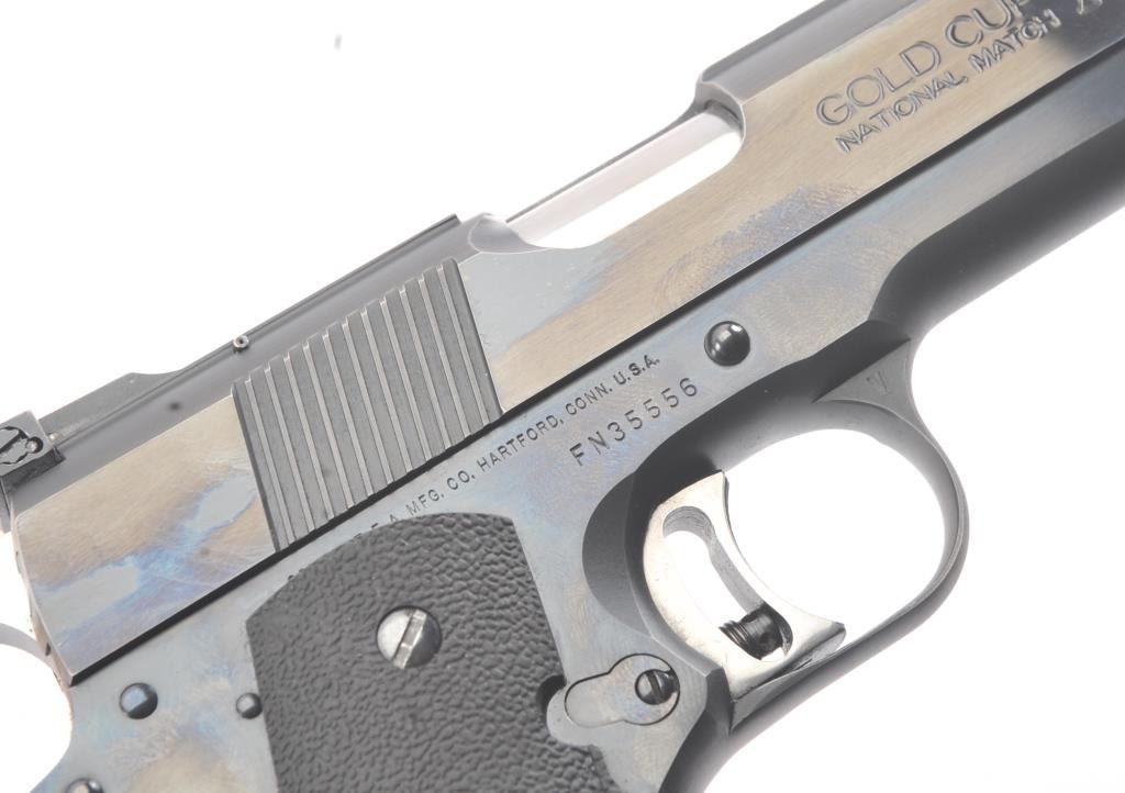 Colt Series 80 MK. IV Gold Cup National Match semi-automatic pistol, .45 ACP caliber, Serial #FN35556. The pistol is in nearly excellent overall condition with a 5” barrel with a blade front and adjustable Elliasonrear sights. The pistol retains approximately 98%-99% of the blue finish with the hammer bobbed, manual safety slightly trimmed and a beavertail grip safety added. The textured rubber Colt medallion grips arein very good condition. The pistol comes in the factory blue plastic case and cardboard sleeve with all associated packaging materials, manual, an extra King’s wide grip safety and two correct magazines. The action is crisp, the markings are sharp and the bore is very good on this desirable, lightly used Series 80 Gold Cup. Est.: $1,100-$2,200. (Modern/PPT).