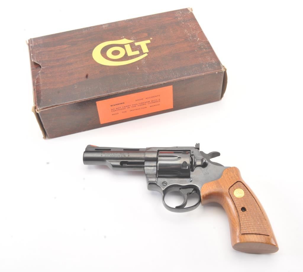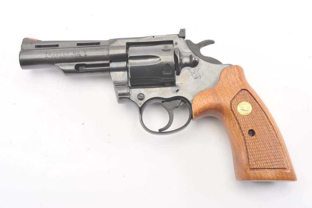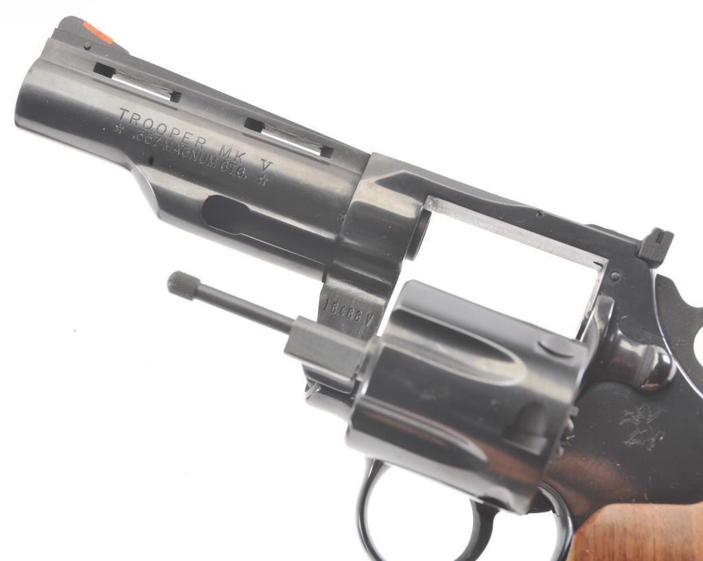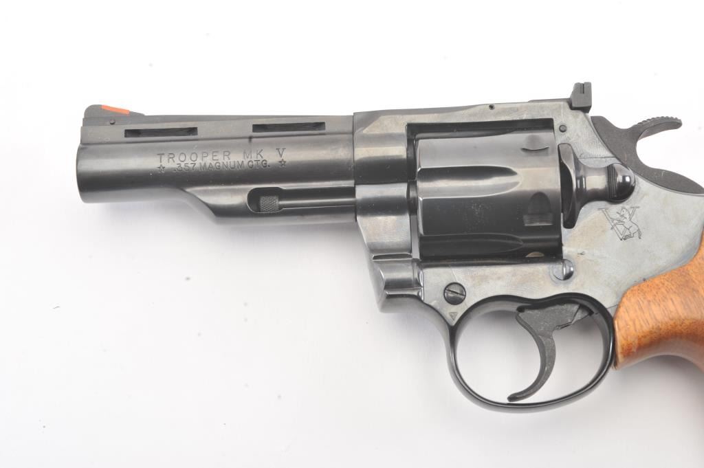 Trooper MK5 Double Action Revolver in .357 Mag. caliber with a 4" barrel, blued finish, and box, S/N 184687. Excellent to mint showing no signs of use just possibly test firing. 99% to mint with tag andinstructions. Vent rib. (Modern/PPT) Est.: $600-$1200