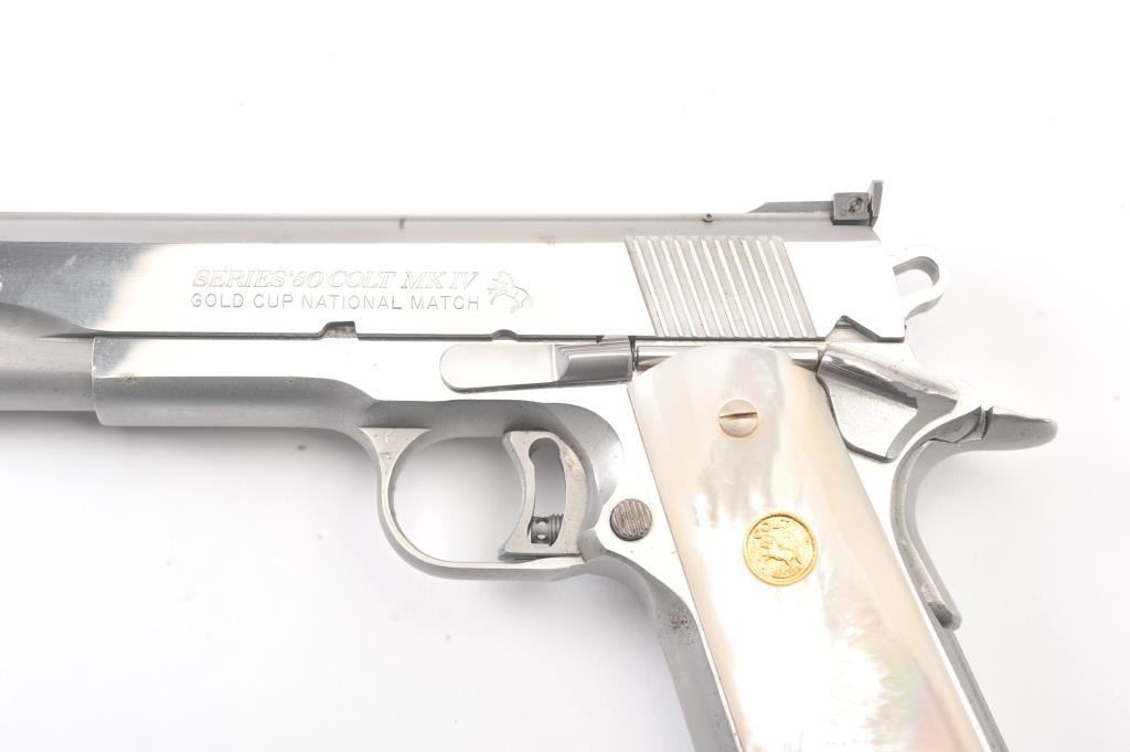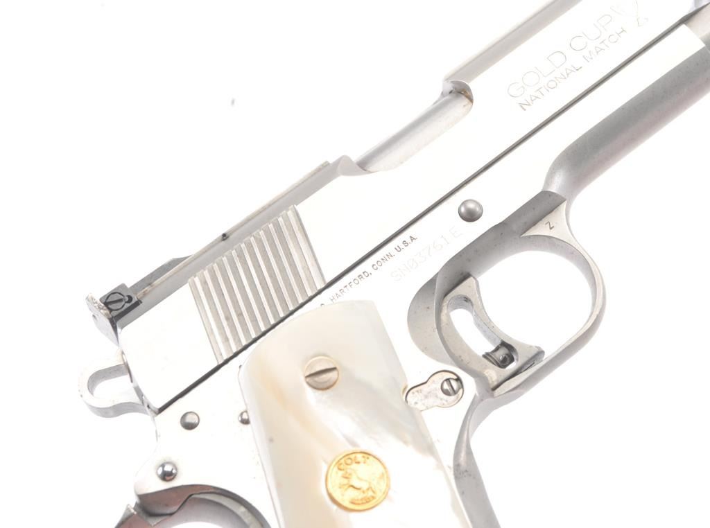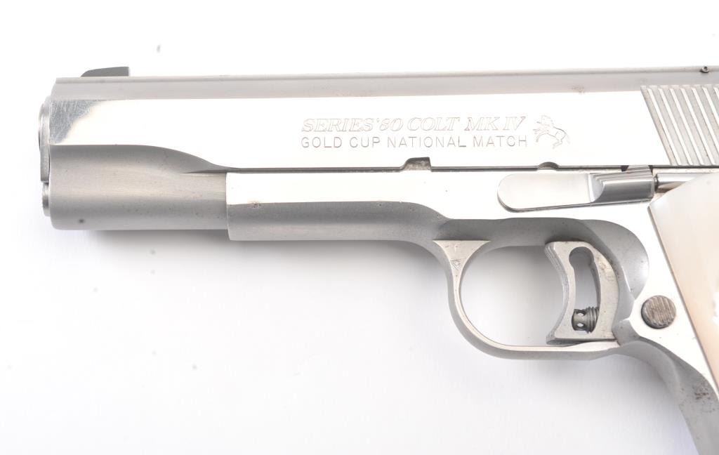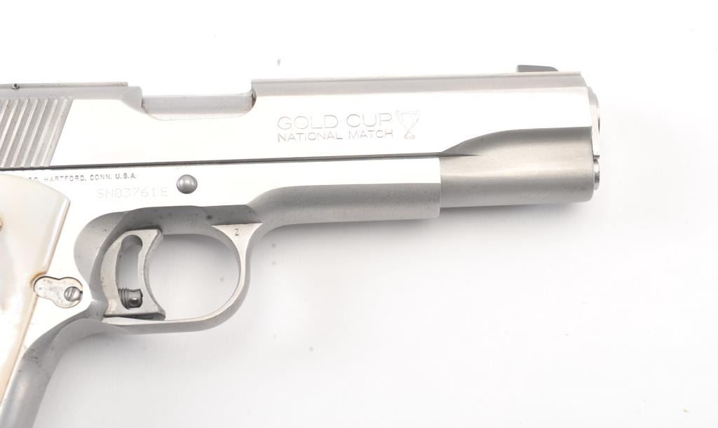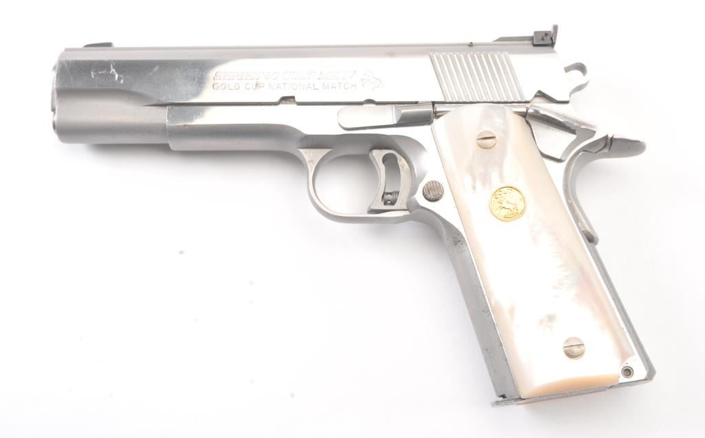 Colt Series 80 MK. IV Gold Cup National Match semi-automatic pistol, .45 ACP caliber, Serial #SN03761E. The pistol is in fine overall condition with a 5” barrel with a blade front and adjustable Elliason rearsights. The pistol retains approximately 94%-96% of the stainless steel finish with small scratches and light surface erosion on the front strap. The smooth Pearlite medallion grips are in very good condition.The pistol comes in the factory wood grain cardboard box with all associated packaging materials, manual and two correct magazines. The action is crisp, the markings are sharp and the bore is good on this desirable Series 80 Gold Cup. Est.: $1,200-$2,400. (Modern/PPT).