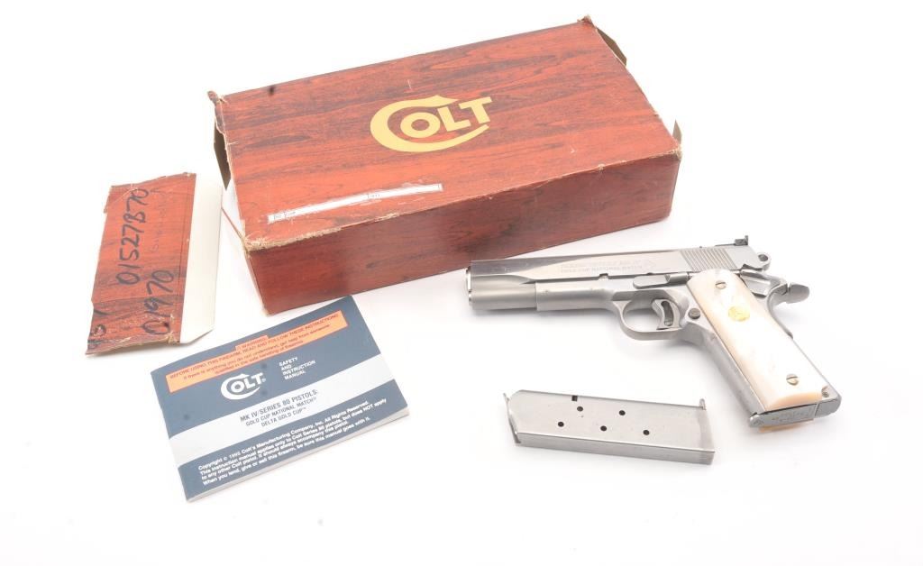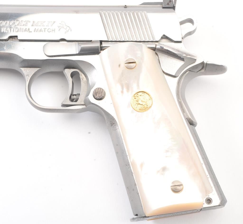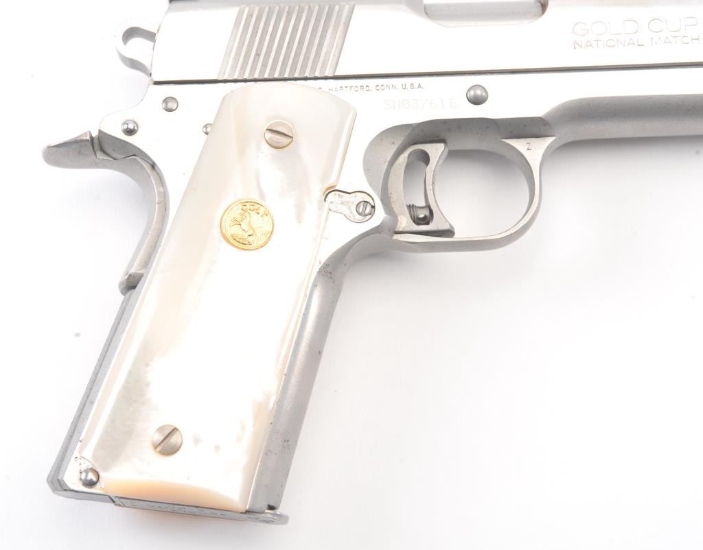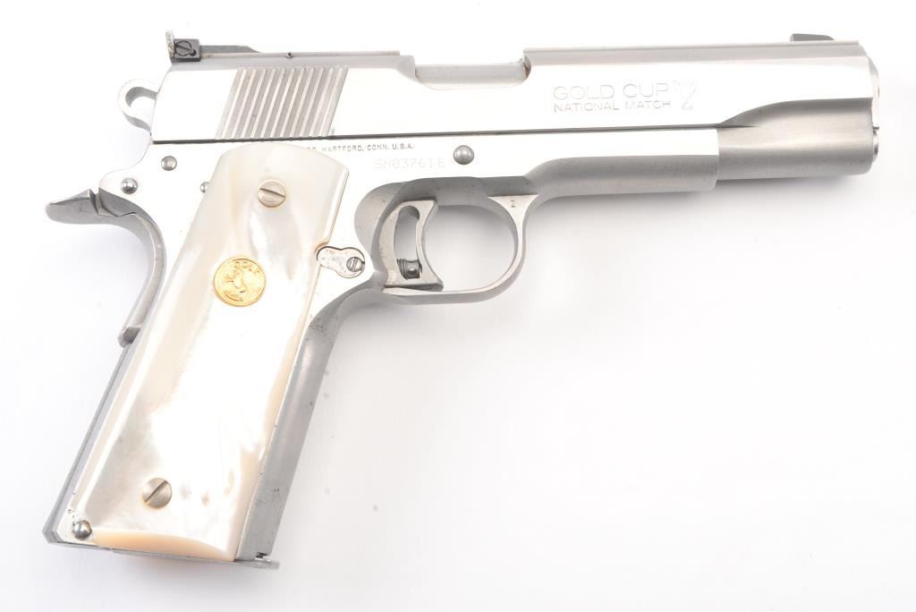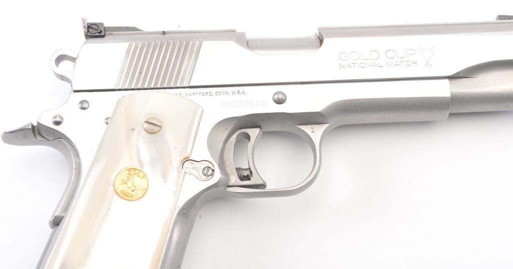 Colt Series 80 MK. IV Gold Cup National Match semi-automatic pistol, .45 ACP caliber, Serial #SN03761E. The pistol is in fine overall condition with a 5” barrel with a blade front and adjustable Elliason rearsights. The pistol retains approximately 94%-96% of the stainless steel finish with small scratches and light surface erosion on the front strap. The smooth Pearlite medallion grips are in very good condition.The pistol comes in the factory wood grain cardboard box with all associated packaging materials, manual and two correct magazines. The action is crisp, the markings are sharp and the bore is good on this desirable Series 80 Gold Cup. Est.: $1,200-$2,400. (Modern/PPT).