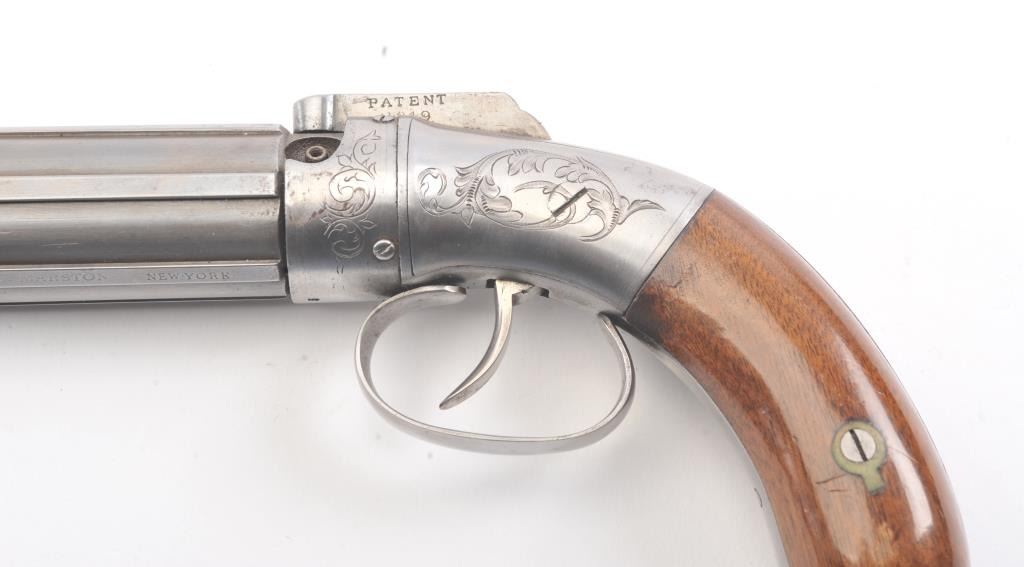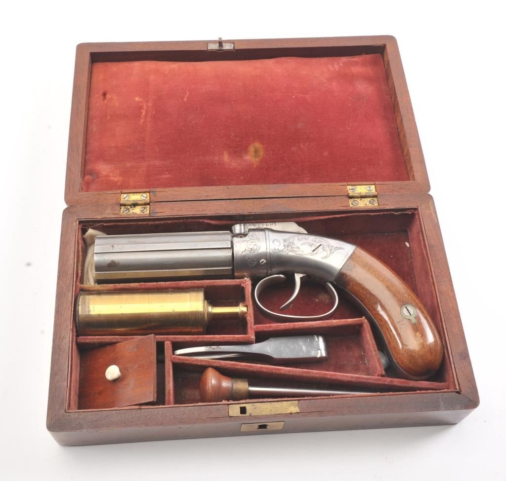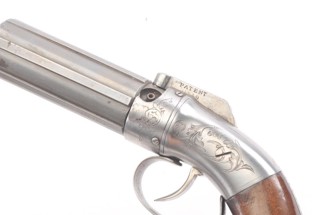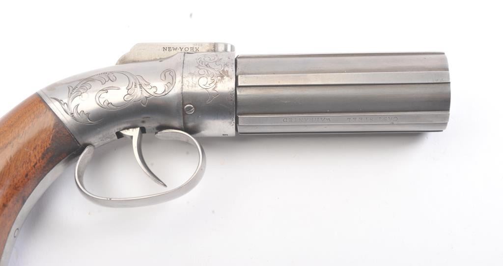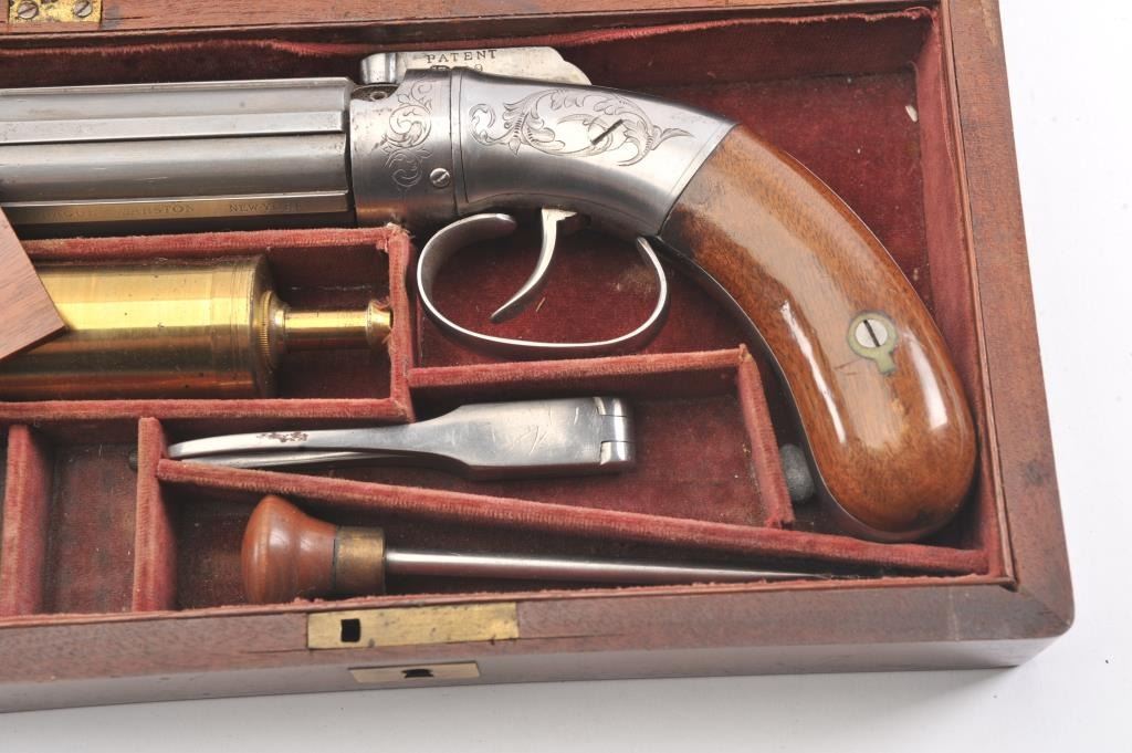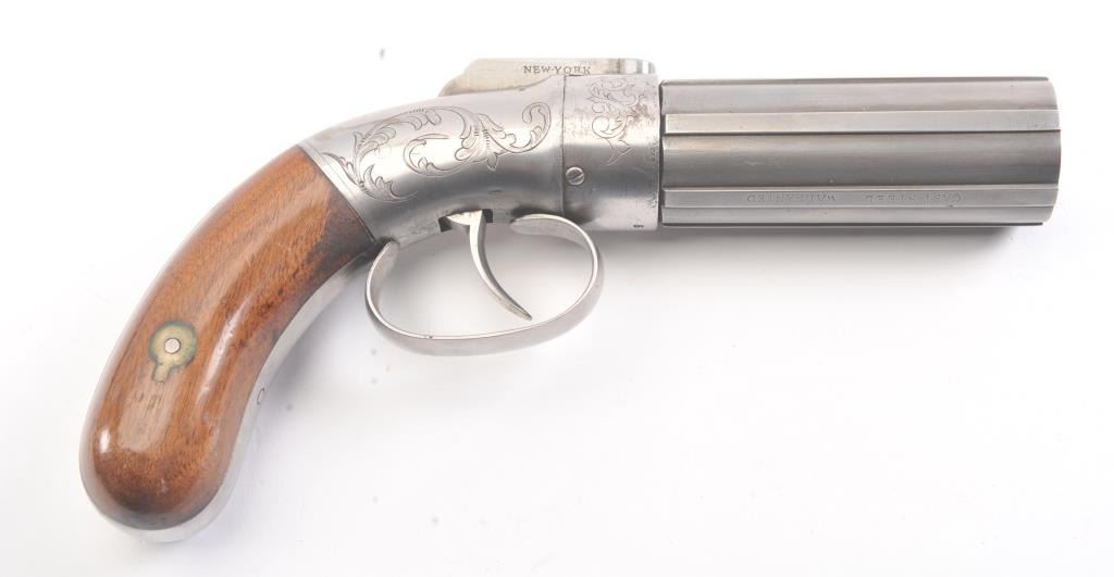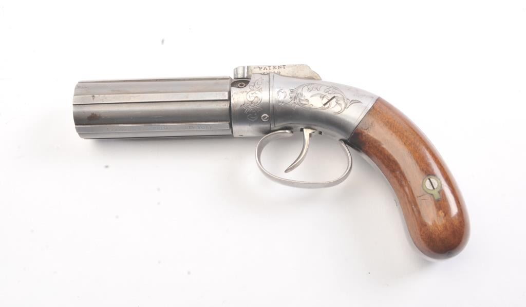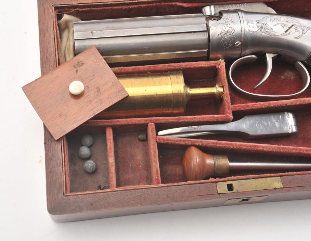 6 shot cased American pepperbox with bar hammer marked "Patent 1849" and "New York" on the reverse. Probably Blunt and Syms. Measures 8 5/8" overall with a 3 1/2" barrel group of .31 caliber. Cleaned to gray metalwith sharp surfaces and good grips. Plunger flask, mold, and rod included. Original case is very good overall. Slightly different in size and grip shape possibly experimental or pre-production. (Antique) Est.: $1500-$3000