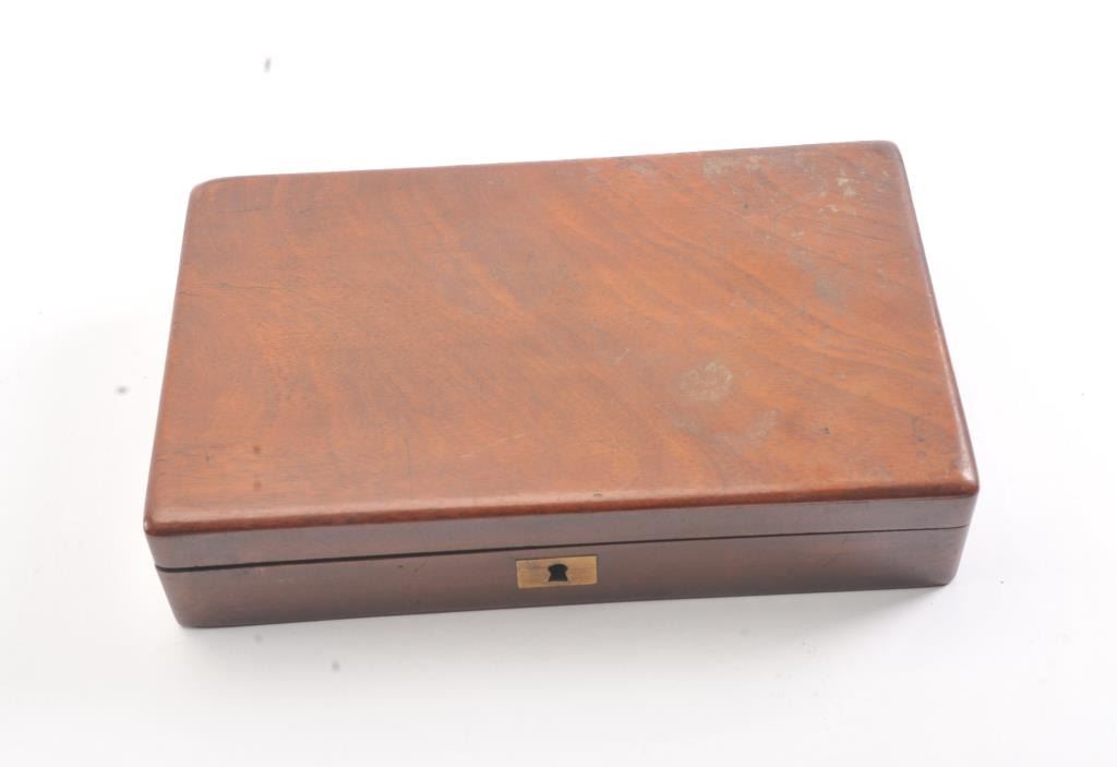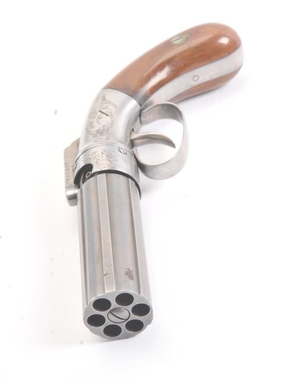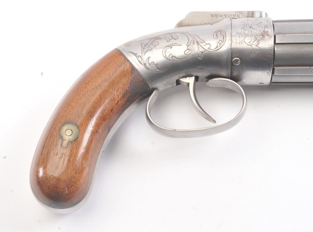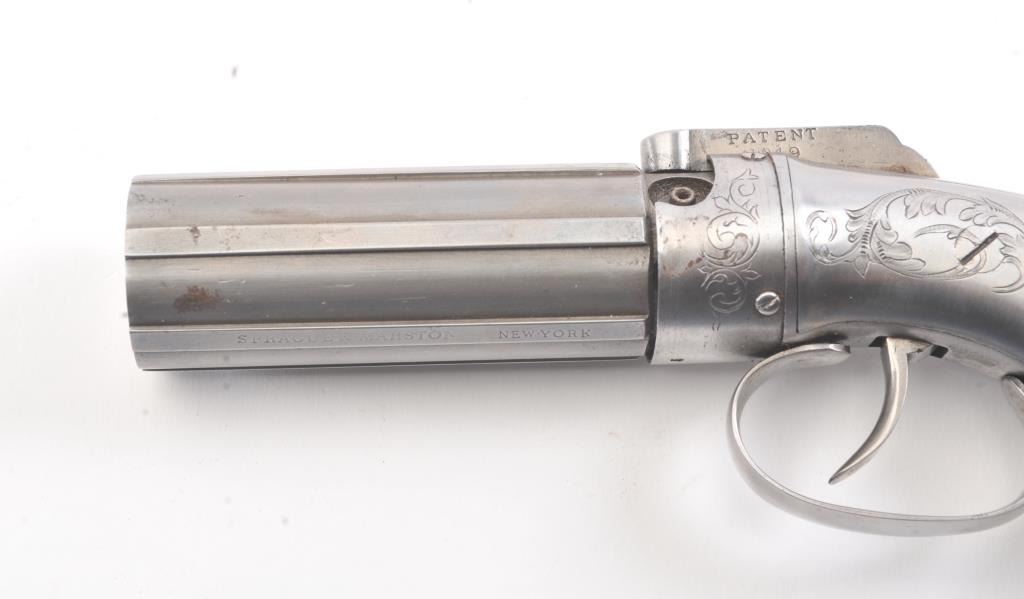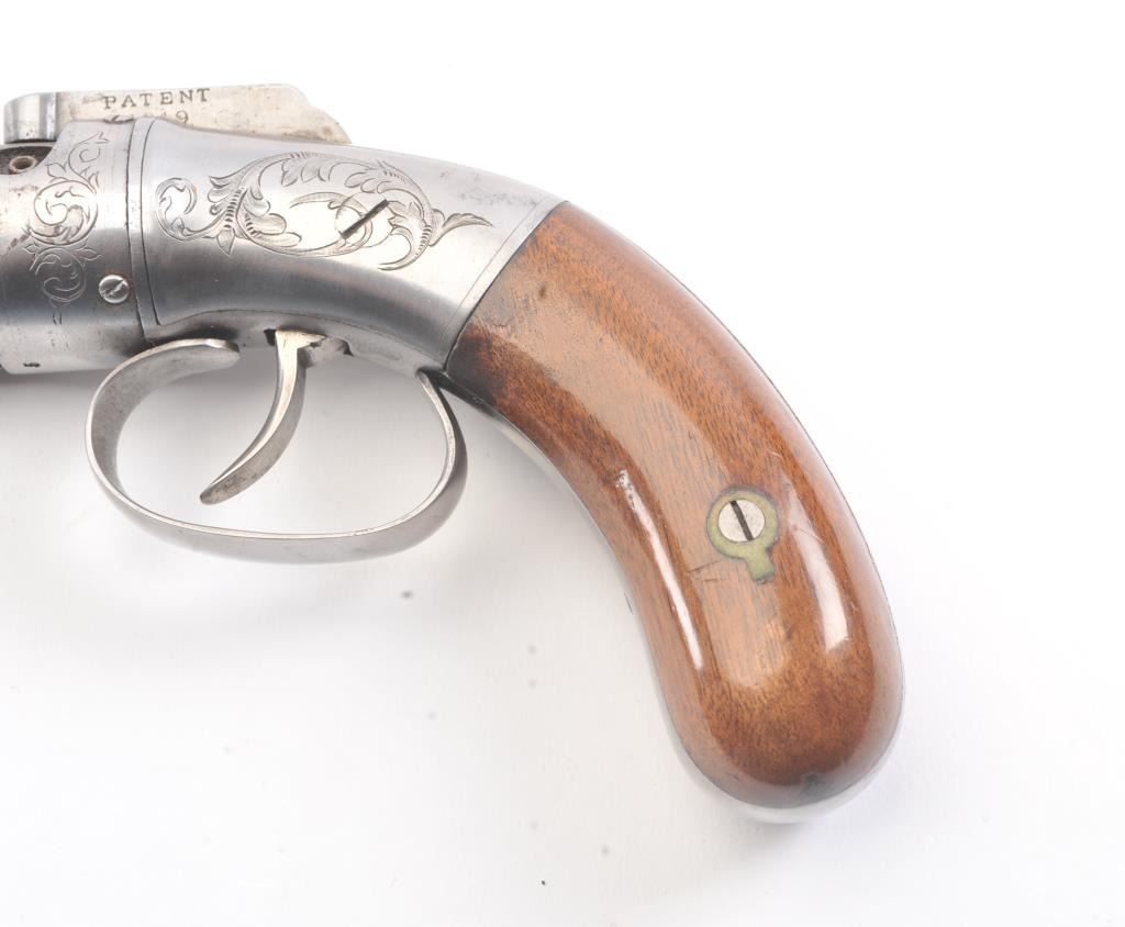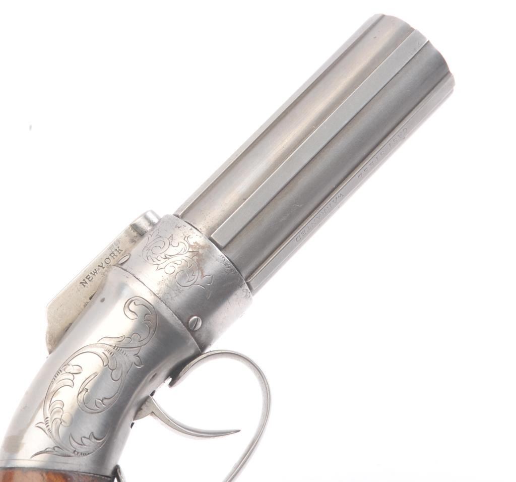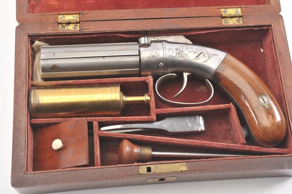 6 shot cased American pepperbox with bar hammer marked "Patent 1849" and "New York" on the reverse. Probably Blunt and Syms. Measures 8 5/8" overall with a 3 1/2" barrel group of .31 caliber. Cleaned to gray metalwith sharp surfaces and good grips. Plunger flask, mold, and rod included. Original case is very good overall. Slightly different in size and grip shape possibly experimental or pre-production. (Antique) Est.: $1500-$3000