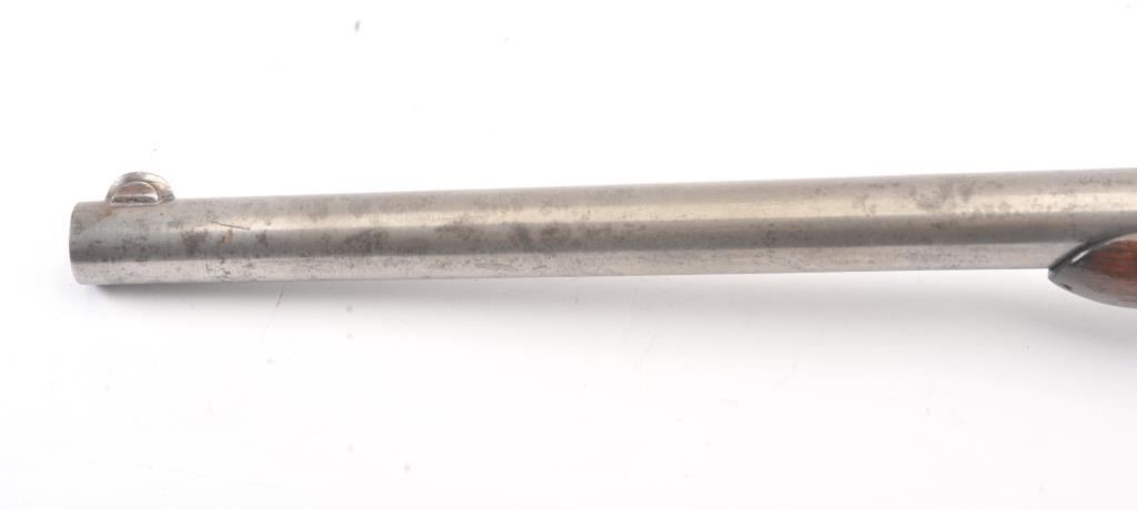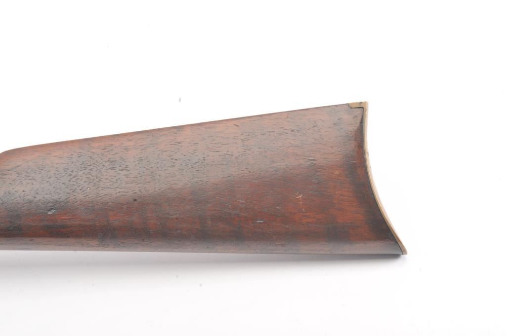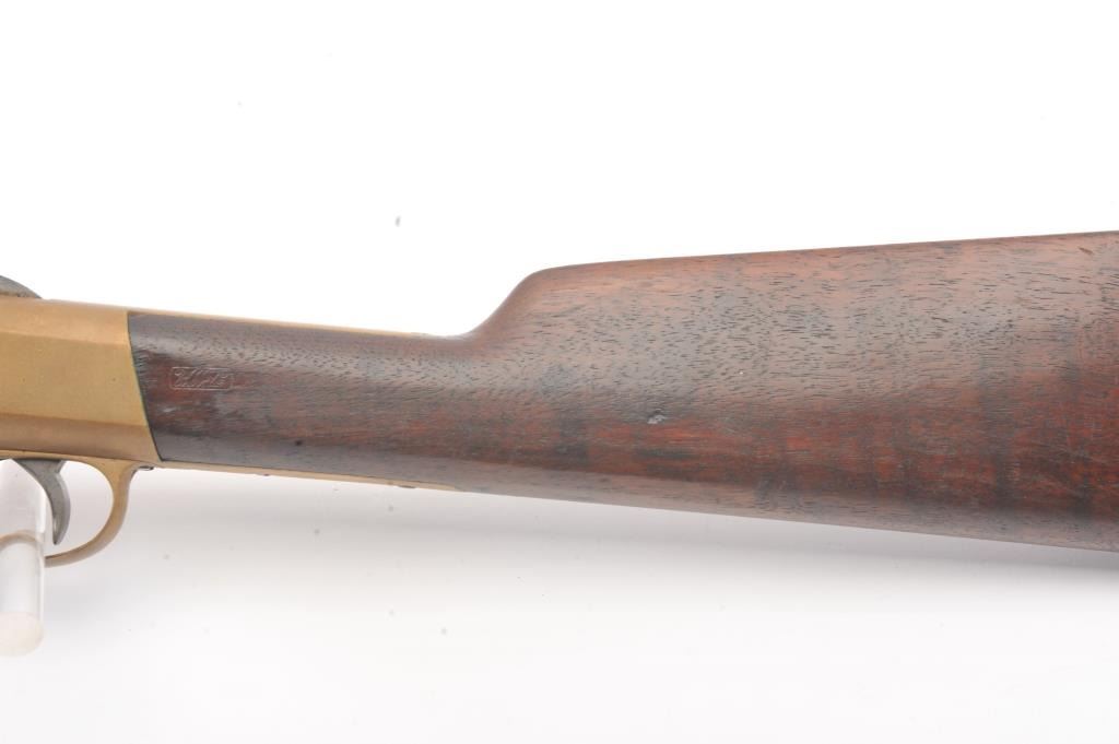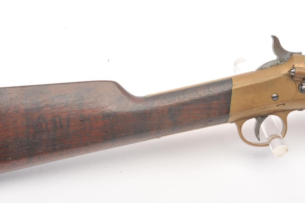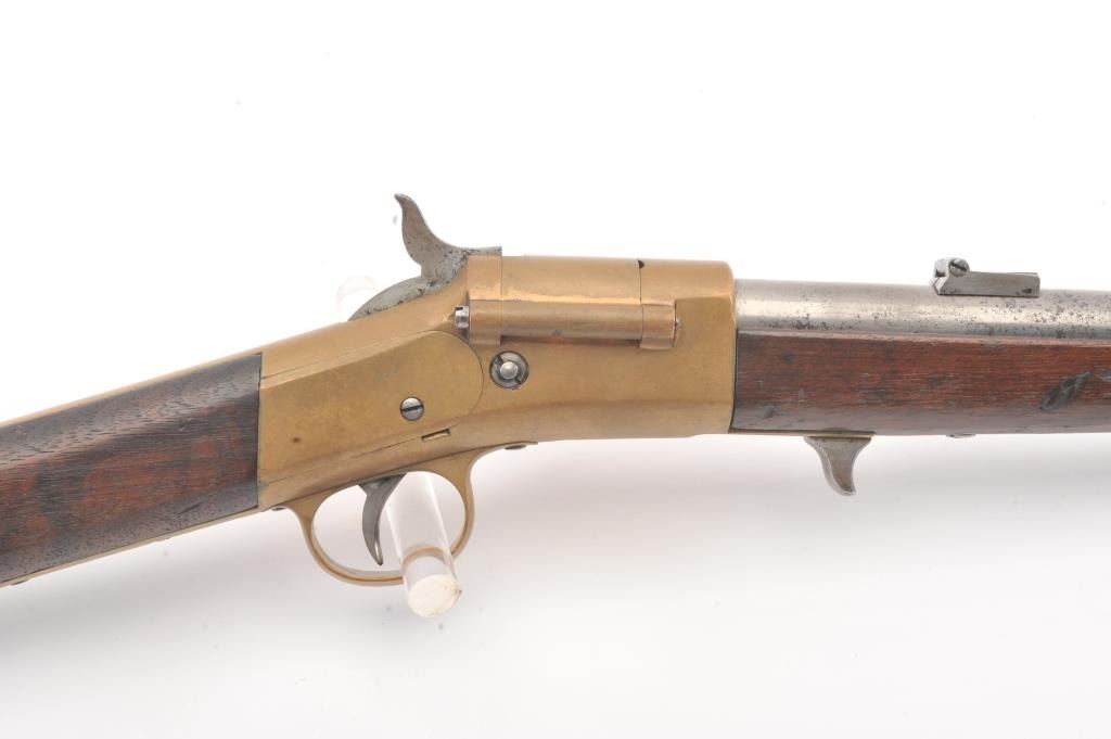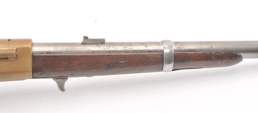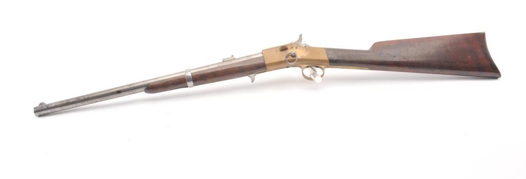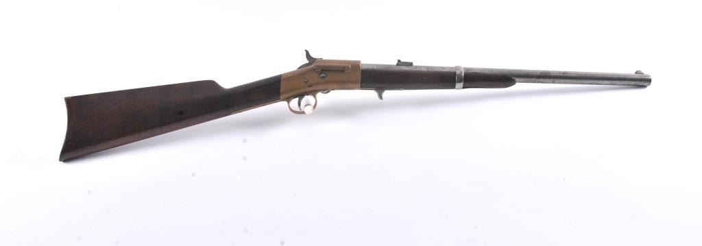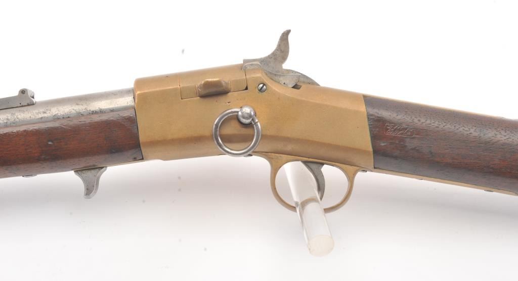 Warner Patent .50 caliber brass frame Civil War era carbine made 1864 and 1 of only 1500 produced. Marked James Warner on the left side below the breech. (Refer Flayderman 9B-102). The frame marking is light and only"L" stamp on the bottom of the frame. "E.P.P." stamped in fore end in front of the ejector. Very good overall with bright metal barrel showing minor pitting. Frame crisp with light cleaning. Very good plus stocks.Good action. (Antique) Est.: $1400-$2800