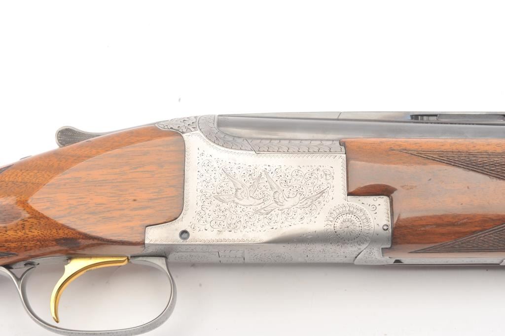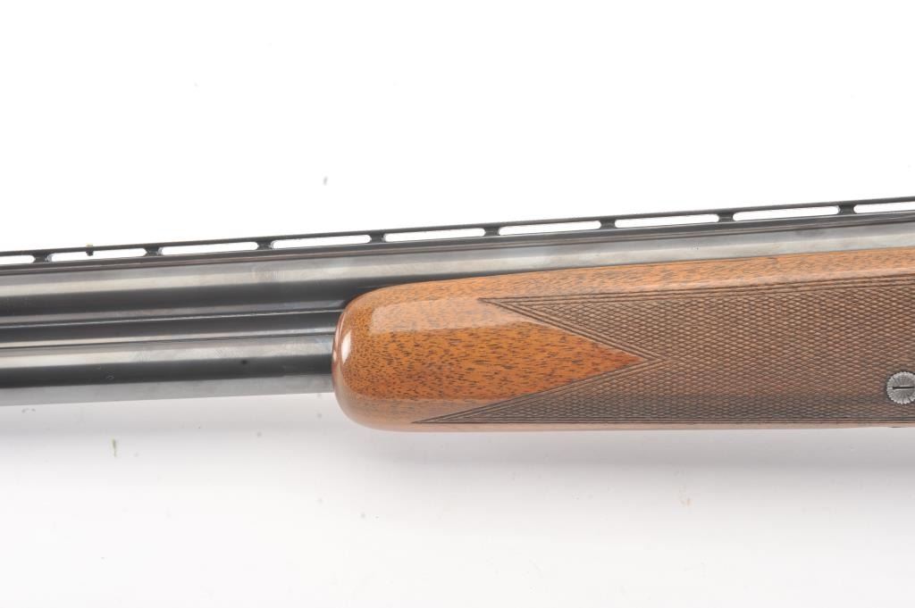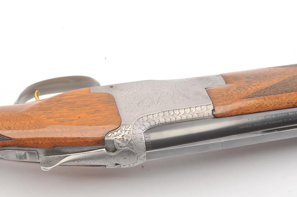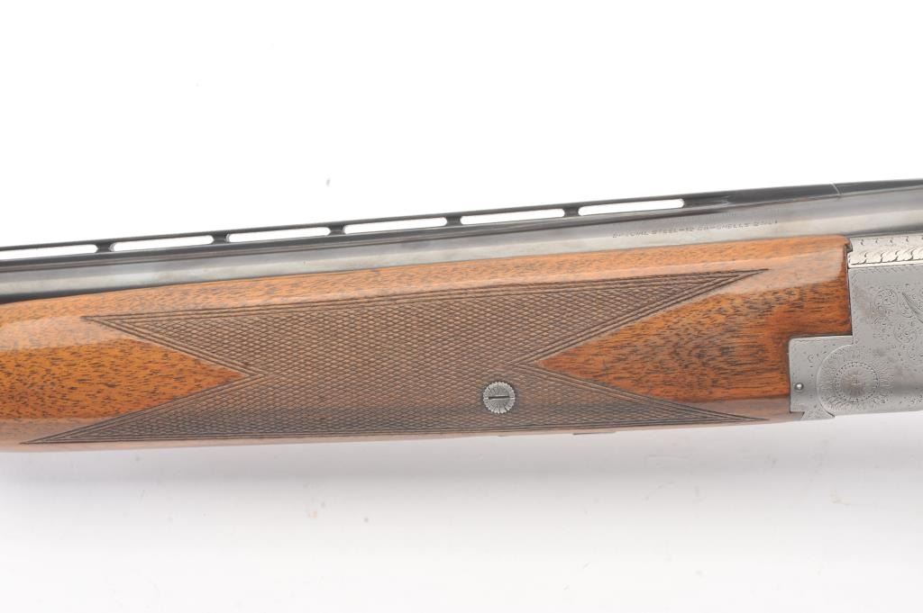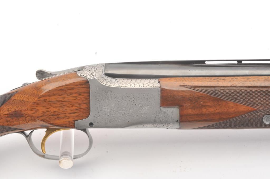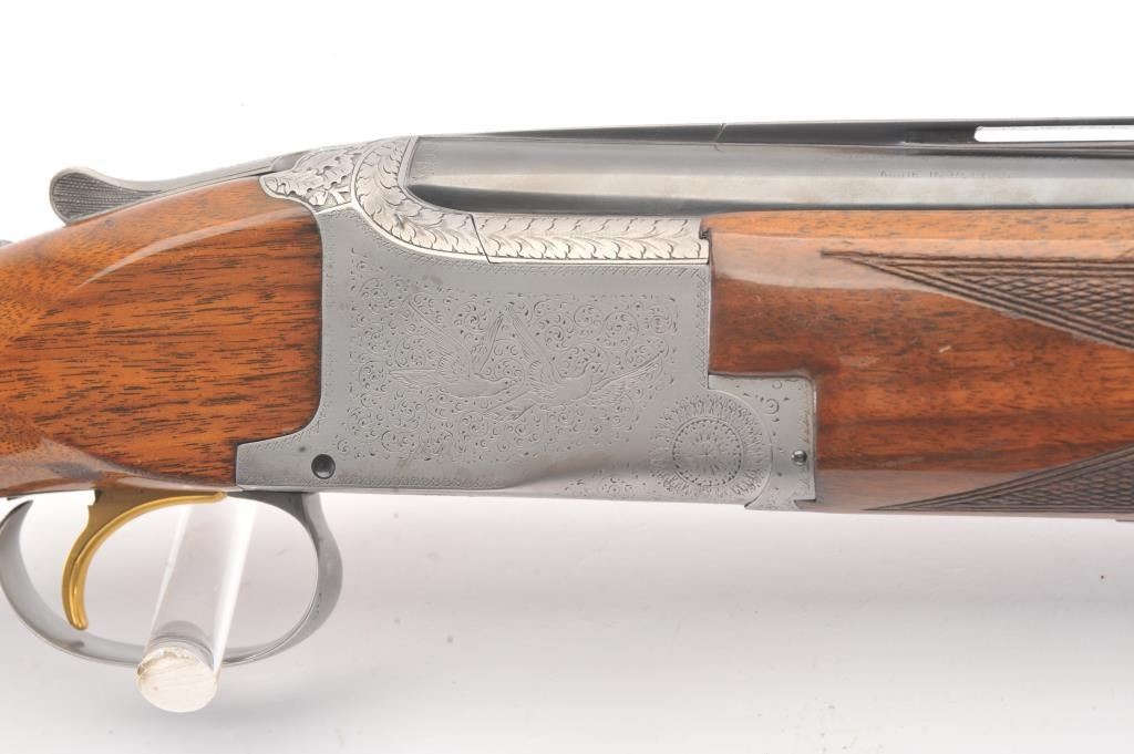 Browning Pigeon Grade Superposed Over/Under shotgun, 12 gauge, Serial #22424. The shotgun is in nearly excellent overall condition with 30” barrels with a full-length ventilated rib choked Full over Full. Thebarrels retain approximately 95%-97% of the blue finish with light wear at the muzzles. The receiver is French Grey with engraved scroll, dove motifs and engraved screw heads. The safety is in the tang with a singlegold selector trigger. The finely checkered Walnut stock is in very good condition with a round knob pistol grip. The butt stock has had the comb added ends with a Griggs Recoil Redirector (missing the pad) which provides a 14 ¼” LOP. The bores are good, the action is crisp and the markings are sharp on this desirable Browning. Est.: $1750-$3,500. (Modern).