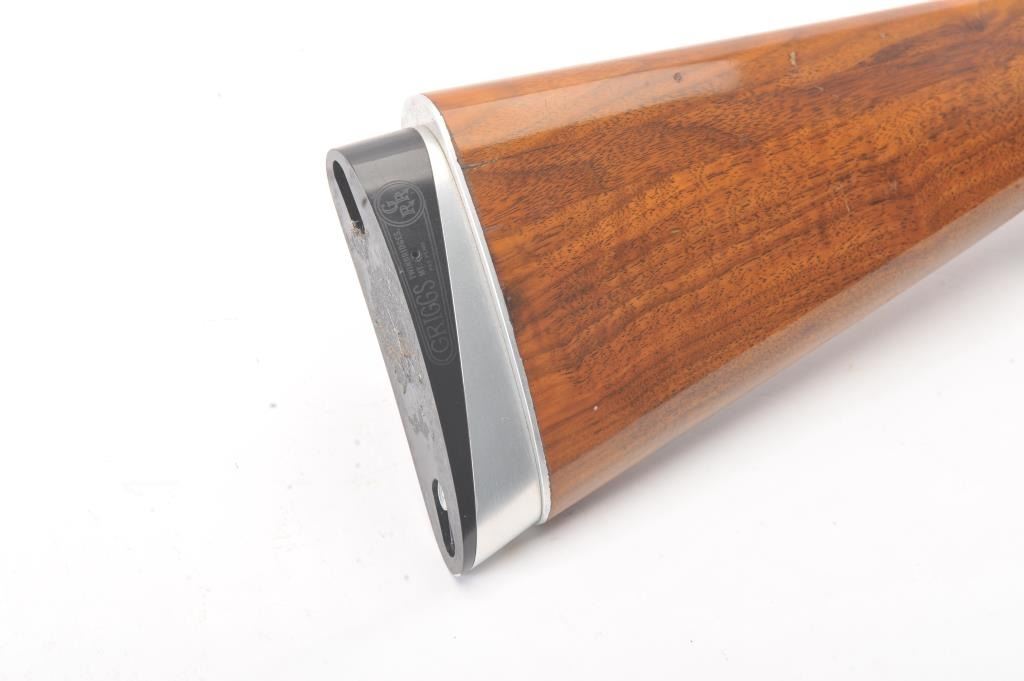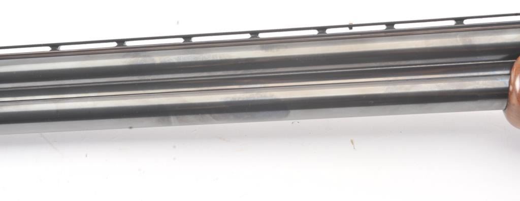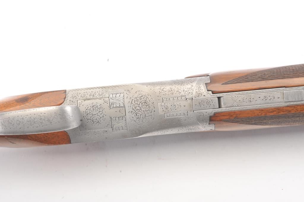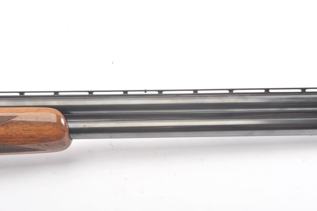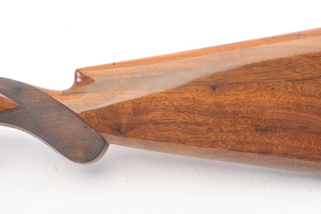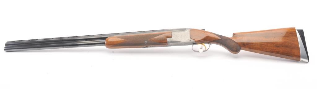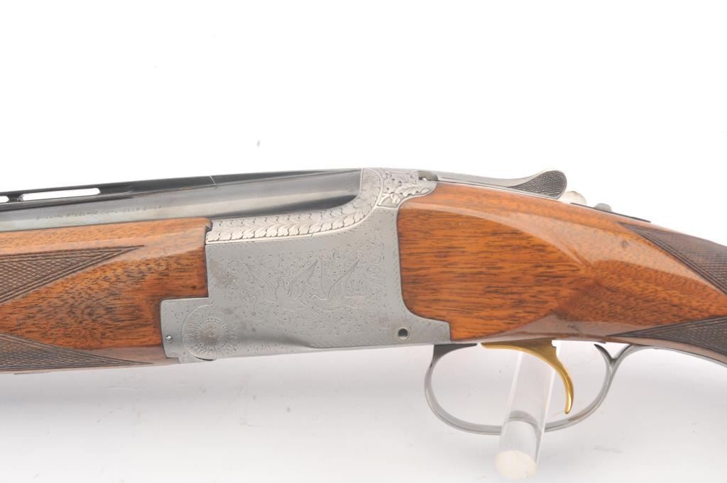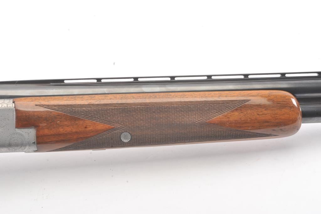 Browning Pigeon Grade Superposed Over/Under shotgun, 12 gauge, Serial #22424. The shotgun is in nearly excellent overall condition with 30” barrels with a full-length ventilated rib choked Full over Full. Thebarrels retain approximately 95%-97% of the blue finish with light wear at the muzzles. The receiver is French Grey with engraved scroll, dove motifs and engraved screw heads. The safety is in the tang with a singlegold selector trigger. The finely checkered Walnut stock is in very good condition with a round knob pistol grip. The butt stock has had the comb added ends with a Griggs Recoil Redirector (missing the pad) which provides a 14 ¼” LOP. The bores are good, the action is crisp and the markings are sharp on this desirable Browning. Est.: $1750-$3,500. (Modern).