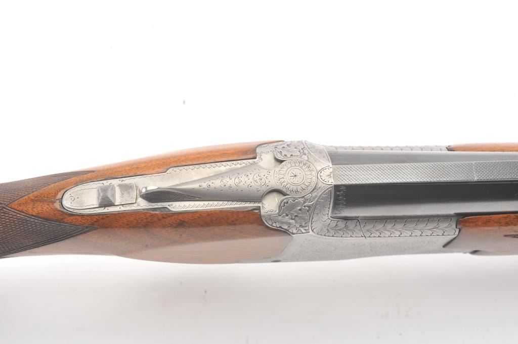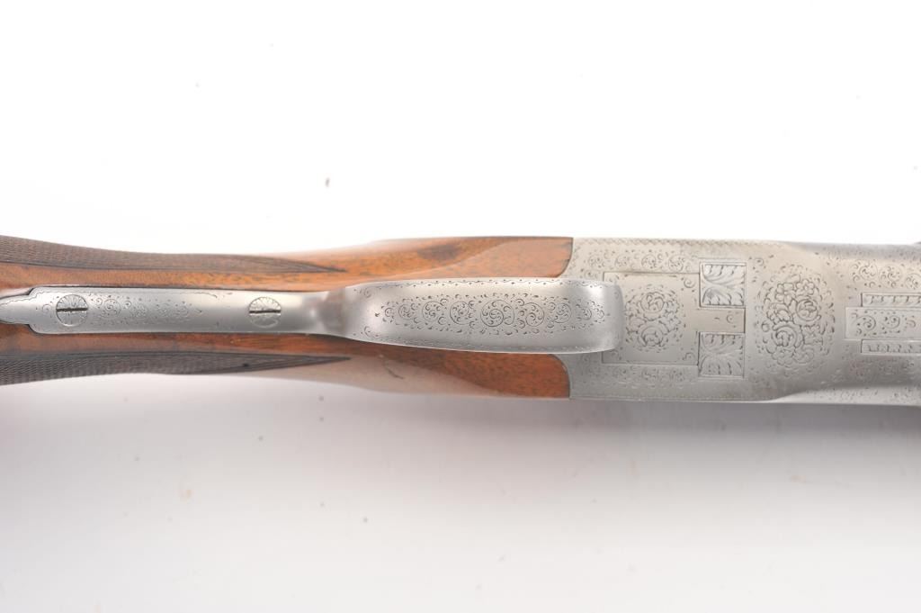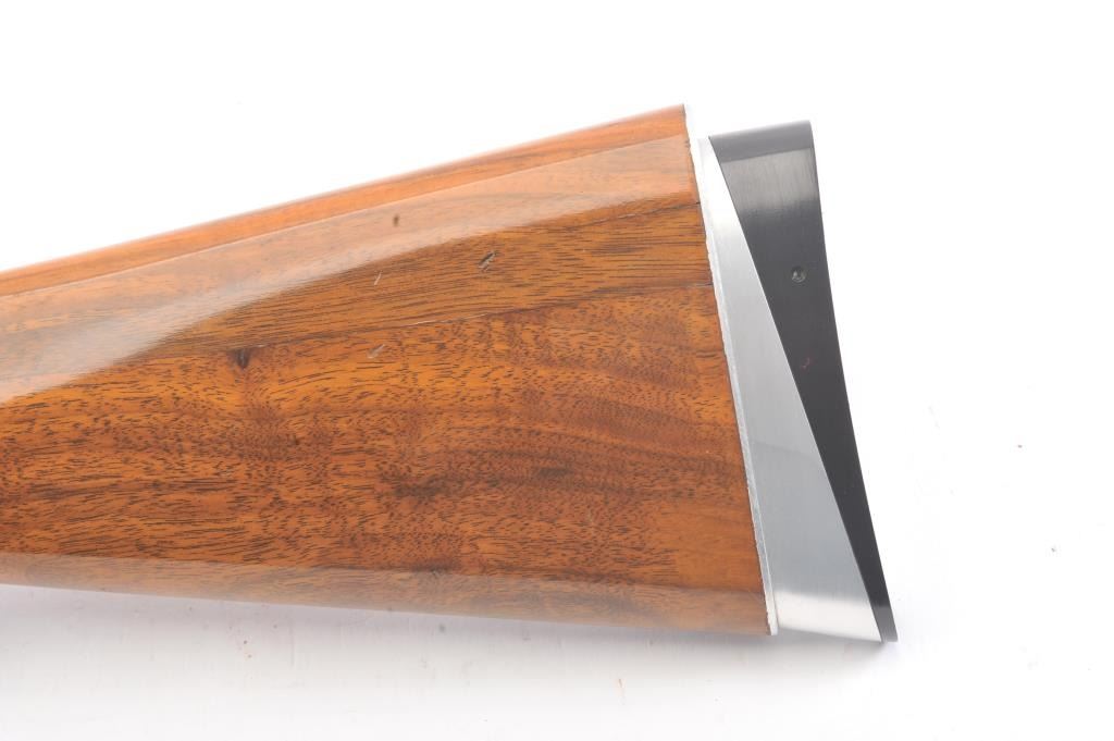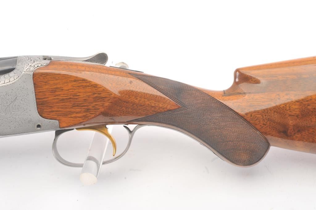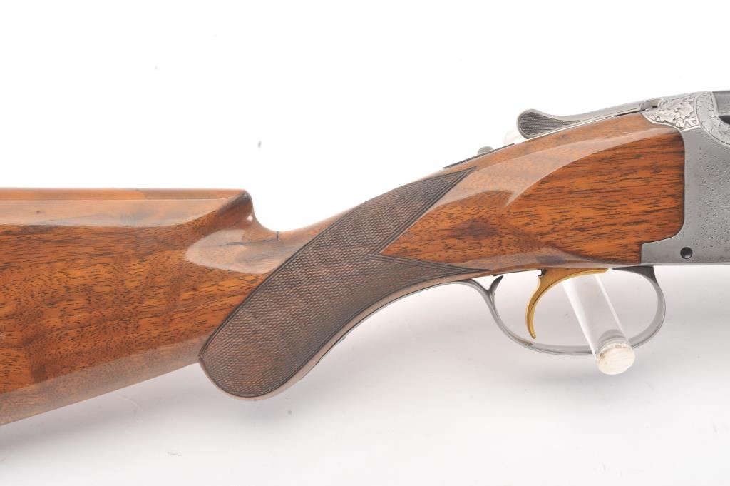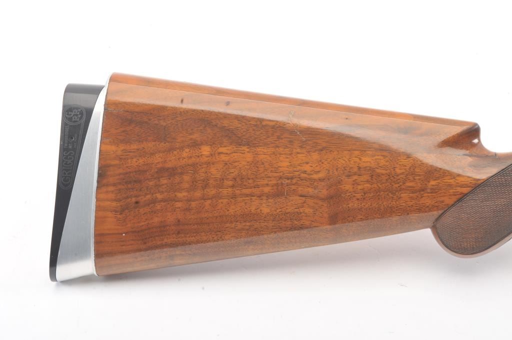Browning Pigeon Grade Superposed Over/Under shotgun, 12 gauge, Serial #22424. The shotgun is in nearly excellent overall condition with 30” barrels with a full-length ventilated rib choked Full over Full. Thebarrels retain approximately 95%-97% of the blue finish with light wear at the muzzles. The receiver is French Grey with engraved scroll, dove motifs and engraved screw heads. The safety is in the tang with a singlegold selector trigger. The finely checkered Walnut stock is in very good condition with a round knob pistol grip. The butt stock has had the comb added ends with a Griggs Recoil Redirector (missing the pad) which provides a 14 ¼” LOP. The bores are good, the action is crisp and the markings are sharp on this desirable Browning. Est.: $1750-$3,500. (Modern).