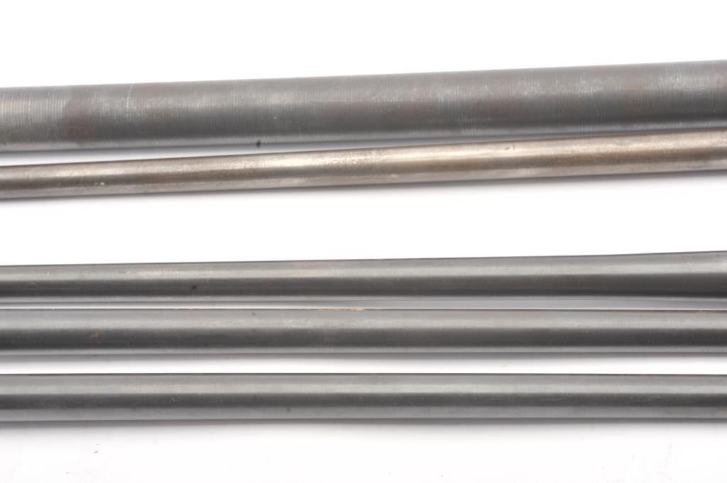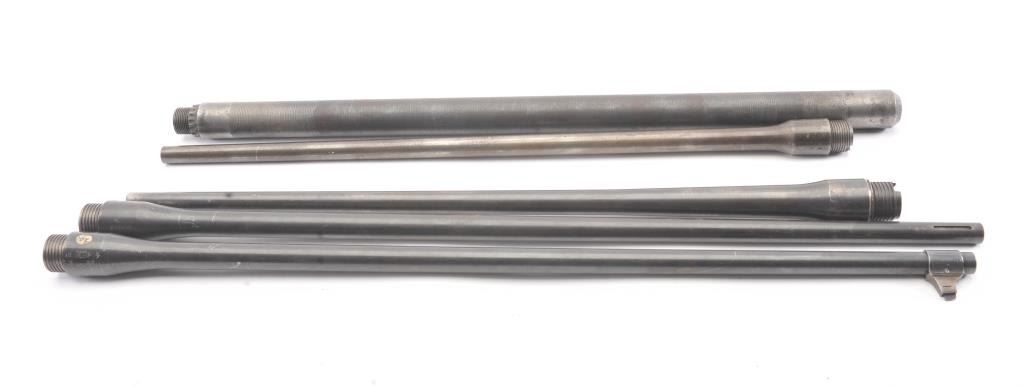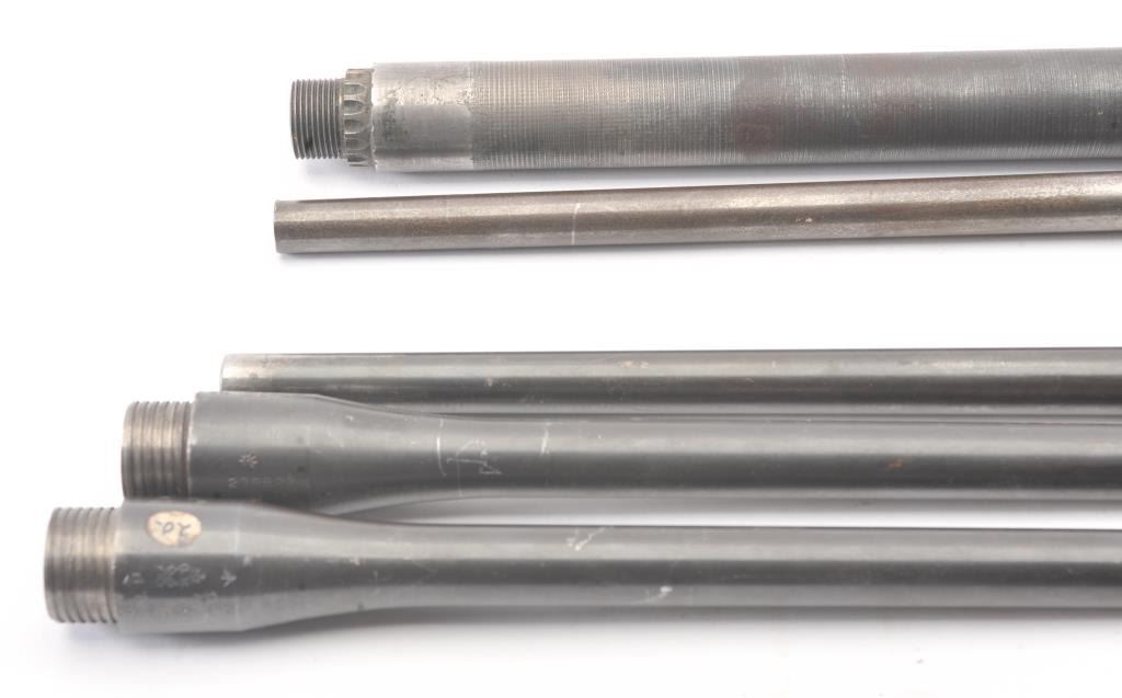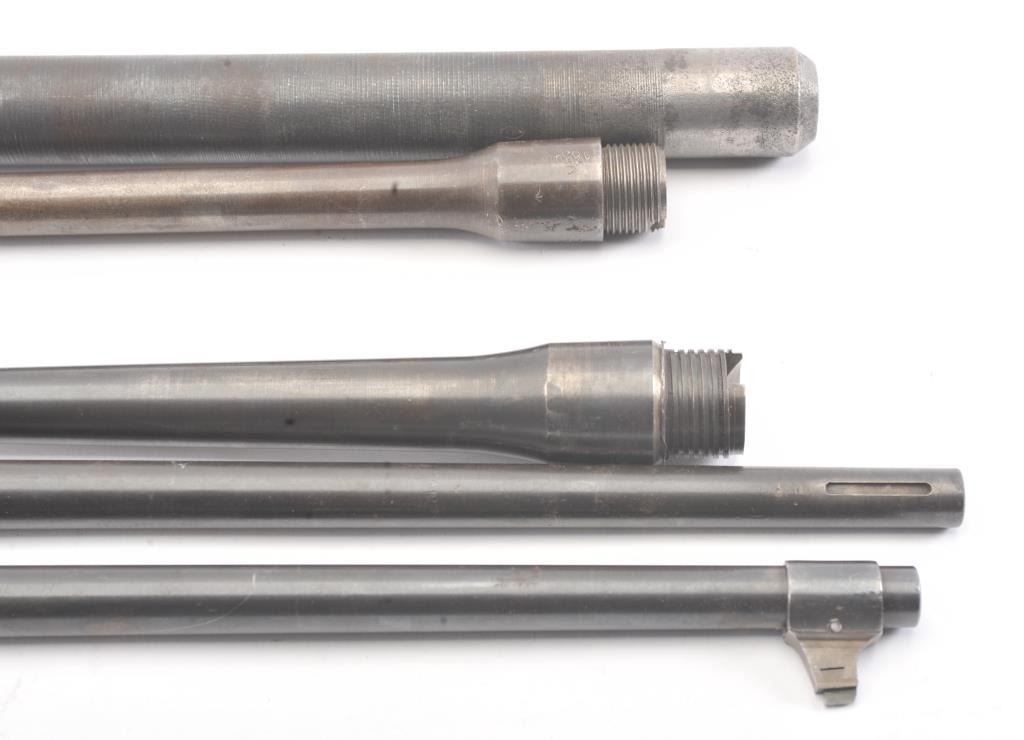 Lot of rifle and machine gun barrels. 1. .308 Norma mag English proofed commercial barrel, S/N 500227. Very good condition. The front sight looks like vintage bolt rifle for Mauser large ring action. Very good overall. 1950s-60s 2. Matching to above not caliber marked 3. .30 caliber machine gun barrel. Fair (Browning type) 4. 3 Enfield barrels partially sporterized.Fair to good. No sights. Est.: $150-$300